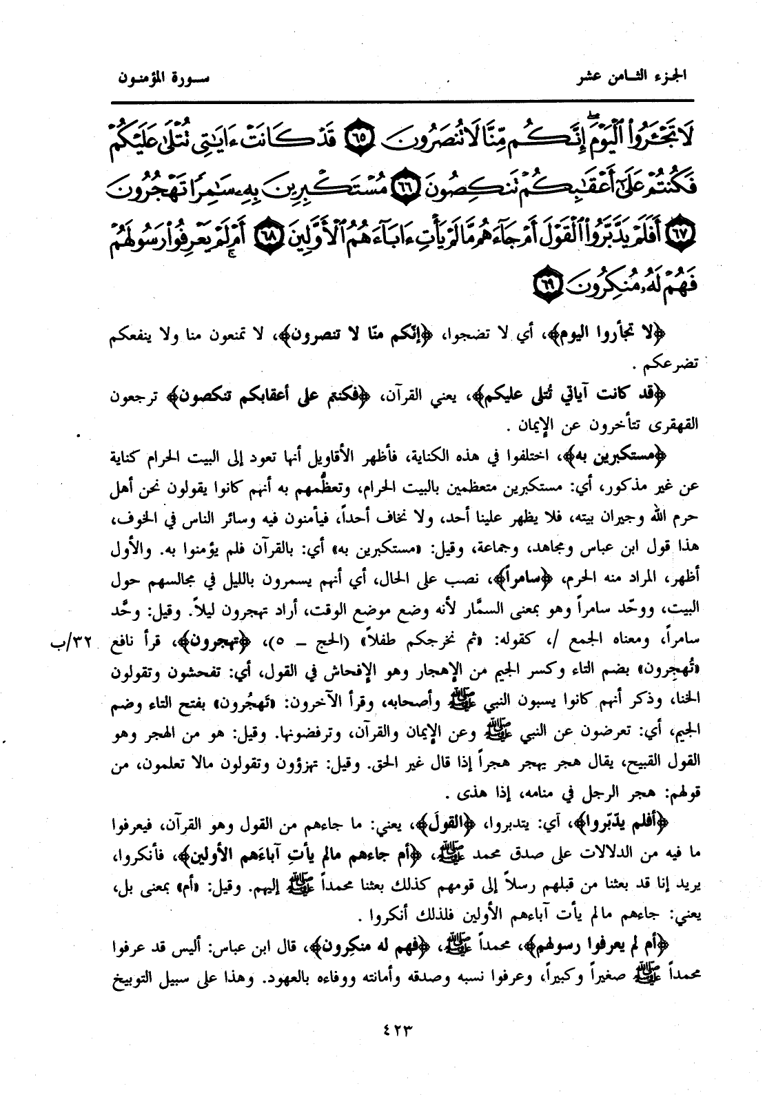 {لَا تَجْأَرُوا الْيَوْمَ} أَيْ لَا تَضِجُّوا، {إِنَّكُمْ مِنَّا لَا تُنْصَرُونَ} لَا تُمْنَعُونَ مَنَّا وَلَا يَنْفَعُكُمْ تَضَرُّعُكُمْ. {قَدْ كَانَتْ آيَاتِي تُتْلَى عَلَيْكُمْ} يَعْنِي الْقُرْآنَ، {فَكُنْتُمْ عَلَى أَعْقَابِكُمْ تَنْكِصُونَ} تَرْجِعُونَ الْقَهْقَرَى تَتَأَخَّرُونَ عَنِ الْإِيمَانِ. {مُسْتَكْبِرِينَ بِهِ} اخْتَلَفُوا فِي هَذِهِ الْكِنَايَةِ، فَأَظْهَرُ الْأَقَاوِيلِ أَنَّهَا تَعُودُ إِلَى الْبَيْتِ الْحَرَامِ كِنَايَةً عَنْ غَيْرِ مَذْكُورٍ، أَيْ: مُسْتَكْبِرِينَ مُتَعَظِّمِينَ بِالْبَيْتِ الْحَرَامِ، وَتَعَظُّمُهُمْ بِهِ أَنَّهُمْ كَانُوا يَقُولُونَ نَحْنُ أَهْلُ حَرَمِ اللَّهِ وَجِيرَانُ بَيْتِهِ، فَلَا يَظْهَرُ عَلَيْنَا أَحَدٌ، وَلَا نَخَافُ أَحَدًا، فَيَأْمَنُونَ فِيهِ وَسَائِرُ النَّاسِ فِي الْخَوْفِ، هَذَا قَوْلُ ابْنِ عَبَّاسٍ وَمُجَاهِدٍ، وَجَمَاعَةٍ، وَقِيلَ: "مُسْتَكْبِرِينَ بِهِ" أَيْ: بِالْقُرْآنِ فَلَمْ يُؤْمِنُوا بِهِ. وَالْأَوَّلُ أَظْهَرُ، الْمُرَادُ مِنْهُ الْحَرَمُ، {سَامِرًا} نُصِبَ عَلَى الْحَالِ، أَيْ أَنَّهُمْ يَسْمَرُونَ بِاللَّيْلِ فِي مَجَالِسِهِمْ حَوْلَ الْبَيْتِ، وَوَحَّدَ سَامِرًا وَهُوَ بِمَعْنَى السُّمَّارِ لِأَنَّهُ وُضِعَ مَوْضِعَ الْوَقْتِ، أَرَادَ تَهْجُرُونَ لَيْلًا. وَقِيلَ: وَحَّدَ سَامِرًا، ومعناه الجمع 32/ب كَقَوْلِهِ: "ثُمَّ نُخْرِجُكُمْ طِفْلًا" (الحَجِّ -5) ، {تَهْجُرُونَ} قَرَأَ نَافِعٌ "تُهْجِرُونَ" بِضَمِّ التَّاءِ وَكَسْرِ الْجِيمِ مِنَ الْإِهْجَارِ وَهُوَ الْإِفْحَاشُ فِي الْقَوْلِ، أَيْ: تُفْحِشُونَ وَتَقُولُونَ الْخَنَا، وَذَكَرَ أَنَّهُمْ كَانُوا يَسُبُّونَ النَّبِيَّ صَلَّى اللَّهُ عَلَيْهِ وَسَلَّمَ وَأَصْحَابَهُ، وَقَرَأَ الْآخَرُونَ: "تَهْجُرُونَ" بِفَتْحِ التَّاءِ وَضَمِّ الْجِيمِ، أَيْ: تُعْرِضُونَ عَنِ النَّبِيِّ صَلَّى اللَّهُ عَلَيْهِ وَسَلَّمَ وَعَنِ الْإِيمَانِ وَالْقُرْآنِ، وَتَرْفُضُونَهَا: وَقِيلَ: هُوَ مِنَ الْهَجْرِ وَهُوَ الْقَوْلُ الْقَبِيحُ، يُقَالُ هَجَرَ يَهْجُرُ هَجْرًا إِذَا قَالَ غَيْرَ الْحَقِّ. وَقِيلَ +تَهْزَئُونَ وَتَقُولُونَ مَا لَا تَعْلَمُونَ، مِنْ قَوْلِهِمْ: هَجَرَ الرَّجُلُ فِي مَنَامِهِ إِذَا هَذَى. {أَفَلَمْ يَدَّبَّرُوا} أَيْ: يَتَدَبَّرُوا، {الْقَوْلَ} يَعْنِي: مَا جَاءَهُمْ مِنَ الْقَوْلِ وَهُوَ الْقُرْآنُ، فَيَعْرِفُوا مَا فِيهِ مِنَ الدَّلَالَاتِ عَلَى صِدْقِ مُحَمَّدٍ صَلَّى اللَّهُ عَلَيْهِ وَسَلَّمَ، {أَمْ جَاءَهُمْ مَا لَمْ يَأْتِ آبَاءَهُمُ الْأَوَّلِينَ} فَأَنْكَرُوا، يُرِيدُ إِنَّا قَدْ بَعَثْنَا مِنْ قَبْلِهِمْ رُسُلًا إِلَى قَوْمِهِمْ كَذَلِكَ بَعَثْنَا مُحَمَّدًا صَلَّى اللَّهُ عَلَيْهِ وَسَلَّمَ إِلَيْهِمْ. وَقِيلَ: "أَمْ" بِمَعْنَى بَلْ، يَعْنِي: جَاءَهُمْ مَا لَمْ يَأْتِ آبَاءَهُمُ الْأَوَّلِينَ فَلِذَلِكَ أَنْكَرُوا. {أَمْ لَمْ يَعْرِفُوا رَسُولَهُمْ} مُحَمَّدًا صَلَّى اللَّهُ عَلَيْهِ وَسَلَّمَ، {فَهُمْ لَهُ مُنْكِرُونَ} قَالَ ابْنُ عَبَّاسٍ: أَلَيْسَ قَدْ عَرَفُوا مُحَمَّدًا صَلَّى اللَّهُ عَلَيْهِ وَسَلَّمَ صَغِيرًا وَكَبِيرًا، وَعَرَفُوا نَسَبَهُ وَصِدْقَهُ وَأَمَانَتَهُ وَوَفَاءَهُ بِالْعُهُودِ. وَهَذَا عَلَى سَبِيلِ التَّوْبِيخِ