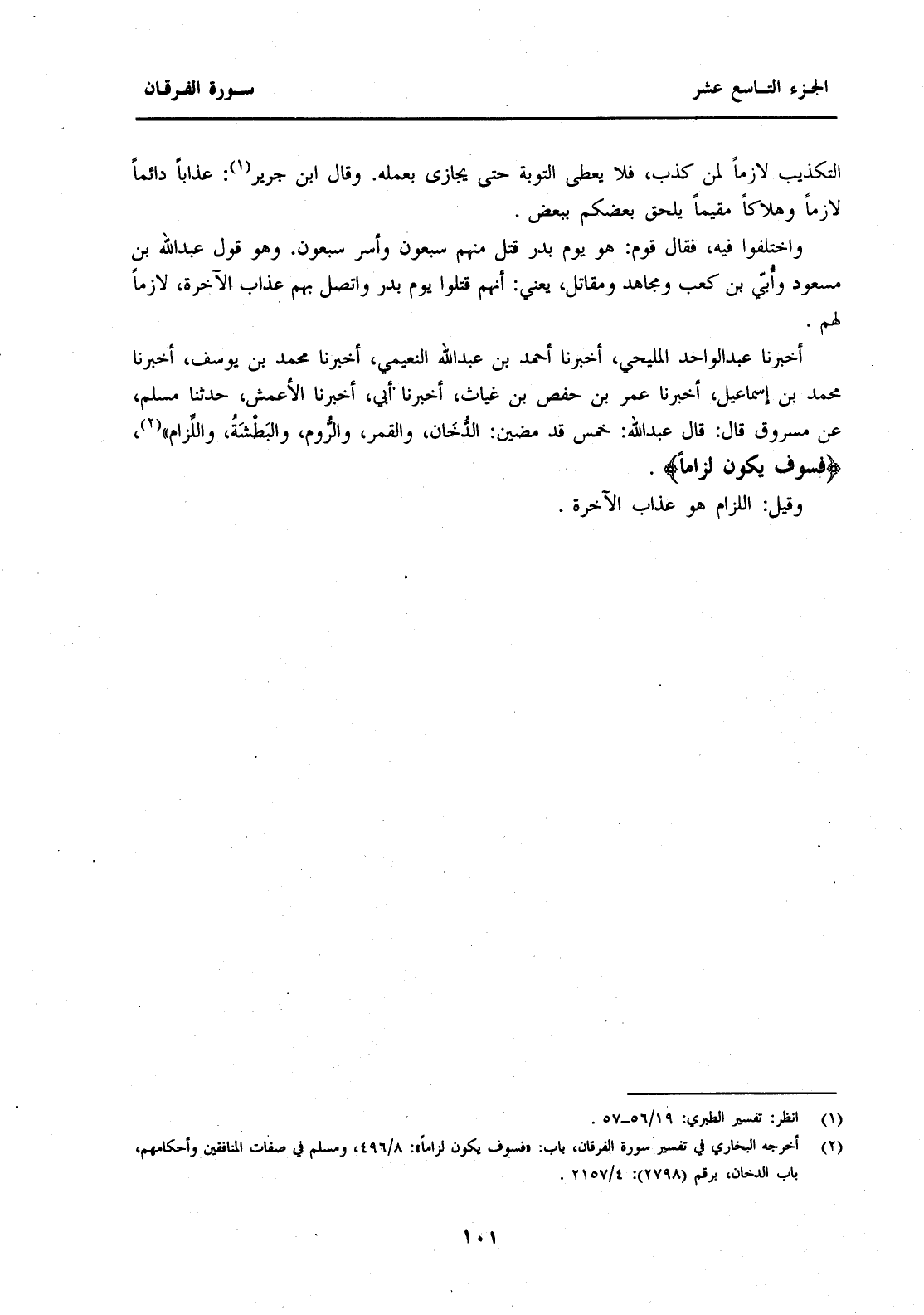 (2) أخرجه البخاري في تفسير سورة الفرقان، باب: "فسوف يكون لزاما": 8 / 496، ومسلم في صفات المنافقين وأحكامهم، باب الدخان، برقم (2798) : 4 / 2157.