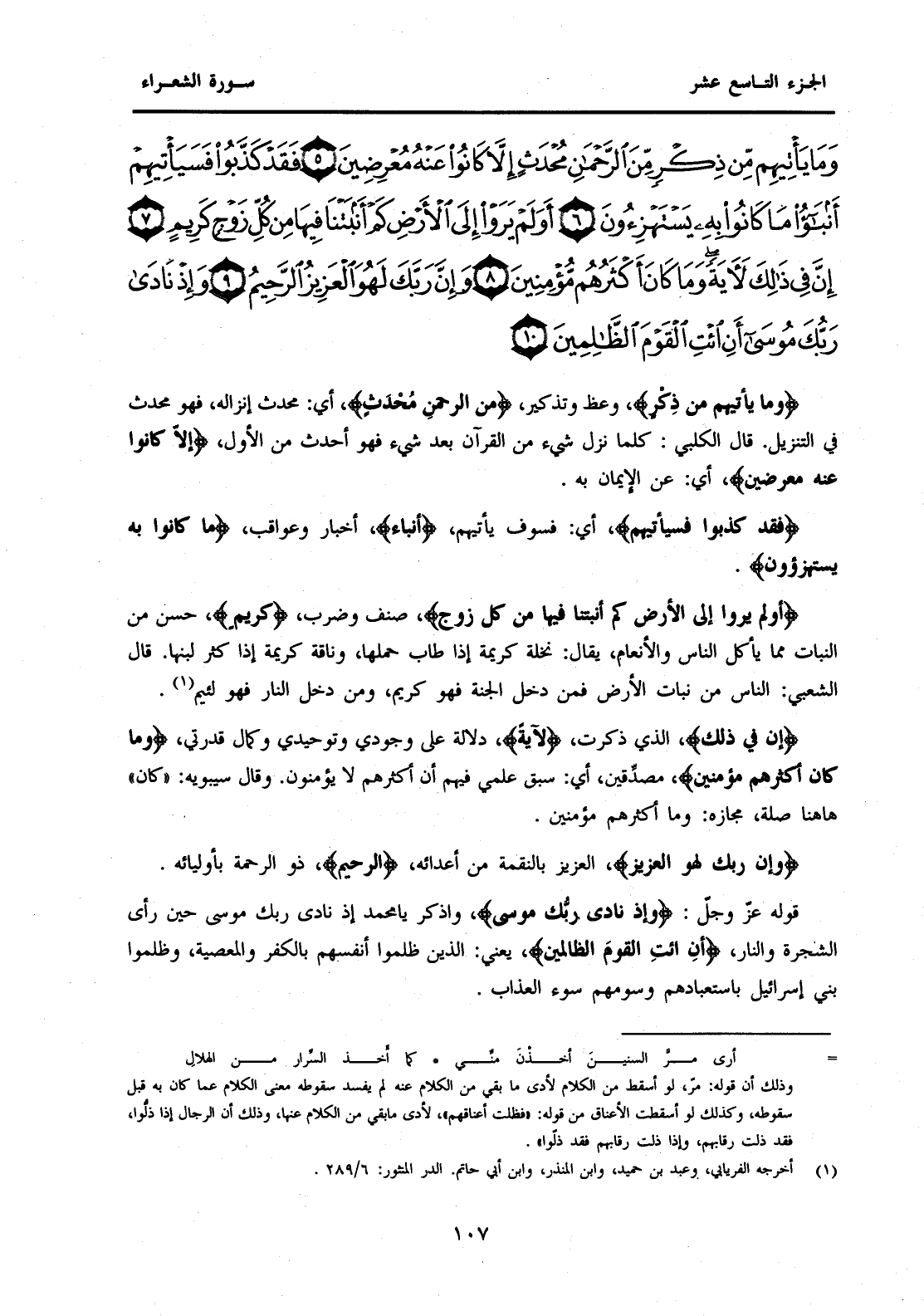 {وَمَا يَأْتِيهِمْ مِنْ ذِكْرٍ} وَعْظٍ وَتَذْكِيرٍ، {مِنَ الرَّحْمَنِ مُحْدَثٍ} أَيْ: مُحْدَثٍ إِنْزَالُهُ، فَهُوَ مُحْدَثٌ فِي التَّنْزِيلِ. قَالَ الْكَلْبِيُّ: كُلَّمَا نَزَلَ شَيْءٌ مِنَ الْقُرْآنِ بَعْدَ شَيْءٍ فَهُوَ أَحْدَثُ مِنَ الْأَوَّلِ، {إِلَّا كَانُوا عَنْهُ مُعْرِضِينَ} أَيْ: عَنِ الْإِيمَانِ بِهِ. {فَقَدْ كَذَّبُوا فَسَيَأْتِيهِمْ} أَيْ: فَسَوْفَ يَأْتِيهِمْ، {أَنْبَاءُ} أَخْبَارُ وَعَوَاقِبُ، {مَا كَانُوا بِهِ يَسْتَهْزِئُونَ} {أَوَلَمْ يَرَوْا إِلَى الْأَرْضِ كَمْ أَنْبَتْنَا فِيهَا مِنْ كُلِّ زَوْجٍ} صِنْفٍ وَضَرْبٍ، {كَرِيمٍ} حَسَنٍ مِنَ النَّبَاتِ مِمَّا يَأْكُلُ النَّاسُ وَالْأَنْعَامُ، يُقَالُ: نَخْلَةٌ كَرِيمَةٌ إِذَا طَابَ حَمْلُهَا، وَنَاقَةٌ كَرِيمَةٌ إِذَا كَثُرَ لَبَنُهَا. قَالَ الشَّعْبِيُّ: النَّاسُ مِنْ نَبَاتِ الْأَرْضِ فَمَنْ دَخَلَ الْجَنَّةَ فَهُوَ كَرِيمٌ، وَمِنْ دَخَلَ النَّارَ فَهُوَ لَئِيمٌ (1) {إِنَّ فِي ذَلِكَ} الَّذِي ذَكَرْتُ، {لَآيَةً} دَلَالَةً عَلَى وُجُودِي وَتَوْحِيدِي وَكَمَالِ قُدْرَتِي، {وَمَا كَانَ أَكْثَرُهُمْ مُؤْمِنِينَ} مُصَدِّقِينَ، أَيْ: سَبْقَ عِلْمِي فِيهِمْ أَنَّ أَكْثَرَهُمْ لَا يُؤْمِنُونَ. وَقَالَ سِيبَوَيْهِ: "كَانَ" هَاهُنَا صِلَةٌ، مَجَازُهُ: وَمَا أَكْثَرُهُمْ مُؤْمِنِينَ. {وَإِنَّ رَبَّكَ لَهُوَ الْعَزِيزُ} الْعَزِيزُ بِالنِّقْمَةِ مِنْ أَعْدَائِهِ، {الرَّحِيمُ} ذُو الرَّحْمَةِ بِأَوْلِيَائِهِ. قَوْلُهُ عَزَّ وَجَلَّ: {وَإِذْ نَادَى رَبُّكَ مُوسَى} وَاذْكُرْ يَا مُحَمَّدُ إِذْ نَادَى رَبُّكَ مُوسَى حِينَ رَأَى الشَّجَرَةَ وَالنَّارَ، {أَنِ ائْتِ الْقَوْمَ الظَّالِمِينَ} يَعْنِي: الَّذِينَ ظَلَمُوا أَنْفُسَهُمْ بِالْكُفْرِ وَالْمَعْصِيَةِ، وَظَلَمُوا بَنِي إِسْرَائِيلَ بِاسْتِعْبَادِهِمْ وَسَوْمِهِمْ سُوءَ الْعَذَابِ.