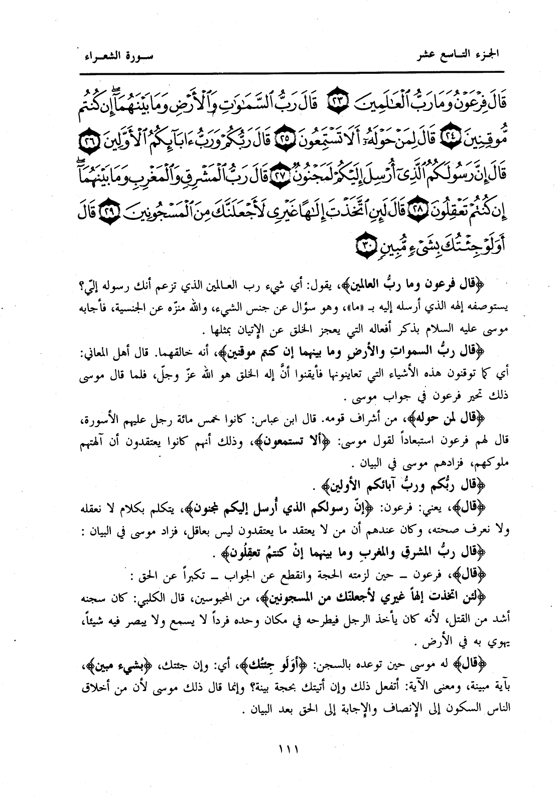 {قَالَ فِرْعَوْنُ وَمَا رَبُّ الْعَالَمِينَ (23) قَالَ رَبُّ السَّمَوَاتِ وَالْأَرْضِ وَمَا بَيْنَهُمَا إِنْ كُنْتُمْ مُوقِنِينَ (24) قَالَ لِمَنْ حَوْلَهُ أَلَا تَسْتَمِعُونَ (25) قَالَ رَبُّكُمْ وَرَبُّ آبَائِكُمُ الْأَوَّلِينَ (26) قَالَ إِنَّ رَسُولَكُمُ الَّذِي أُرْسِلَ إِلَيْكُمْ لَمَجْنُونٌ (27) قَالَ رَبُّ الْمَشْرِقِ وَالْمَغْرِبِ وَمَا بَيْنَهُمَا إِنْ كُنْتُمْ تَعْقِلُونَ (28) قَالَ لَئِنِ اتَّخَذْتَ إِلَهًا غَيْرِي لَأَجْعَلَنَّكَ مِنَ الْمَسْجُونِينَ (29) قَالَ أَوَلَوْ جِئْتُكَ بِشَيْءٍ مُبِينٍ (30) }