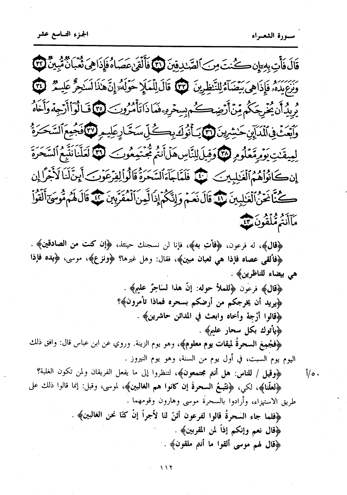{قَالَ} لَهُ فِرْعَوْنُ، {فَأْتِ بِهِ} فَإِنَّا لَنْ نَسْجُنَكَ حِينَئِذٍ، {إِنْ كُنْتَ مِنَ الصَّادِقِينَ} {فَأَلْقَى عَصَاهُ فَإِذَا هِيَ ثُعْبَانٌ مُبِينٌ} فَقَالَ: وَهَلْ غَيَّرَهَا؟. {وَنَزَعَ} مُوسَى، {يَدَهُ فَإِذَا هِيَ بَيْضَاءُ لِلنَّاظِرِينَ} {قَالَ} فِرْعَوْنُ {لِلْمَلَأِ حَوْلَهُ إِنَّ هَذَا لَسَاحِرٌ عَلِيمٌ} {يُرِيدُ أَنْ يُخْرِجَكُمْ مِنْ أَرْضِكِمْ بِسِحْرِهِ فَمَاذَا تَأْمُرُونَ} ؟ {قَالُوا أَرْجِهْ وَأَخَاهُ وَابْعَثْ فِي الْمَدَائِنِ حَاشِرِينَ} . {يَأْتُوكَ بِكُلِّ سَحَّارٍ عَلِيمٍ} . {فَجُمِعَ السَّحَرَةُ لِمِيقَاتِ يَوْمٍ مَعْلُومٍ} وَهُوَ يَوْمُ الزِّينَةِ. وَرُوِيَ عَنِ ابْنِ عَبَّاسٍ قَالَ: وَافَقَ ذَلِكَ الْيَوْمُ يَوْمَ السَّبْتِ، فِي أَوَّلِ يَوْمٍ مِنَ السَّنَةِ، وَهُوَ يَوْمُ النَّيْرُوزِ. {وَقِيلَ لِلنَّاسِ هَلْ أَنْتُمْ مُجْتَمِعُونَ} 50/ألِتَنْظُرُوا إِلَى مَا يَفْعَلُ الْفَرِيقَانِ وَلِمَنْ تَكُونُ الْغَلَبَةُ؟ {لَعَلَّنَا} لِكَيْ، {نَتَّبِعُ السَّحَرَةَ إِنْ كَانُوا هُمُ الْغَالِبِينَ} لِمُوسَى، وَقِيلَ: إِنَّمَا قَالُوا ذَلِكَ عَلَى طَرِيقِ الِاسْتِهْزَاءِ، وَأَرَادُوا بِالسَّحَرَةِ مُوسَى وَهَارُونَ وَقَوْمَهُمَا. {فَلَمَّا جَاءَ السَّحَرَةُ قَالُوا لِفِرْعَوْنَ أَئِنَّ لَنَا لَأَجْرًا إِنْ كُنَّا نَحْنُ الْغَالِبِينَ} . {قَالَ نَعَمْ وَإِنَّكُمْ إِذًا لَمِنَ الْمُقَرَّبِينَ} . {قَالَ لَهُمْ مُوسَى أَلْقُوا مَا أَنْتُمْ مُلْقُونَ} .