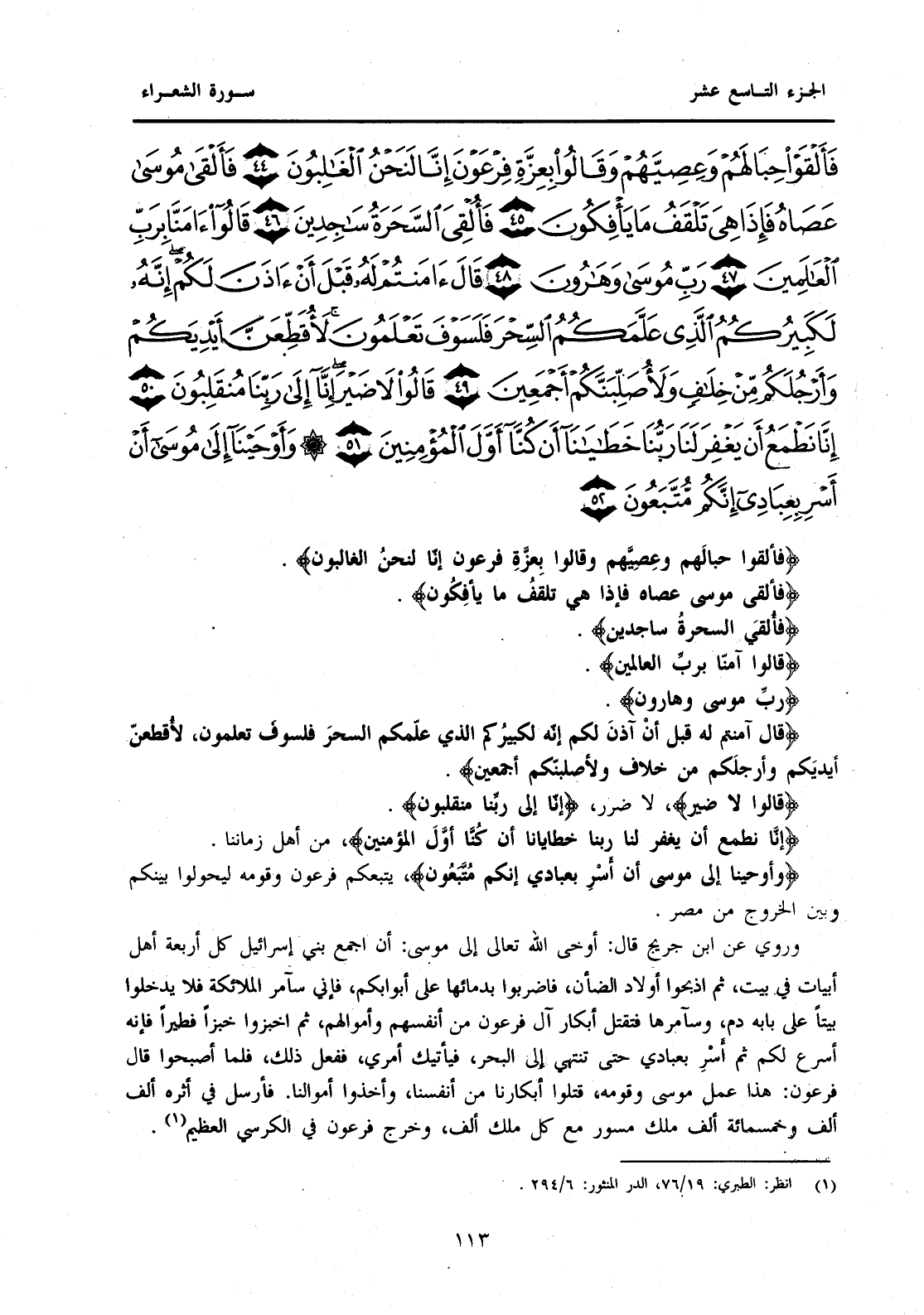 {فَأَلْقَوْا حِبَالَهُمْ وَعِصِيَّهُمْ وَقَالُوا بِعِزَّةِ فِرْعَوْنَ إِنَّا لَنَحْنُ الْغَالِبُونَ (44) فَأَلْقَى مُوسَى عَصَاهُ فَإِذَا هِيَ تَلْقَفُ مَا يَأْفِكُونَ (45) فَأُلْقِيَ السَّحَرَةُ سَاجِدِينَ (46) قَالُوا آمَنَّا بِرَبِّ الْعَالَمِينَ (47) رَبِّ مُوسَى وَهَارُونَ (48) قَالَ آمَنْتُمْ لَهُ قَبْلَ أَنْ آذَنَ لَكُمْ إِنَّهُ لَكَبِيرُكُمُ الَّذِي عَلَّمَكُمُ السِّحْرَ فَلَسَوْفَ تَعْلَمُونَ لَأُقَطِّعَنَّ أَيْدِيَكُمْ وَأَرْجُلَكُمْ مِنْ خِلَافٍ وَلَأُصَلِّبَنَّكُمْ أَجْمَعِينَ (49) قَالُوا لَا ضَيْرَ إِنَّا إِلَى رَبِّنَا مُنْقَلِبُونَ (50) إِنَّا نَطْمَعُ أَنْ يَغْفِرَ لَنَا رَبُّنَا خَطَايَانَا أَنْ كُنَّا أَوَّلَ الْمُؤْمِنِينَ (51) وَأَوْحَيْنَا إِلَى مُوسَى أَنْ أَسْرِ بِعِبَادِي إِنَّكُمْ مُتَّبَعُونَ (52) }