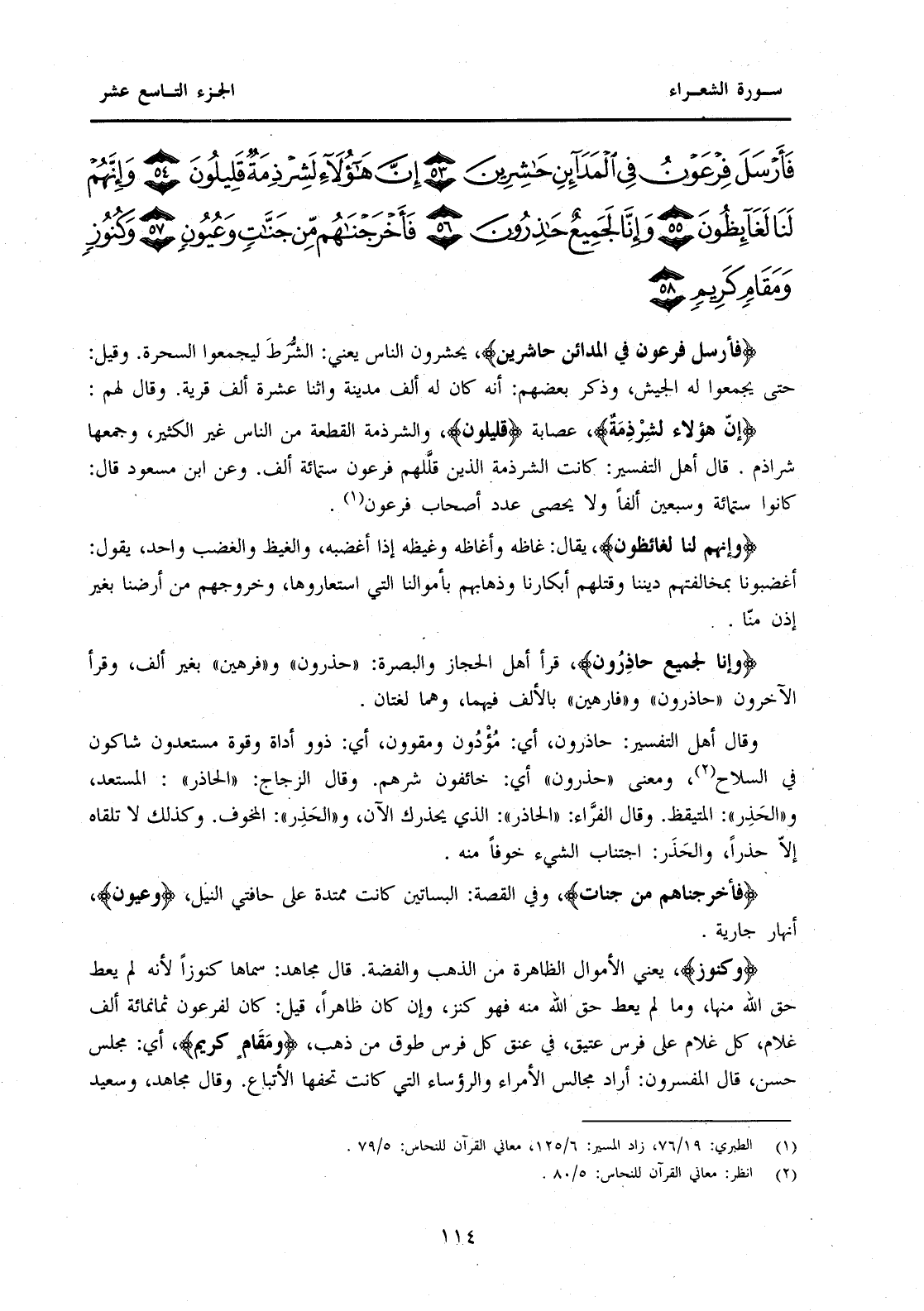 {فَأَرْسَلَ فِرْعَوْنُ فِي الْمَدَائِنِ حَاشِرِينَ} يَحْشُرُونَ النَّاسَ يَعْنِي: الشُّرَطَ لِيَجْمَعُوا السَّحَرَةَ. وَقِيلَ: حَتَّى يَجْمَعُوا لَهُ الْجَيْشَ، وَذَكَرَ بَعْضُهُمْ: أَنَّهُ كَانَ لَهُ أَلْفُ مَدِينَةٍ وَاثْنَا عَشْرَةَ أَلْفَ قَرْيَةٍ. وَقَالَ لَهُمْ: {إِنَّ هَؤُلَاءِ لَشِرْذِمَةٌ} عِصَابَةٌ {قَلِيلُونَ} وَالشِّرْذِمَةُ الْقِطْعَةُ مِنَ النَّاسِ غَيْرِ الْكَثِيرِ، وَجَمْعُهَا شَرَاذِمُ. قَالَ أَهْلُ التَّفْسِيرِ: كَانَتِ الشِّرْذِمَةُ الَّذِينَ قَلَّلَهُمْ فِرْعَوْنُ سِتَّمِائَةِ أَلْفٍ. وَعَنِ ابْنِ مَسْعُودٍ قَالَ: كَانُوا سِتَّمِائَةٍ وَسَبْعِينَ أَلْفًا وَلَا يُحْصَى عَدَدُ أَصْحَابِ فِرْعَوْنَ. (1) . {وَإِنَّهُمْ لَنَا لَغَائِظُونَ} يُقَالُ: غَاظَهُ وَأَغَاظَهُ وَغَيَّظَهُ إِذَا أَغْضَبَهُ، وَالْغَيْظُ وَالْغَضَبُ وَاحِدٌ، يَقُولُ: أَغْضَبُونَا بِمُخَالَفَتِهِمْ دِينَنَا وَقَتْلِهِمْ أَبْكَارَنَا وَذَهَابِهِمْ بِأَمْوَالِنَا الَّتِي اسْتَعَارُوهَا، وَخُرُوجِهِمْ مِنْ أَرْضِنَا بِغَيْرِ إِذْنٍ مِنَّا. {وَإِنَّا لَجَمِيعٌ حَاذِرُونَ} قَرَأَ أَهْلُ الْحِجَازِ وَالْبَصْرَةِ: "حَذِرُونَ" وَ"فَرِهِينَ" بِغَيْرِ أَلِفٍ، وَقَرَأَ الْآخَرُونَ "حَاذِرُونَ" وَ"فَارِهِينَ" بِالْأَلِفِ فِيهِمَا، وَهُمَا لُغَتَانِ. وَقَالَ أَهْلُ التَّفْسِيرِ: حَاذِرُونَ، أَيْ: مُؤْدُونَ وَمُقْوُونَ، أَيْ: ذَوُو أَدَاةٍ وَقُوَّةٍ مُسْتَعِدُّونَ شَاكُونَ فِي السلاح (2) ومعنى "حذرون" أَيْ: خَائِفُونَ شَرَّهُمْ. وَقَالَ الزَّجَّاجُ: "الْحَاذِرُ": الْمُسْتَعِدُّ، وَ"الْحَذِرُ": الْمُتَيَقِّظُ. وَقَالَ الْفَرَّاءُ: "الْحَاذِرُ": الَّذِي يَحْذَرُكَ الْآنَ، وَ"الْحَذِرُ": الْمُخَوِّفُ. وَكَذَلِكَ لَا تَلْقَاهُ إِلَّا حَذِرًا، وَالْحَذَرُ: اجْتِنَابُ الشَّيْءِ خَوْفًا مِنْهُ. {فَأَخْرَجْنَاهُمْ مِنْ جَنَّاتٍ} وَفِي الْقِصَّةِ: الْبَسَاتِينُ كَانَتْ مُمْتَدَّةً عَلَى حَافَّتَيِ النِّيلِ، {وَعُيُونٍ} أَنْهَارٍ جَارِيَةٍ. {وَكُنُوزٍ} يَعْنِي الْأَمْوَالَ الظَّاهِرَةَ مِنَ الذَّهَبِ وَالْفِضَّةِ. قَالَ مُجَاهِدٌ: سَمَّاهَا كُنُوزًا لِأَنَّهُ لَمْ يُعْطِ حَقَّ اللَّهِ مِنْهَا، وَمَا لَمْ يُعْطَ حَقُّ اللَّهِ مِنْهُ فَهُوَ كَنْزٌ وَإِنْ كَانَ ظَاهِرًا، قِيلَ: كَانَ لِفِرْعَوْنَ ثَمَانِمِائَةِ أَلْفِ غُلَامٍ، كُلُّ غُلَامٍ عَلَى فَرَسٍ عَتِيقٍ، فِي عُنُقِ كُلِّ فَرَسٍ طَوْقٌ مِنْ ذَهَبٍ، {وَمَقَامٍ كَرِيمٍ} أَيْ: مَجْلِسٍ حَسَنٍ، قَالَ الْمُفَسِّرُونَ: أَرَادَ مَجَالِسَ الْأُمَرَاءِ وَالرُّؤَسَاءِ الَّتِي كَانَتْ تَحُفُّهَا الْأَتْبَاعُ. وَقَالَ مُجَاهِدٌ، وَسَعِيدُ