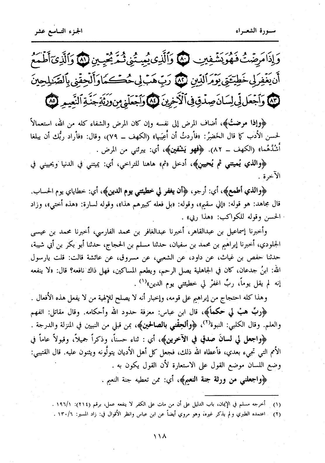 {وَإِذَا مَرِضْتُ} أَضَافَ الْمَرَضَ إِلَى نَفْسِهِ وَإِنْ كَانَ الْمَرَضُ وَالشِّفَاءُ كُلُّهُ مِنَ اللَّهِ، اسْتِعْمَالًا لِحُسْنِ الْأَدَبِ كَمَا قَالَ الْخَضِرُ: "فَأَرَدْتُ أَنْ أَعِيبَهَا" (الْكَهْفِ-79) ، وَقَالَ: "فَأَرَادَ رَبُّكَ أَنْ يَبْلُغَا أَشُدَّهُمَا" (الْكَهْفِ-82) . {فَهُوَ يَشْفِينِ} أَيْ: يُبْرِئُنِي مِنَ الْمَرَضِ. {وَالَّذِي يُمِيتُنِي ثُمَّ يُحْيِينِ} أَدْخَلَ "ثُمَّ" هَاهُنَا لِلتَّرَاخِي، أَيْ: يُمِيتُنِي فِي الدُّنْيَا وَيُحْيِينِي فِي الْآخِرَةِ. {وَالَّذِي أَطْمَعُ} أَيْ: أَرْجُو، {أَنْ يَغْفِرَ لِي خَطِيئَتِي يَوْمَ الدِّينِ} أَيْ: خَطَايَايَ يَوْمَ الْحِسَابِ. قَالَ مُجَاهِدٌ: هُوَ قَوْلُهُ: "إِنِّي سَقِيمٌ"، وَقَوْلُهُ: "بَلْ فَعَلَهُ كَبِيرُهُمْ هَذَا"، وَقَوْلُهُ لِسَارَّةَ: "هَذِهِ أُخْتِي"، وَزَادَ الْحَسَنُ وَقَوْلُهُ لِلْكَوَاكِبِ: "هَذَا رَبِّي". وَأَخْبَرَنَا إِسْمَاعِيلُ بْنُ عَبْدِ الْقَاهِرِ، أَخْبَرَنَا عَبْدُ الْغَافِرِ بْنُ مُحَمَّدٍ الْفَارِسِيُّ، أَخْبَرَنَا مُحَمَّدُ بْنُ عِيسَى الْجُلُودِيُّ، أَخْبَرَنَا إِبْرَاهِيمُ بْنُ مُحَمَّدِ بْنِ سُفْيَانَ، حَدَّثَنَا مُسْلِمُ بْنُ الْحَجَّاجِ، حَدَّثَنَا أَبُو بَكْرِ بْنُ أَبِي شَيْبَةَ، حَدَّثَنَا حَفْصٌ بْنُ غِيَاثٍ، عَنْ دَاوُدَ، عَنِ الشَّعْبِيِّ، عَنْ مَسْرُوقٍ، عَنْ عَائِشَةَ قَالَ: قُلْتُ يَا رَسُولَ اللَّهِ: ابْنُ جُدْعَانَ، كَانَ فِي الْجَاهِلِيَّةِ يَصِلُ الرَّحِمَ، وَيُطْعِمُ الْمَسَاكِينَ، فَهَلْ ذَاكَ نَافِعُهُ؟ قَالَ: "لَا يَنْفَعُهُ إِنَّهُ لَمْ يَقُلْ يَوْمًا، رَبِّ اغْفِرْ لِي خَطِيئَتِي يَوْمَ الدِّينِ" (1) وَهَذَا كُلُّهُ احْتِجَاجٌ مَنْ إِبْرَاهِيمَ عَلَى قَوْمِهِ، وَإِخْبَارٌ أَنَّهُ لَا يَصْلُحُ لِلْإِلَهِيَّةِ مَنْ لَا يَفْعَلُ هَذِهِ الْأَفْعَالَ. {رَبِّ هَبْ لِي حُكْمًا} قَالَ ابْنُ عَبَّاسٍ: مَعْرِفَةُ حُدُودِ اللَّهِ وَأَحْكَامِهِ. وَقَالَ مُقَاتِلٌ: الْفَهْمُ وَالْعِلْمُ. وَقَالَ الْكَلْبِيُّ: النُّبُوَّةُ (2) {وَأَلْحِقْنِي بِالصَّالِحِينَ} بِمَنْ قَبْلِي مِنَ النَّبِيِّينَ فِي الْمَنْزِلَةِ وَالدَّرَجَةِ. {وَاجْعَلْ لِي لِسَانَ صِدْقٍ فِي الْآخِرِينَ} أَيْ: ثَنَاءً حَسَنًا، وَذِكْرًا جَمِيلًا وَقَبُولًا عَامًّا فِي الْأُمَمِ الَّتِي تَجِيءُ بَعْدِي، فَأَعْطَاهُ اللَّهُ ذَلِكَ، فَجُعِلَ كُلُّ أَهْلِ الْأَدْيَانِ يَتَوَلَّوْنَهُ وَيُثْنُونَ عَلَيْهِ. قَالَ الْقُتَيْبِيُّ: وُضِعَ اللِّسَانُ مَوْضِعَ الْقَوْلِ عَلَى الِاسْتِعَارَةِ لِأَنَّ الْقَوْلَ يَكُونُ بِهِ. {وَاجْعَلْنِي مِنْ وَرَثَةِ جَنَّةِ النَّعِيمِ} أَيْ: مِمَّنْ تُعْطِيهِ جَنَّةَ النَّعِيمِ.