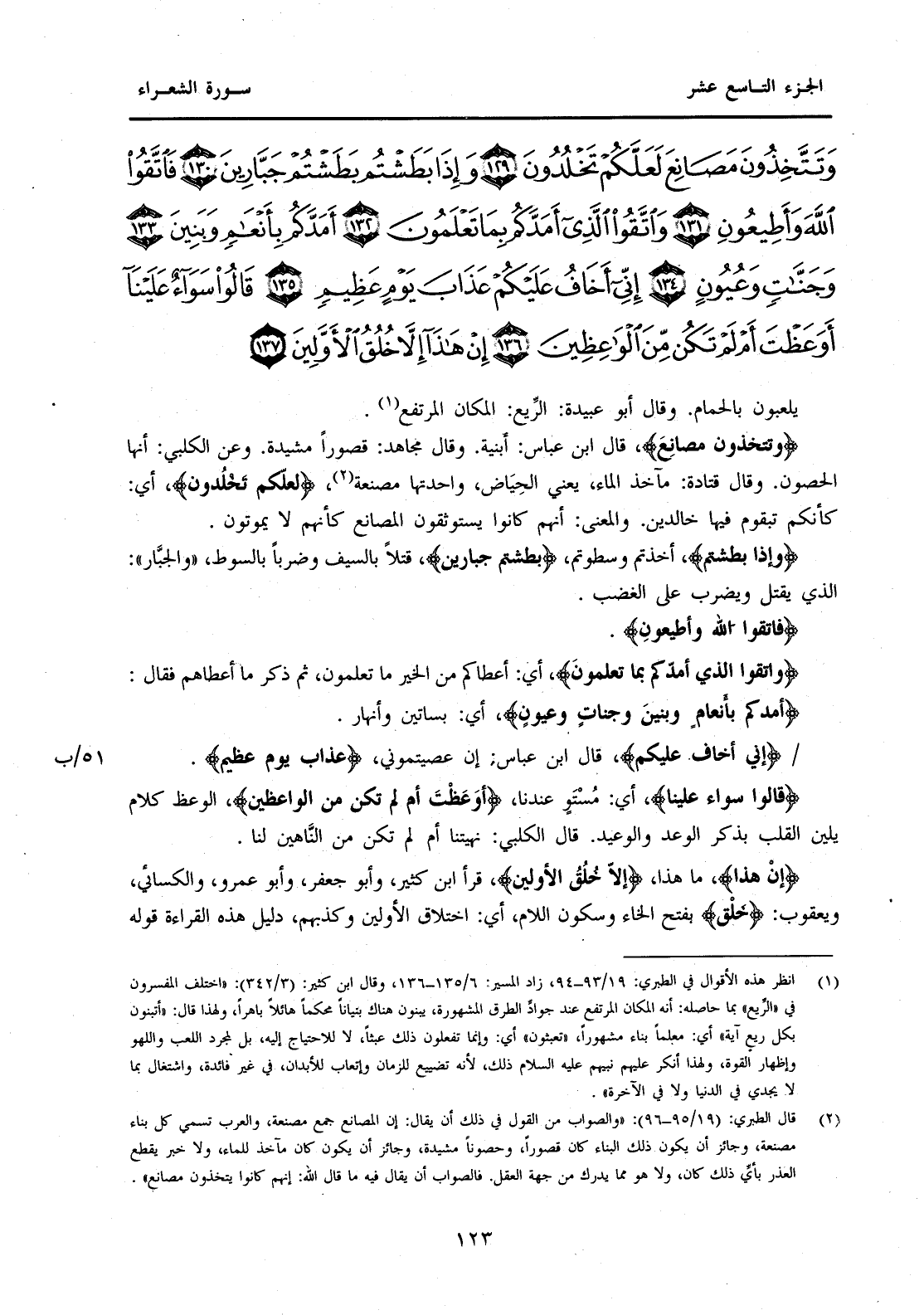 {وَتَتَّخِذُونَ مَصَانِعَ} قَالَ ابْنُ عَبَّاسٍ: أَبْنِيَةً. وَقَالَ مُجَاهِدٌ: قُصُورًا مُشَيَّدَةً. وَعَنِ الْكَلْبِيِّ: أَنَّهَا الْحُصُونُ. وَقَالَ قَتَادَةُ: مَآخِذُ الْمَاءِ، يَعْنِي الْحِيَاضَ، وَاحِدَتُهَا مَصْنَعَةٌ (1) {لَعَلَّكُمْ تَخْلُدُونَ} أَيْ: كَأَنَّكُمْ تَبْقُونَ فِيهَا خَالِدِينَ. وَالْمَعْنَى: أَنَّهُمْ كَانُوا يَسْتَوْثِقُونَ الْمَصَانِعَ كَأَنَّهُمْ لَا يَمُوتُونَ. {وَإِذَا بَطَشْتُمْ} أَخَذْتُمْ وَسَطَوْتُمْ، {بَطَشْتُمْ جَبَّارِينَ} قَتْلًا بِالسَّيْفِ وَضَرْبًا بِالسَّوْطِ، "وَالْجَبَّارُ": الَّذِي يَقْتُلُ وَيَضْرِبُ عَلَى الْغَضَبِ. {فَاتَّقُوا اللَّهَ وَأَطِيعُونِ} . {وَاتَّقُوا الَّذِي أَمَدَّكُمْ بِمَا تَعْلَمُونَ} أَيْ: أَعْطَاكُمْ مِنَ الْخَيْرِ مَا تَعْلَمُونَ، ثُمَّ ذَكَرَ مَا أَعْطَاهُمْ فَقَالَ: {أَمَدَّكُمْ بِأَنْعَامٍ وَبَنِينَ} {وَجَنَّاتٍ وَعُيُونٍ} أَيْ: بساتين وأنهار. 51/ب {إِنِّي أَخَافُ عَلَيْكُمْ} قَالَ ابْنُ عَبَّاسٍ: إِنْ عَصَيْتُمُونِي، {عَذَابَ يَوْمٍ عَظِيمٍ} {قَالُوا سَوَاءٌ عَلَيْنَا} أَيْ: مُسْتَوٍ عِنْدَنَا، {أَوَعَظْتَ أَمْ لَمْ تَكُنْ مِنَ الْوَاعِظِينَ} الْوَعْظُ كَلَامٌ يُلِينُ الْقَلْبَ بِذِكْرِ الْوَعْدِ وَالْوَعِيدِ. قَالَ الْكَلْبِيُّ: نَهَيْتَنَا أَمْ لَمْ تَكُنْ مِنَ النَّاهِينَ لَنَا. {إِنْ هَذَا} مَا هَذَا، {إِلَّا خُلُقُ الْأَوَّلِينَ} قَرَأَ ابْنُ كَثِيرٍ، وَأَبُو جَعْفَرٍ، وَأَبُو عَمْرٍو، وَالْكِسَائِيُّ، وَيَعْقُوبُ: "خَلْقُ" بِفَتْحِ الْخَاءِ وَسُكُونِ اللَّامِ، أَيْ: اخْتِلَاقُ الْأَوَّلِينَ وَكَذِبُهُمْ دَلِيلُ هَذِهِ الْقِرَاءَةِ قَوْلُهُ
