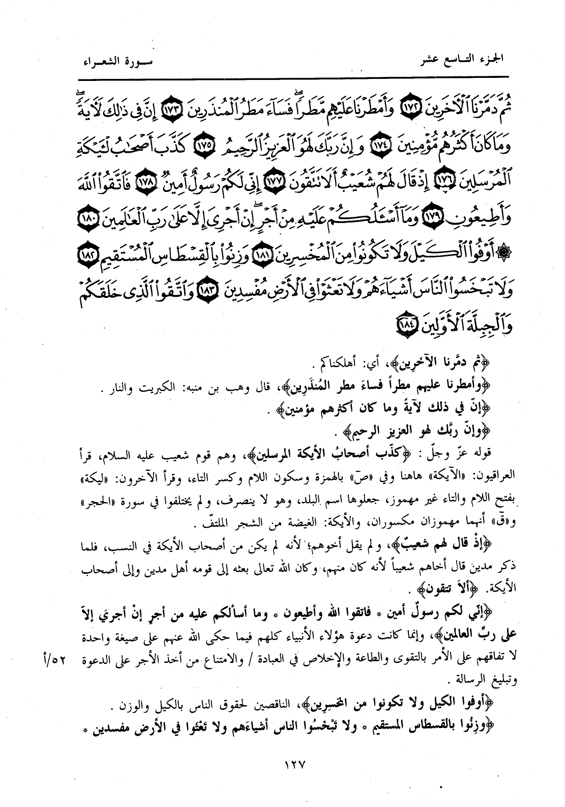 {ثُمَّ دَمَّرْنَا الْآخَرِينَ} أَيْ: أَهْلَكْنَاكُمْ. {وَأَمْطَرْنَا عَلَيْهِمْ مَطَرًا فَسَاءَ مَطَرُ الْمُنْذَرِينَ} قَالَ وَهْبُ بْنُ مُنَبِّهٍ: الْكِبْرِيتُ وَالنَّارُ. {إِنَّ فِي ذَلِكَ لَآيَةً وَمَا كَانَ أَكْثَرُهُمْ مُؤْمِنِينَ} {وَإِنَّ رَبَّكَ لَهُوَ الْعَزِيزُ الرَّحِيمُ} قَوْلُهُ عَزَّ وَجَلَّ: {كَذَّبَ أَصْحَابُ الْأَيْكَةِ الْمُرْسَلِينَ} وَهُمْ قَوْمُ شُعَيْبٍ عَلَيْهِ السَّلَامُ، قَرَأَ الْعِرَاقِيُّونَ: "الْآيْكَةِ" هَاهُنَا وَفِي "ص" بِالْهَمْزَةِ وَسُكُونِ اللَّامِ وَكَسْرِ التَّاءِ، وَقَرَأَ الْآخَرُونَ: "لَيْكَةَ" بِفَتْحِ اللَّامِ وَالتَّاءِ غَيْرُ مَهْمُوزٍ، جَعَلُوهَا اسْمَ الْبَلَدِ، وَهُوَ لَا يَنْصَرِفُ، وَلَمْ يَخْتَلِفُوا فِي سُورَةِ "الْحِجْرِ" وَ"ق" أَنَّهُمَا مَهْمُوزَانِ مَكْسُورَانِ، وَالْأَيْكَةُ: الْغَيْضَةُ مِنَ الشَّجَرِ الْمُلْتَفِّ. {إِذْ قَالَ لَهُمْ شُعَيْبٌ} وَلَمْ يَقُلْ أَخُوهُمْ؛ لِأَنَّهُ لَمْ يَكُنْ مِنْ أَصْحَابِ الْأَيْكَةِ فِي النَّسَبِ، فَلَمَّا ذَكَرَ مَدْيَنَ قَالَ أَخَاهُمْ شُعَيْبًا لِأَنَّهُ كَانَ مِنْهُمْ، وَكَانَ اللَّهُ تَعَالَى بَعَثَهُ إِلَى قَوْمِهِ أَهْلِ مَدْيَنَ وَإِلَى أَصْحَابِ الْأَيْكَةِ. {أَلَّا تَتَّقُونَ} {إِنِّي لَكُمْ رَسُولٌ أَمِينٌ فَاتَّقُوا اللَّهَ وَأَطِيعُونِ وَمَا أَسْأَلُكُمْ عَلَيْهِ مِنْ أَجْرٍ إِنْ أَجْرِيَ إِلَّا عَلَى رَبِّ الْعَالَمِينَ} وَإِنَّمَا كَانَتْ دَعْوَةُ هَؤُلَاءِ الْأَنْبِيَاءِ كُلِّهِمْ فِيمَا حَكَى اللَّهُ عَنْهُمْ عَلَى صيغة واحدة لا تفاقهم عَلَى الْأَمْرِ بِالتَّقْوَى وَالطَّاعَةِ وَالْإِخْلَاصِ في العبادة 52/أوَالِامْتِنَاعِ مِنْ أَخْذِ الْأَجْرِ عَلَى الدَّعْوَةِ وَتَبْلِيغِ الرِّسَالَةِ. {أَوْفُوا الْكَيْلَ وَلَا تَكُونُوا مِنَ الْمُخْسِرِينَ} النَّاقِصِينَ لِحُقُوقِ النَّاسِ بِالْكَيْلِ وَالْوَزْنِ.