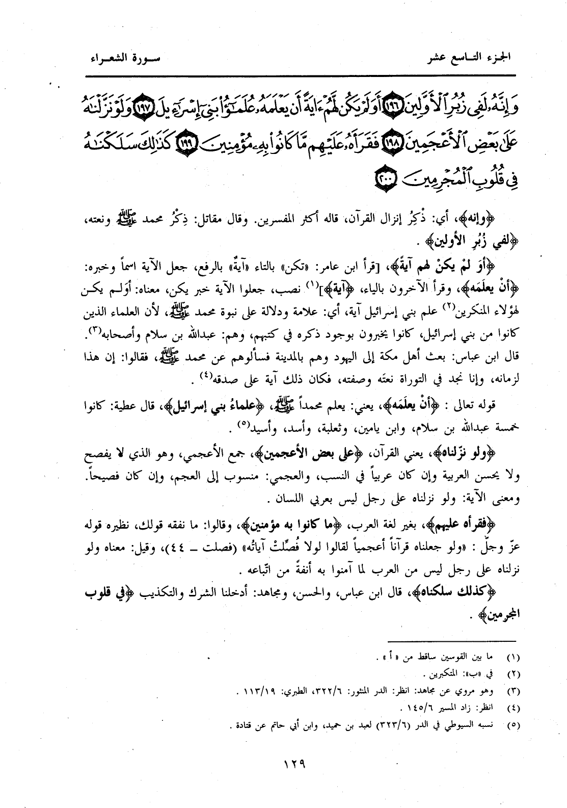 قَوْلُهُ تَعَالَى: {أَنْ يَعْلَمَهُ} يعني: يعلم محمد صَلَّى اللَّهُ عَلَيْهِ وَسَلَّمَ، {عُلَمَاءُ بَنِي إِسْرَائِيلَ} قَالَ عَطِيَّةُ: كَانُوا خَمْسَةً عَبْدُ اللَّهِ بْنُ سَلَامٍ، وَابْنُ يَامِينَ، وَثَعْلَبَةُ، وَأَسَدٌ، وَأُسَيْدٌ (5) . {وَلَوْ نَزَّلْنَاهُ} يَعْنِي الْقُرْآنَ، {عَلَى بَعْضِ الْأَعْجَمِينَ} جَمْعُ الْأَعْجَمِيِّ، وَهُوَ الَّذِي لَا يُفْصِحُ وَلَا يُحْسِنُ الْعَرَبِيَّةَ وَإِنْ كَانَ عَرَبِيًّا فِي النَّسَبِ، وَالْعَجَمِيُّ: مَنْسُوبٌ إِلَى الْعَجَمِ، وَإِنْ كَانَ فَصِيحًا. وَمَعْنَى الْآيَةِ: وَلَوْ نَزَّلْنَاهُ عَلَى رَجُلٍ لَيْسَ بِعَرَبِيِّ اللِّسَانِ. {فَقَرَأَهُ عَلَيْهِمْ} بِغَيْرِ لُغَةِ الْعَرَبِ، {مَا كَانُوا بِهِ مُؤْمِنِينَ} وَقَالُوا: مَا نَفْقَهُ قَوْلَكَ، نَظِيرُهُ قَوْلُهُ عَزَّ وَجَلَّ: "وَلَوْ جَعَلْنَاهُ قُرْآنًا أَعْجَمِيًّا لَقَالُوا لَوْلَا فُصِّلَتْ آيَاتُهُ" (فُصِّلَتْ-44) ، وَقِيلَ: مَعْنَاهُ وَلَوْ نَزَّلْنَاهُ عَلَى رَجُلٍ لَيْسَ مِنَ الْعَرَبِ لَمَا آمَنُوا بِهِ أَنَفَةً مِنِ اتِّبَاعِهِ. {كَذَلِكَ سَلَكْنَاهُ} قَالَ ابْنُ عَبَّاسٍ، وَالْحَسَنُ، وَمُجَاهِدٌ: أَدْخَلْنَا الشِّرْكَ وَالتَّكْذِيبَ {فِي قُلُوبِ الْمُجْرِمِينَ}