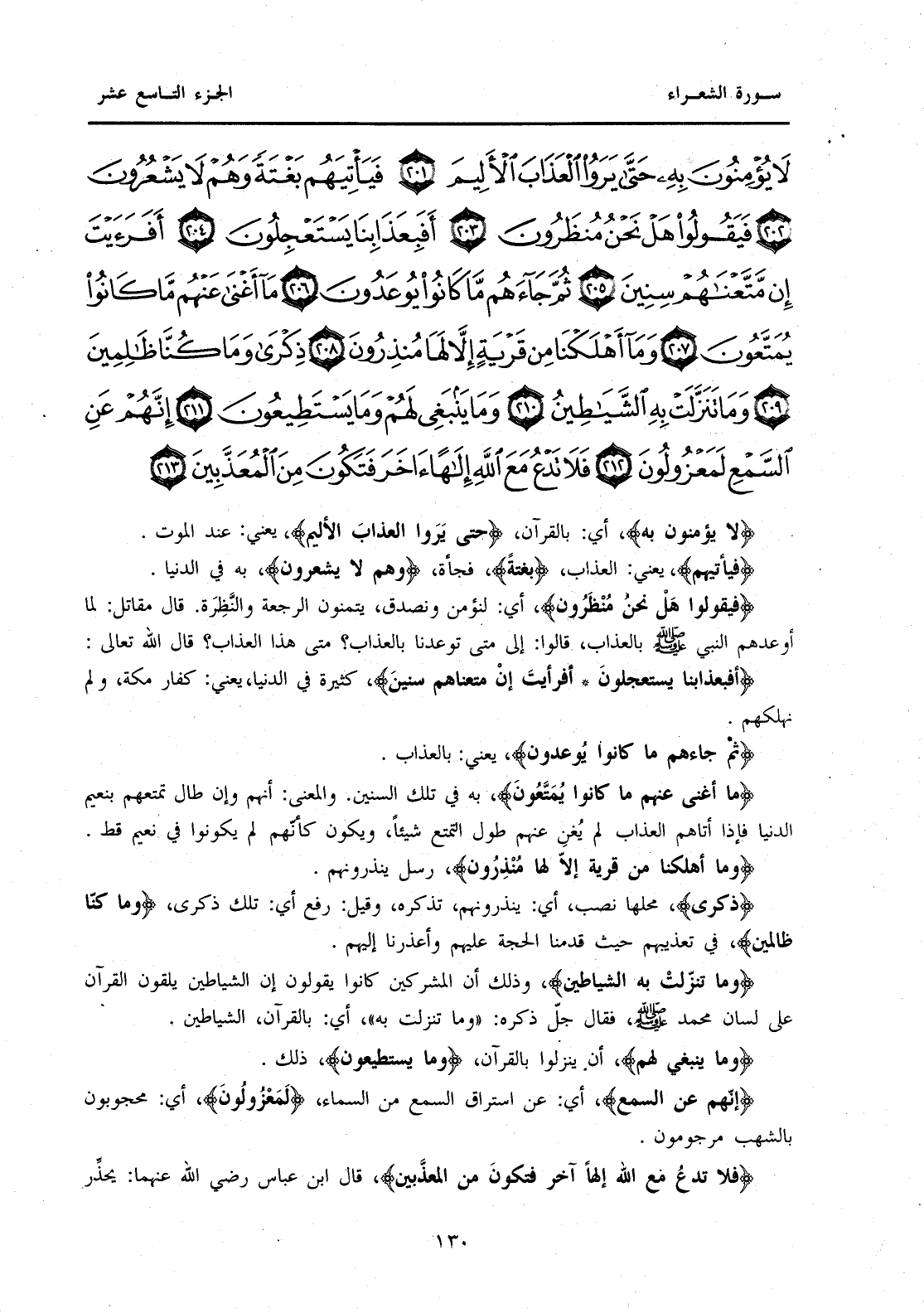 {لَا يُؤْمِنُونَ بِهِ} أَيْ: بِالْقُرْآنِ، {حَتَّى يَرَوُا الْعَذَابَ الْأَلِيمَ} يَعْنِي: عِنْدَ الْمَوْتِ. {فَيَأْتِيَهُمْ} يَعْنِي: الْعَذَابَ، {بَغْتَةً} فَجْأَةً، {وَهُمْ لَا يَشْعُرُونَ} بِهِ فِي الدُّنْيَا. {فَيَقُولُوا هَلْ نَحْنُ مُنْظَرُونَ} أَيْ: لِنُؤْمِنَ وَنُصَدِّقَ، يَتَمَنَّوْنَ الرَّجْعَةَ وَالنَّظِرَةَ. قَالَ مُقَاتِلٌ: لَمَّا أَوْعَدَهُمُ النَّبِيُّ صَلَّى اللَّهُ عَلَيْهِ وَسَلَّمَ بِالْعَذَابِ، قَالُوا: إِلَى مَتَى تُوعِدُنَا بِالْعَذَابِ؟ مَتَى هَذَا الْعَذَابُ؟ قَالَ اللَّهُ تَعَالَى: {أَفَبِعَذَابِنَا يَسْتَعْجِلُونَ أَفَرَأَيْتَ إِنْ مَتَّعْنَاهُمْ سِنِينَ} كَثِيرَةً فِي الدُّنْيَا، يَعْنِي: كُفَّارَ مَكَّةَ، وَلَمْ نُهْلِكْهُمْ. {ثُمَّ جَاءَهُمْ مَا كَانُوا يُوعَدُونَ} يَعْنِي: بِالْعَذَابِ. {مَا أَغْنَى عَنْهُمْ مَا كَانُوا يُمَتَّعُونَ} بِهِ فِي تِلْكَ السِّنِينَ. وَالْمَعْنَى: أَنَّهُمْ وَإِنْ طَالَ تَمَتُّعُهُمْ بِنَعِيمِ الدُّنْيَا فَإِذَا أَتَاهُمُ الْعَذَابُ لَمْ يُغْنِ عَنْهُمْ طُولُ التَّمَتُّعِ شَيْئًا، وَيَكُونُ كَأَنَّهُمْ لَمْ يَكُونُوا فِي نَعِيمٍ قَطُّ. {وَمَا أَهْلَكْنَا مِنْ قَرْيَةٍ إِلَّا لَهَا مُنْذِرُونَ} رُسُلٌ يُنْذِرُونَهُمْ. {ذِكْرَى} مَحَلُّهَا نَصْبٌ، أَيْ: يُنْذِرُونَهُمْ، تَذْكِرَةً، وَقِيلَ: رَفْعٌ أَيْ: تِلْكَ ذِكْرَى، {وَمَا كُنَّا ظَالِمِينَ} فِي تَعْذِيبِهِمْ حَيْثُ قَدَّمْنَا الْحُجَّةَ عَلَيْهِمْ وَأَعْذَرْنَا إِلَيْهِمْ. {وَمَا تَنَزَّلَتْ بِهِ الشَّيَاطِينُ} وَذَلِكَ أَنَّ الْمُشْرِكِينَ كَانُوا يَقُولُونَ إِنَّ الشَّيَاطِينَ يُلْقُونَ الْقُرْآنَ عَلَى لِسَانِ مُحَمَّدٍ صَلَّى اللَّهُ عَلَيْهِ وَسَلَّمَ، فَقَالَ جَلَّ ذِكْرُهُ: "وَمَا تَنَزَّلَتْ بِهِ"، أَيْ: بِالْقُرْآنِ، الشَّيَاطِينُ. {وَمَا يَنْبَغِي لَهُمْ} أَنْ يُنَزَّلُوا بِالْقُرْآنِ، {وَمَا يَسْتَطِيعُونَ} ذَلِكَ. {إِنَّهُمْ عَنِ السَّمْعِ} أَيْ: عَنِ اسْتِرَاقِ السَّمْعِ مِنَ السَّمَاءِ، {لَمَعْزُولُونَ} أَيْ: مَحْجُوبُونَ بِالشُّهُبِ مَرْجُومُونَ. {فَلَا تَدْعُ مَعَ اللَّهِ إِلَهًا آخَرَ فَتَكُونَ مِنَ الْمُعَذَّبِينَ} قَالَ ابْنُ عَبَّاسٍ رَضِيَ اللَّهُ عَنْهُمَا: يُحَذِّرُ