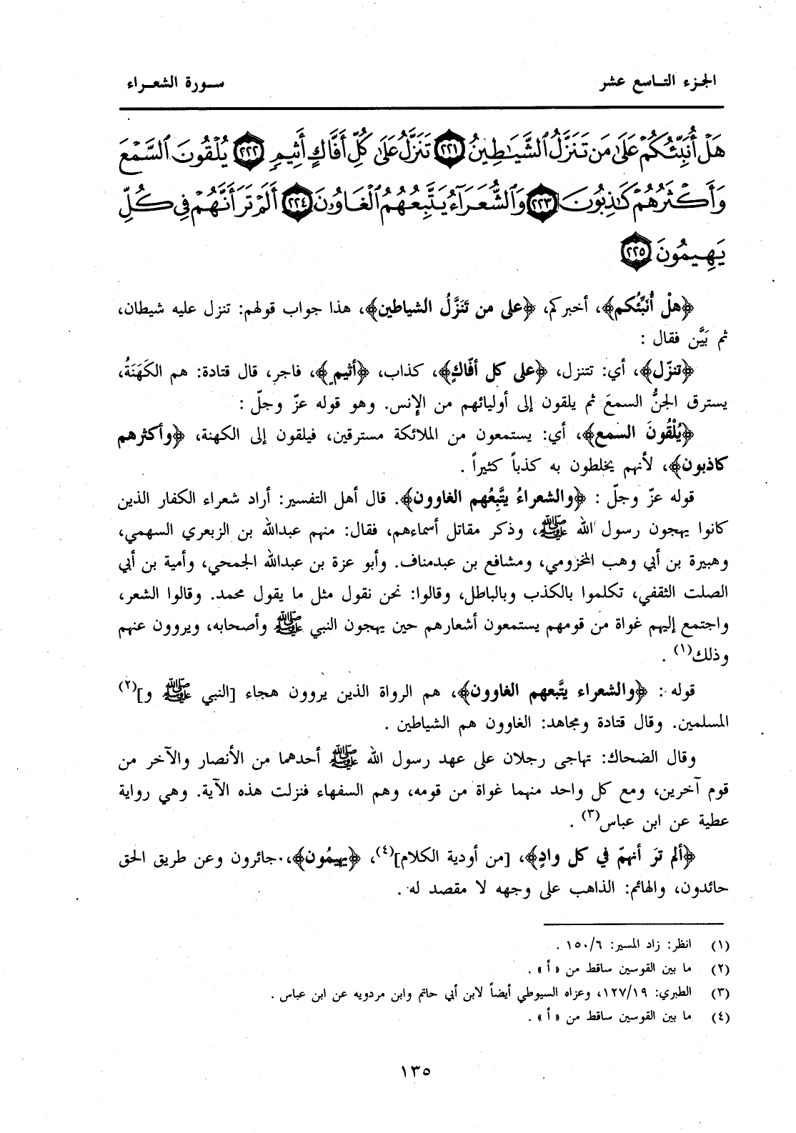 {هَلْ أُنَبِّئُكُمْ عَلَى مَنْ تَنَزَّلُ الشَّيَاطِينُ (221) تَنَزَّلُ عَلَى كُلِّ أَفَّاكٍ أَثِيمٍ (222) يُلْقُونَ السَّمْعَ وَأَكْثَرُهُمْ كَاذِبُونَ (223) وَالشُّعَرَاءُ يَتَّبِعُهُمُ الْغَاوُونَ (224) أَلَمْ تَرَ أَنَّهُمْ فِي كُلِّ وَادٍ يَهِيمُونَ (225) }