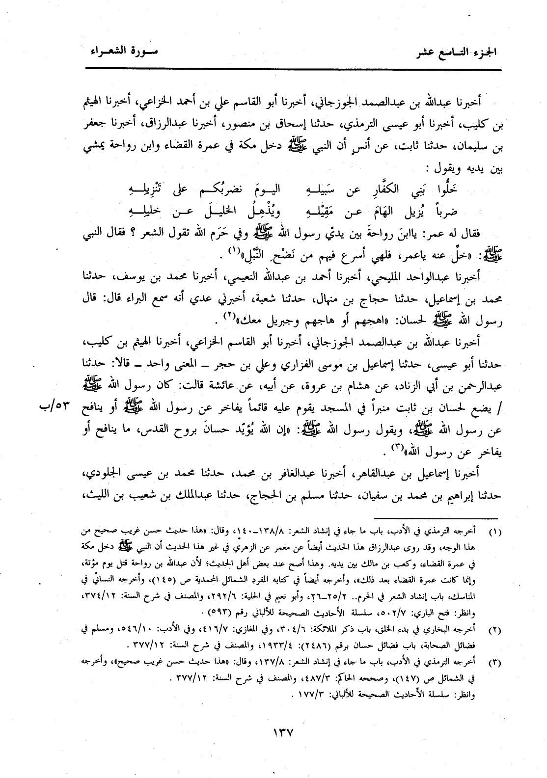 أَخْبَرَنَا عَبْدُ اللَّهِ بْنُ عَبْدِ الصَّمَدِ الْجَوْزَجَانِيُّ، أَخْبَرَنَا أَبُو الْقَاسِمِ الْخُزَاعِيُّ، أَخْبَرَنَا الْهَيْثَمُ بْنُ كُلَيْبٍ، حَدَّثَنَا أَبُو عِيسَى، حَدَّثَنَا إِسْمَاعِيلُ بْنُ مُوسَى الْفَزَارِيُّ وَعَلِيُّ بْنُ حُجْرٍ -الْمَعْنَى وَاحِدٌ-قَالَا حَدَّثَنَا عَبْدُ الرَّحْمَنِ بْنُ أَبِي الزِّنَادِ، عَنْ هِشَامِ بْنِ عُرْوَةَ، عَنْ أَبِيهِ، عَنْ عَائِشَةَ قَالَتْ: كَانَ رسول الله صَلَّى اللَّهُ عَلَيْهِ وَسَلَّمَ 53/ب يَضَعُ لِحَسَّانَ بْنِ ثَابِتٍ مِنْبَرًا فِي الْمَسْجِدِ يَقُومُ عَلَيْهِ قَائِمًا يُفَاخِرُ عَنْ رَسُولِ اللَّهِ صَلَّى اللَّهُ عَلَيْهِ وَسَلَّمَ أَوْ يُنَافِحُ عَنْ رَسُولِ اللَّهِ صَلَّى اللَّهُ عَلَيْهِ وَسَلَّمَ، وَيَقُولُ رَسُولُ اللَّهِ صَلَّى اللَّهُ عَلَيْهِ وَسَلَّمَ: "إِنَّ اللَّهَ يُؤَيِّدُ حَسَّانَ بِرُوحِ الْقُدُسِ، مَا يُنَافِحُ أَوْ يُفَاخِرُ عَنْ رَسُولِ اللَّهِ" (3) . أَخْبَرَنَا إِسْمَاعِيلُ بْنُ عَبَدِ الْقَاهِرِ، أَخْبَرَنَا عَبْدُ الْغَفَّارِ بْنُ مُحَمَّدٍ، حَدَّثَنَا مُحَمَّدُ بْنُ عِيسَى الْجُلُودِيُّ، حَدَّثَنَا إِبْرَاهِيمُ بْنُ مُحَمَّدِ بْنِ سُفْيَانَ، حَدَّثَنَا مُسْلِمُ بْنُ الْحَجَّاجِ، حَدَّثَنَا عَبْدُ الْمَلِكِ بْنُ شُعَيْبِ بْنِ اللَّيْثِ،