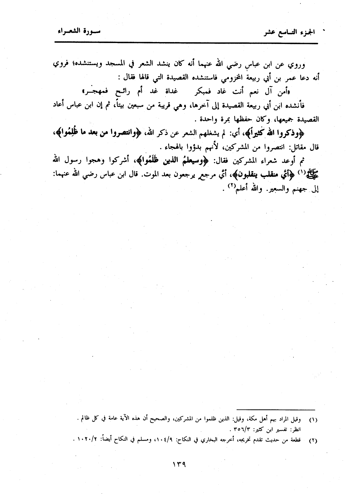 فَأَنْشَدَهُ ابْنُ أَبِي رَبِيعَةَ الْقَصِيدَةَ إِلَى آخِرِهَا، وَهِيَ قَرِيبَةٌ مِنْ سَبْعِينَ بَيْتًا، ثُمَّ إِنَّ ابْنَ عَبَّاسٍ أَعَادَ الْقَصِيدَةَ جَمِيعَهَا، وَكَانَ حَفِظَهَا بِمَرَّةٍ وَاحِدَةٍ. {وَذَكَرُوا اللَّهَ كَثِيرًا} أَيْ: لَمْ يَشْغَلْهُمُ الشِّعْرُ عَنْ ذِكْرِ اللَّهِ، {وَانْتَصَرُوا مِنْ بَعْدِ مَا ظُلِمُوا} قَالَ مُقَاتِلٌ: انْتَصَرُوا مِنَ الْمُشْرِكِينَ، لِأَنَّهُمْ بَدَءُوا بِالْهِجَاءِ. ثُمَّ أَوْعَدَ شُعَرَاءَ الْمُشْرِكِينَ فَقَالَ: {وَسَيَعْلَمُ الَّذِينَ ظَلَمُوا} أَشْرَكُوا وَهَجَوْا رَسُولَ اللَّهِ صَلَّى اللَّهُ عَلَيْهِ وَسَلَّمَ (1) {أَيَّ مُنْقَلَبٍ يَنْقَلِبُونَ} أَيَّ مَرْجِعٍ يُرْجَعُونَ بَعْدَ الْمَوْتِ. قَالَ ابْنُ عَبَّاسٍ رَضِيَ اللَّهُ عَنْهُمَا: إِلَى جَهَنَّمَ وَالسَّعِيرِ. وَاللَّهُ أَعْلَمُ (2) .