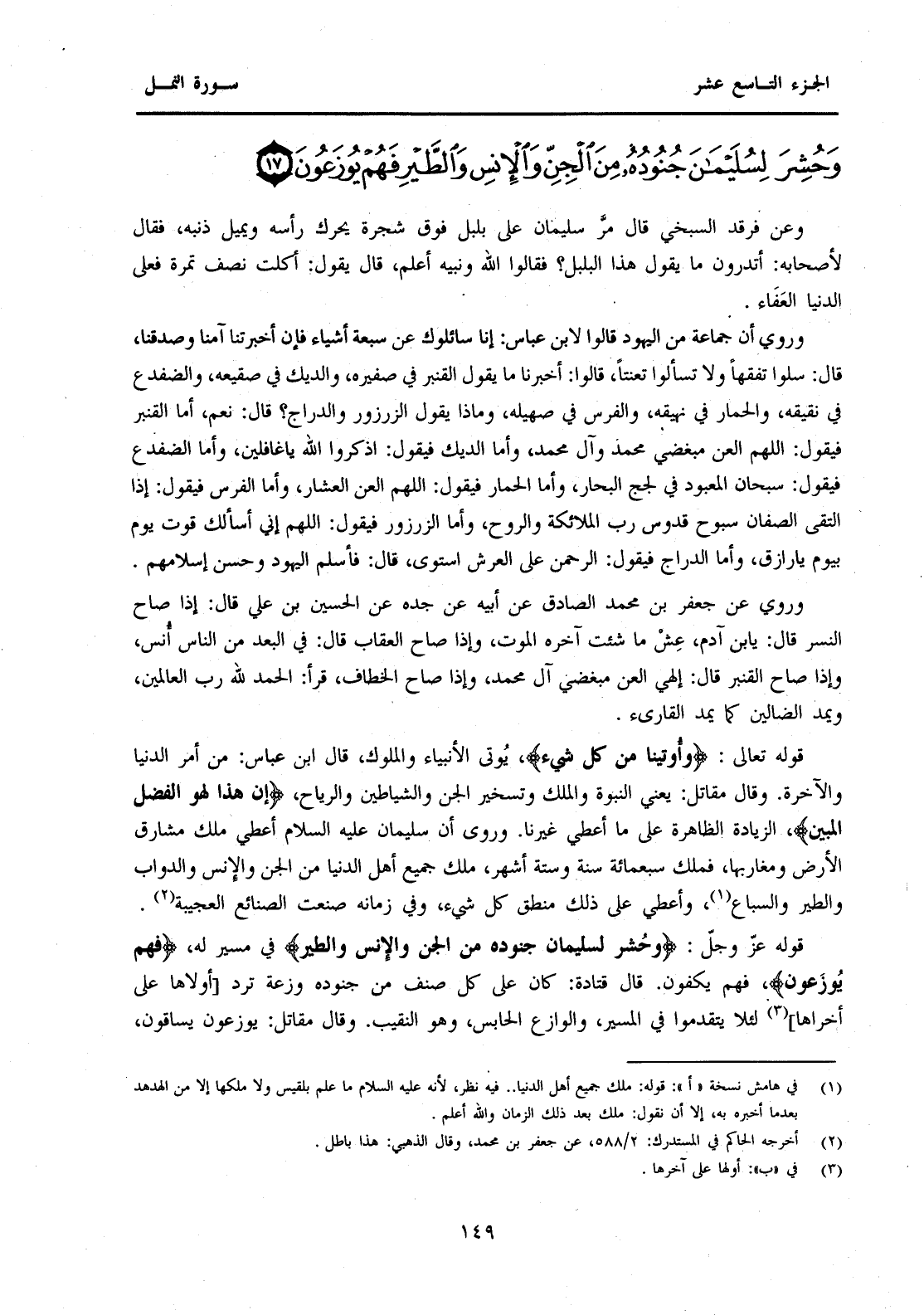 قَوْلُهُ عَزَّ وَجَلَّ: {وَحُشِرَ لِسُلَيْمَانَ جُنُودُهُ مِنَ الْجِنِّ وَالْإِنْسِ وَالطَّيْرِ} فِي مَسِيرِهِ لَهُ، {فَهُمْ يُوزَعُونَ} فَهُمْ يَكُفُّونَ. قَالَ قَتَادَةُ: كَانَ عَلَى كُلِّ صَفٍّ مِنْ جُنُودِهِ وزعة ترد [أولها عَلَى أُخْرَاهَا] (3) لِئَلَّا يَتَقَدَّمُوا فِي الْمَسِيرِ، وَالْوَازِعُ الْحَابِسُ، وَهُوَ النَّقِيبُ. وَقَالَ مُقَاتِلٌ: يُوزَعُونَ يُسَاقُونَ،