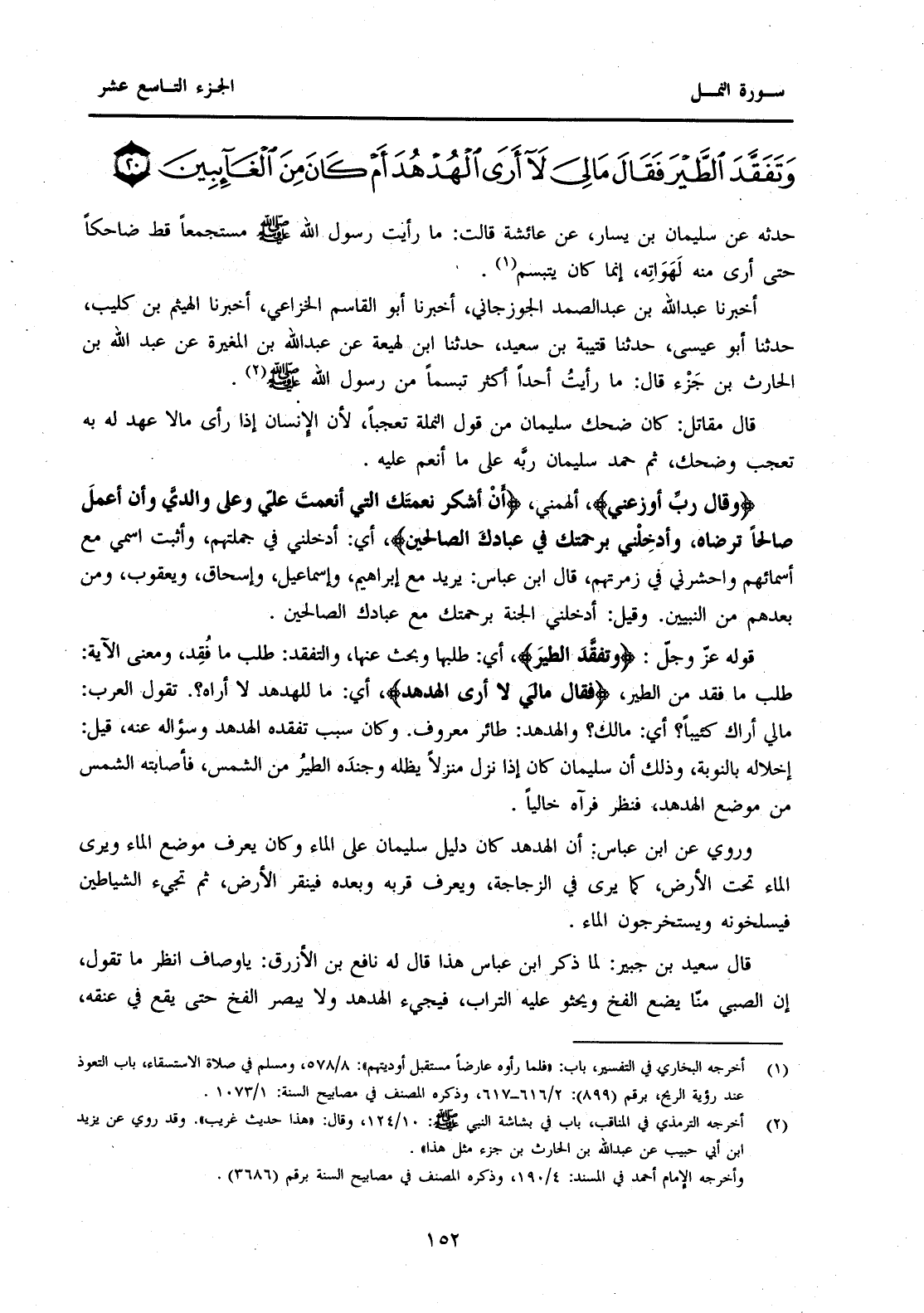قَوْلُهُ عَزَّ وَجَلَّ: {وَتَفَقَّدَ الطَّيْرَ} أَيْ: طَلَبَهَا وَبَحَثَ عَنْهَا، وَالتَّفَقُّدُ: طَلَبُ مَا فُقِدَ، وَمَعْنَى الْآيَةِ: طَلَبَ مَا فَقَدَ مِنَ الطَّيْرِ، {فَقَالَ مَا لِيَ لَا أَرَى الْهُدْهُدَ} أَيْ: مَا لِلْهُدْهُدِ لَا أَرَاهُ؟. تَقُولُ الْعَرَبُ: مَا لِي أَرَاكَ كَئِيبًا؟ أَيْ: مَالَكَ؟ وَالْهُدْهُدُ: طَائِرٌ مَعْرُوفٌ. وَكَانَ سَبَبُ تَفَقُّدِهِ الْهُدْهُدَ وَسُؤَالِهِ عَنْهُ، قِيلَ: إِخْلَالُهُ بِالنَّوْبَةِ، وَذَلِكَ أَنَّ سُلَيْمَانَ كَانَ إِذَا نَزَلَ مَنْزِلًا يُظِلُّهُ وَجُنْدَهُ الطَّيْرُ مِنَ الشَّمْسِ، فَأَصَابَتْهُ الشَّمْسُ مِنْ مَوْضِعِ الْهُدْهُدِ، فَنَظَرَ فَرَآهُ خَالِيًا.