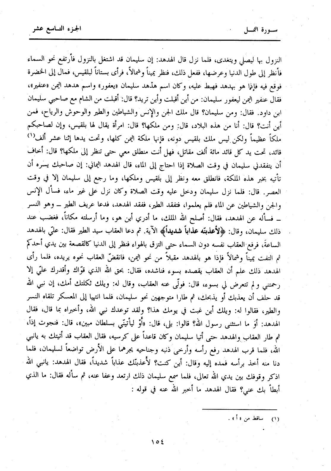 النُّزُولَ بِهَا لِيُصَلِّيَ وَيَتَغَدَّى، فَلَمَّا نَزَلَ قَالَ الْهُدْهُدَ: إِنَّ سُلَيْمَانَ قَدِ اشْتَغَلَ بِالنِّزُولِ فَارْتَفِعَ نَحْوَ السَّمَاءِ فَانْظُرْ إِلَى طُولِ الدُّنْيَا وَعَرْضِهَا، فَفَعَلَ ذَلِكَ، فَنَظَرَ يَمِينًا وَشِمَالًا فَرَأَى بُسْتَانًا لِبِلْقِيسَ، فَمَالَ إِلَى الْخُضْرَةِ فَوَقْعَ فِيهِ فَإِذَا هُوَ بِهُدْهُدٍ فَهَبَطَ عَلَيْهِ، وَكَانَ اسْمُ هُدْهُدِ سُلَيْمَانَ "يَعْفُورُ" وَاسْمُ هُدْهُدِ الْيَمَنِ "عِنْفِيرُ"، فَقَالَ عِنْفِيرُ الْيَمَنِ لِيَعْفُورِ سُلَيْمَانَ: مِنْ أَيْنَ أَقْبَلَتْ وَأَيْنَ تُرِيدُ؟ قَالَ: أَقْبَلْتُ مِنَ الشَّامِ مَعَ صَاحِبِي سُلَيْمَانَ بْنِ دَاوُدَ. فَقَالَ: وَمَنْ سُلَيْمَانُ؟ قَالَ مَلِكُ الْجِنَّ وَالْإِنْسِ وَالشَّيَاطِينِ وَالطَّيْرِ وَالْوُحُوشِ وَالرِّيَاحِ، فَمِنْ أَيْنَ أَنْتِ؟ قَالَ: أَنَا مِنْ هَذِهِ الْبِلَادِ، قَالَ: وَمَنْ مَلِكُهَا؟ قَالَ: امْرَأَةٌ يُقَالُ لَهَا بِلْقِيسُ، وَإِنَّ لِصَاحِبِكُمْ مُلْكًا عَظِيمًا وَلَكِنْ لَيْسَ مُلْكُ بِلْقِيسَ دُونَهُ، فَإِنَّهَا مَلِكَةُ الْيَمَنِ كُلِّهَا، وَتَحْتَ يَدِهَا اثْنَا عَشَرَ أَلْفَ (1) قَائِدٍ، تَحْتَ يَدِ كُلِّ قَائِدٍ مِائَةُ أَلْفِ مُقَاتِلٍ، فَهَلْ أَنْتَ مُنْطَلِقٌ مَعِي حَتَّى تَنْظُرَ إِلَى مُلْكِهَا؟ قَالَ: أَخَافُ أَنْ يَتَفَقَّدَنِي سُلَيْمَانُ فِي وَقْتِ الصَّلَاةِ إِذَا احْتَاجَ إِلَى الْمَاءِ، قَالَ الْهُدْهُدُ الْيَمَانِيُّ: إِنْ صَاحَبَكَ يَسُرُّهُ أَنْ تَأْتِيَهُ بِخَبَرِ هَذِهِ الْمَلِكَةِ، فَانْطَلَقَ مَعَهُ وَنَظَرَ إِلَى بِلْقِيسَ وَمُلْكِهَا، وَمَا رَجَعَ إِلَى سُلَيْمَانَ إِلَّا فِي وَقْتِ الْعَصْرِ. قَالَ: فَلَمَّا نَزَلَ سُلَيْمَانُ وَدَخَلَ عَلَيْهِ وَقْتُ الصَّلَاةِ وَكَانَ نَزَلَ عَلَى غَيْرِ مَاءٍ، فَسَأَلَ الْإِنْسَ وَالْجِنَّ وَالشَّيَاطِينَ عَنِ الْمَاءِ فَلَمْ يَعْلَمُوا، فَتَفَقَّدَ الطَّيْرَ، فَفَقَدَ الْهُدْهُدَ، فَدَعَا عَرِّيفَ الطَّيْرِ -وَهُوَ النَّسْرُ-فَسَأَلَهُ عَنِ الْهُدْهُدِ، فَقَالَ: أَصْلَحَ اللَّهُ الْمَلِكَ، مَا أَدْرِي أَيْنَ هُوَ، وَمَا أَرْسَلْتُهُ مَكَانًا، فَغَضِبَ عِنْدَ ذَلِكَ سُلَيْمَانُ، وَقَالَ: {لَأُعَذِّبَنَّهُ عَذَابًا شَدِيدًا} الْآيَةَ. ثُمَّ دَعَا الْعُقَابَ سَيِّدَ الطَّيْرِ فَقَالَ: عَلَيَّ بِالْهُدْهُدِ السَّاعَةَ، فَرَفَعَ الْعُقَابُ نَفْسَهُ دُونَ السَّمَاءِ حَتَّى الْتَزَقَ بِالْهَوَاءِ فَنَظَرَ إِلَى الدُّنْيَا كَالْقَصْعَةِ بَيْنَ يَدَيْ أَحَدِكُمْ ثُمَّ الْتَفَتَ يَمِينًا وَشِمَالًا فَإِذَا هُوَ بِالْهُدْهُدِ مُقْبِلًا مِنْ نَحْوِ الْيَمَنِ، فَانْقَضَّ الْعُقَابُ نَحْوَهُ يُرِيدُهُ، فَلَمَّا رَأَى الْهُدْهُدُ ذَلِكَ عَلِمَ أَنَّ الْعُقَابَ يَقْصِدُهُ بِسُوءٍ فَنَاشَدَهُ، فَقَالَ: بِحَقِّ اللَّهِ الَّذِي قَوَّاكَ وَأَقْدَرَكَ عَلَيَّ إِلَّا رَحِمْتَنِي وَلَمْ تَتَعَرَّضْ لِي بِسُوءٍ، قَالَ: فَوَلَّى عَنْهُ الْعُقَابُ، وَقَالَ لَهُ: وَيْلُكُ ثَكِلَتْكَ أُمُّكَ، إِنَّ نَبِيَّ اللَّهِ قَدْ حَلَفَ أَنْ يُعَذِّبَكَ أَوْ يَذْبَحَكَ، ثُمَّ طَارَا مُتَوَجِّهِينَ نَحْوَ سُلَيْمَانَ، فَلَمَّا انْتَهَيَا إِلَى الْمُعَسْكَرِ تَلَقَّاهُ النَّسْرُ وَالطَّيْرُ، فَقَالُوا لَهُ: وَيْلُكَ أَيْنَ غِبْتَ فِي يَوْمِكَ هَذَا؟ وَلَقَدْ تَوَعَّدَكَ نَبِيُّ اللَّهِ، وَأَخْبَرَاهُ بِمَا قَالَ، فَقَالَ الْهُدْهُدُ: أَوَمَا اسْتَثْنَى رَسُولُ اللَّهِ؟ قَالُوا: بَلَى، قَالَ: "أَوْ لَيَأْتِيَنِي بِسُلْطَانٍ مُبِينٍ"، قَالَ: فَنَجَوْتُ إِذًا، ثُمَّ طَارَ الْعُقَابُ وَالْهُدْهُدُ حَتَّى أَتَيَا سُلَيْمَانَ وَكَانَ قَاعِدًا عَلَى كُرْسِيِّهِ، فَقَالَ الْعُقَابُ قَدْ أَتَيْتُكَ ب