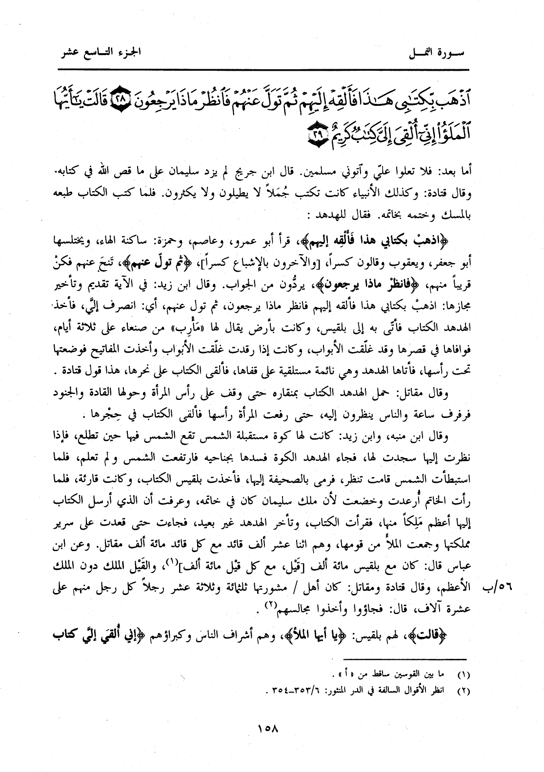 ( {اذْهَبْ بِكِتَابِي هَذَا فَأَلْقِهْ إِلَيْهِمْ} قَرَأَ أَبُو عَمْرٍو، وَعَاصِمٌ، وَحَمْزَةُ: سَاكِنَةَ الْهَاءِ، وَيَخْتَلِسُهَا أَبُو جَعْفَرٍ، وَيَعْقُوبُ وَقَالُونُ كَسْرًا، [وَالْآخَرُونَ بِالْإِشْبَاعِ كَسْرًا] ، {ثُمَّ تَوَلَّ عَنْهُمْ} تَنَحَّ عَنْهُمْ فَكُنْ قَرِيبًا مِنْهُمْ، {فَانْظُرْ مَاذَا يَرْجِعُونَ} يَرُدُّونَ مِنَ الْجَوَابِ. وَقَالَ ابْنُ زَيْدٍ: فِي الْآيَةِ تَقْدِيمٌ وَتَأْخِيرٌ مَجَازُهَا: اذْهَبْ بِكِتَابِي هَذَا فَأَلْقِهْ إِلَيْهِمْ فَانْظُرْ مَاذَا يَرْجِعُونَ، ثُمَّ تَوَلَّ عَنْهُمْ، أَيْ: انْصَرِفْ إِلَيَّ، فَأَخَذَ الْهُدْهُدُ الْكِتَابَ فَأَتَى بِهِ إِلَى بِلْقِيسَ، وَكَانَتْ بِأَرْضٍ يُقَالُ لَهَا "مَأْرِبُ" مِنْ صَنْعَاءَ عَلَى ثَلَاثَةِ أَيَّامٍ، فَوَافَاهَا فِي قَصْرِهَا وَقَدْ غَلَّقَتِ الْأَبْوَابَ، وَكَانَتْ إِذَا رَقَدَتْ غَلَّقَتِ الْأَبْوَابَ وَأَخَذَتِ الْمَفَاتِيحَ فَوَضَعَتْهَا تَحْتَ رَأْسِهَا، فَأَتَاهَا الْهُدْهُدُ وَهِيَ نَائِمَةٌ مُسْتَلْقِيَةٌ عَلَى قَفَاهَا، فَأَلْقَى الْكِتَابَ عَلَى نَحْرِهَا، هَذَا قَوْلُ قَتَادَةَ. وَقَالَ مُقَاتِلٌ: حَمَلَ الْهُدْهُدُ الْكِتَابَ بِمِنْقَارِهِ حَتَّى وَقَفَ عَلَى رَأْسِ الْمَرْأَةِ وَحَوْلَهَا الْقَادَةُ وَالْجُنُودُ فَرَفْرَفَ سَاعَةً وَالنَّاسُ يَنْظُرُونَ إِلَيْهِ، حَتَّى رَفَعَتِ الْمَرْأَةُ رَأْسَهَا فَأَلْقَى الْكِتَابَ فِي حِجْرِهَا.