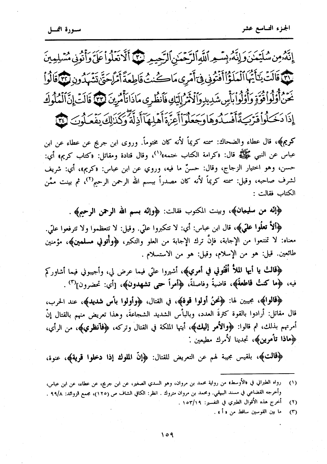 {إِنَّهُ مِنْ سُلَيْمَانَ} وَبَيَّنَتِ الْمَكْتُوبَ فَقَالَتْ: {وَإِنَّهُ بِسْمِ اللَّهِ الرَّحْمَنِ الرَّحِيمِ} {أَلَّا تَعْلُوا عَلَيَّ} قَالَ ابْنُ عَبَّاسٍ: أَيْ: لَا تَتَكَبَّرُوا عَلَيَّ. وَقِيلَ: لَا تَتَعَظَّمُوا وَلَا تَتَرَفَّعُوا عَلَيَّ. مَعْنَاهُ: لَا تَمْتَنِعُوا مِنَ الْإِجَابَةِ، فَإِنَّ تَرْكَ الْإِجَابَةِ مِنَ الْعُلُوِّ وَالتَّكَبُّرِ، {وَأْتُونِي مُسْلِمِينَ} مُؤْمِنِينَ طَائِعِينَ. قِيلَ: هُوَ مِنَ الْإِسْلَامِ، وَقِيلَ: هُوَ مِنَ الِاسْتِسْلَامِ. {قَالَتْ يَا أَيُّهَا الْمَلَأُ أَفْتُونِي فِي أَمْرِي} أَشِيرُوا عَلَيَّ فِيمَا عَرَضَ لِي، وَأَجِيبُونِي فِيمَا أُشَاوِرُكُمْ فِيهِ، {مَا كُنْتُ قَاطِعَةً} قَاضِيَةً وَفَاصِلَةً، {أَمْرًا حَتَّى تَشْهَدُونِ} [أَيْ: تَحْضُرُونِ] (3) . {قَالُوا} مُجِيبِينَ لَهَا: {نَحْنُ أُولُو قُوَّةٍ} فِي الْقِتَالِ، {وَأُولُو بَأْسٍ شَدِيدٍ} عِنْدَ الْحَرْبِ، قَالَ مُقَاتِلٌ: أَرَادُوا بِالْقُوَّةِ كَثْرَةَ الْعَدَدِ، وَبِالْبَأْسِ الشَّدِيدِ الشَّجَاعَةَ، وَهَذَا تَعْرِيضٌ مِنْهُمْ بِالْقِتَالِ إِنْ أَمَرَتْهُمْ بِذَلِكَ، ثُمَّ قَالُوا: {وَالْأَمْرُ إِلَيْكِ} أَيَّتُهَا الْمَلِكَةُ فِي الْقِتَالِ وَتَرْكِهِ، {فَانْظُرِي} مِنَ الرَّأْيِ، {مَاذَا تَأْمُرِينَ} تَجِدِينَا لِأَمْرِكِ مُطِيعِينَ. {قَالَتْ} بِلْقِيسُ مُجِيبَةً لَهُمْ عَنِ التَّعْرِيضِ لِلْقِتَالِ: {إِنَّ الْمُلُوكَ إِذَا دَخَلُوا قَرْيَةً} عَنْوَةً،