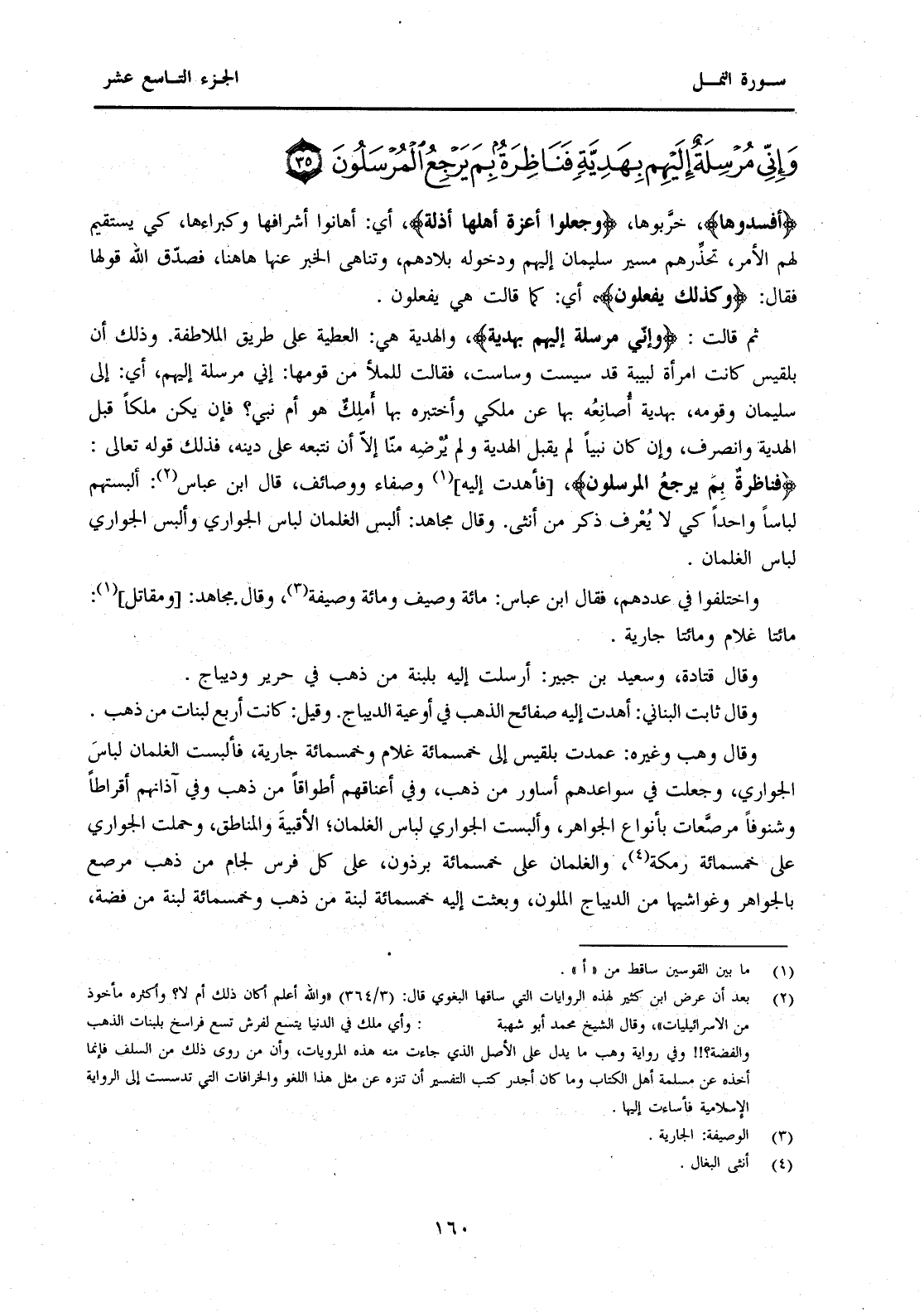 ثُمَّ قَالَتْ: {وَإِنِّي مُرْسِلَةٌ إِلَيْهِمْ بِهَدِيَّةٍ} وَالْهَدِيَّةُ هِيَ: الْعَطِيَّةُ عَلَى طَرِيقِ الْمُلَاطَفَةِ. وَذَلِكَ أَنَّ بِلْقِيسَ كَانَتِ امْرَأَةً لَبِيبَةً قَدْ سَيِسَتْ وَسَاسَتْ، فَقَالَتْ لِلْمَلَأِ مِنْ قَوْمِهَا: إِنِّي مُرْسِلَةٌ إِلَيْهِمْ، أَيْ: إِلَى سُلَيْمَانَ وَقَوْمِهِ، بِهَدِيَّةٍ أُصَانِعُهُ بِهَا عَنْ مُلْكِي وَأَخْتَبِرُهُ بِهَا أَمَلِكٌ هُوَ أَمْ نَبِيٌّ؟ فَإِنْ يَكُنْ مَلِكًا قَبِلَ الْهَدِيَّةَ وَانْصَرَفَ، وَإِنْ كَانَ نَبيًا لَمْ يَقْبَلِ الْهَدِيَّةَ وَلَمْ يُرْضِهِ مِنَّا إِلَّا أَنْ نَتَّبِعَهُ عَلَى دِينِهِ، فَذَلِكَ قَوْلُهُ تَعَالَى: {فَنَاظِرَةٌ بِمَ يَرْجِعُ الْمُرْسَلُونَ} [فَأَهْدَتْ إِلَيْهِ] (1) وُصَفَاءَ وَوَصَائِفَ، قَالَ ابْنُ عَبَّاسٍ (2) أَلْبَسَتْهُمْ لِبَاسًا وَاحِدًا كَيْ لَا يُعْرَفَ ذَكَرٌ مِنْ أُنْثَى. وَقَالَ مُجَاهِدٌ: أُلْبِسَ الْغِلْمَانُ لِبَاسَ الْجَوَارِي وَأُلْبِسَ الْجَوَارِي لِبَاسَ الْغِلْمَانِ. وَاخْتَلَفُوا فِي عَدَدِهِمْ، فَقَالَ ابْنُ عَبَّاسٍ: مِائَةُ وَصِيفٍ وَمِائَةُ وَصِيفَةٍ (3) وَقَالَ مُجَاهِدٌ: [وَمُقَاتِلٌ] (4) مِائَتَا غُلَامٍ وَمِائَتَا جَارِيَةٍ.