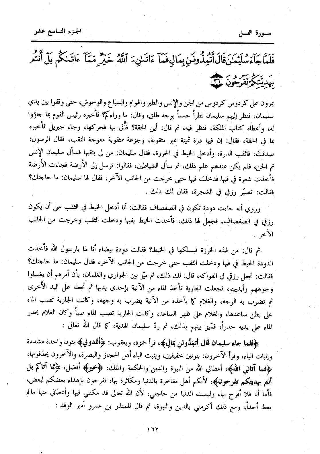 {فَلَمَّا جَاءَ سُلَيْمَانَ قَالَ أَتُمِدُّونَنِي بِمَالٍ} قَرَأَ حَمْزَةُ، وَيَعْقُوبُ: " أَتُمِدُّونِّي " بِنُونٍ وَاحِدَةٍ مُشَدَّدَةٍ وَإِثْبَاتِ الْيَاءِ، وَقَرَأَ الْآخَرُونَ: بِنُونَيْنِ خَفِيفَيْنِ، وَيُثْبِتُ الْيَاءَ أَهْلُ الْحِجَازِ وَالْبَصْرَةِ، وَالْآخَرُونَ يَحْذِفُونَهَا، {فَمَا آتَانِيَ اللَّهُ} أَعْطَانِيَ اللَّهُ مِنَ النُّبُوَّةِ وَالدِّينِ وَالْحِكْمَةِ وَالْمُلْكِ، {خَيْرٌ} أَفْضَلُ، {مِمَّا آتَاكُمْ بَلْ أَنْتُمْ بِهَدِيَّتِكُمْ تَفْرَحُونَ} لِأَنَّكُمْ أَهْلُ مُفَاخَرَةٍ فِي الدُّنْيَا وَمُكَاثَرَةٍ بِهَا، تَفْرَحُونَ بِإِهْدَاءِ بَعْضِكُمْ لِبَعْضٍ، فَأَمَّا أَنَا فَلَا أَفْرَحُ بِهَا، وَلَيْسَتِ الدُّنْيَا مِنْ حَاجَتِي، لِأَنَّ اللَّهَ تَعَالَى قَدْ مَكَّنَنِي فِيهَا وَأَعْطَانِي مِنْهَا مَا لَمْ يُعْطِ أَحَدًا، وَمَعَ ذَلِكَ أَكْرَمَنِي بِالدِّينِ وَالنُّبُوَّةِ، ثُمَّ قَالَ لِلْمُنْذِرِ بْنِ عَمْرٍو وَأَمِيرِ الْوَفْدِ: {ارْجِعْ إِلَيْهِمْ}