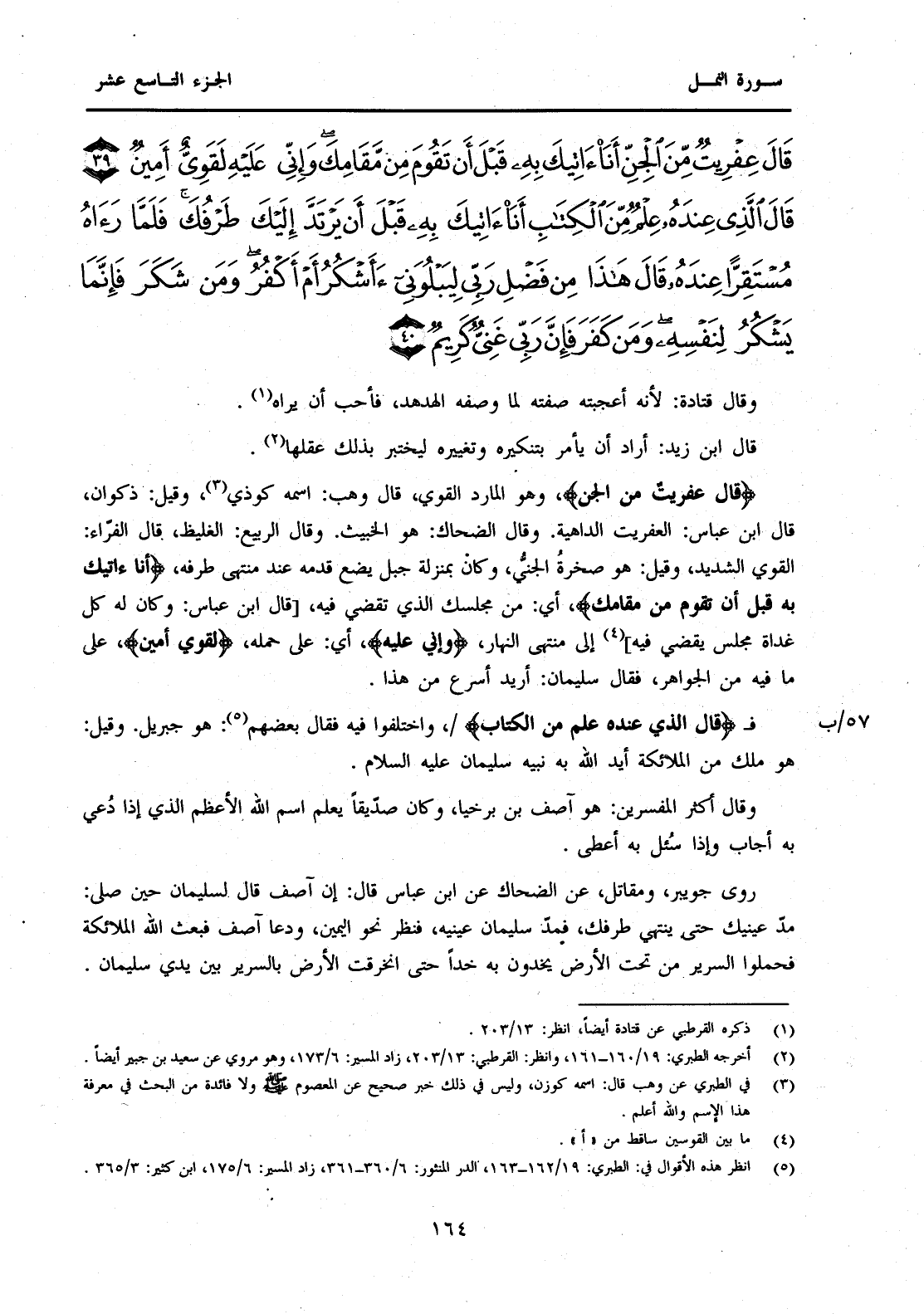 {قَالَ عِفْرِيتٌ مِنَ الْجِنِّ} وَهُوَ الْمَارِدُ الْقَوِيُّ، قَالَ وَهْبٌ: اسْمُهُ كُوذَى (3) وَقِيلَ: ذَكْوَانُ، قَالَ ابْنُ عَبَّاسٍ: الْعِفْرِيتُ الدَّاهِيَةُ. وَقَالَ الضَّحَّاكُ: هُوَ الْخَبِيثُ. وَقَالَ الرَّبِيعُ: الْغَلِيظُ، قَالَ الْفَرَّاءُ: الْقَوِيُّ الشَّدِيدُ، وَقِيلَ: هُوَ صَخْرَةُ الْجِنِّيِّ، وَكَانَ بِمَنْزِلَةِ جَبَلٍ يَضَعُ قَدَمَهُ عِنْدَ مُنْتَهَى طَرَفِهِ، {أَنَا آتِيكَ بِهِ قَبْلَ أَنْ تَقُومَ مِنْ مَقَامِكَ} أَيْ: مِنْ مَجْلِسِكَ الَّذِي تَقْضِي فِيهِ، [قَالَ ابْنُ عَبَّاسٍ: وَكَانَ لَهُ كُلَّ غَدَاةٍ مَجْلِسٌ يَقْضِي فِيهِ] (4) إِلَى مُنْتَهَى النَّهَارِ، {وَإِنِّي عَلَيْهِ} أَيْ: عَلَى حَمْلِهِ، {لَقَوِيٌّ أَمِينٌ} عَلَى مَا فِيهِ مِنَ الْجَوَاهِرِ، فَقَالَ سُلَيْمَانُ: أُرِيدُ أَسْرَعَ من هذا. فـ {قَالَ الَّذِي عِنْدَهُ عِلْمٌ مِنَ الْكِتَابِ} 57/ب وَاخْتَلَفُوا فِيهِ فَقَالَ بَعْضُهُمْ (5) هُوَ جِبْرِيلُ. وَقِيلَ: هُوَ مَلَكٌ مِنَ الْمَلَائِكَةِ أَيَّدَ اللَّهُ بِهِ نَبِيَّهُ سُلَيْمَانَ عَلَيْهِ السَّلَامُ. وَقَالَ أَكْثَرُ الْمُفَسِّرِينَ: هُوَ آصف بن برخيا، وَكَانَ صَدِيقًا يَعْلَمُ اسْمَ اللَّهِ الْأَعْظَمِ الَّذِي إِذَا دُعِيَ بِهِ أَجَابَ وَإِذَا سُئِلَ بِهِ أَعْطَى. وَرَوَى جُوَيْبِرٌ، وَمُقَاتِلٌ، عَنِ الضَّحَّاكِ عَنِ ابْنِ عَبَّاسٍ قَالَ: إِنَّ آصَفَ قَالَ لِسُلَيْمَانَ حِينَ صَلَّى: مُدَّ عَيْنَيْكَ حَتَّى يَنْتَهِيَ طَرْفُكَ، فَمَدَّ سُلَيْمَانُ عَيْنَيْهِ، فَنَظَرَ نَحْوَ الْيَمِينِ، وَدَعَا آصَفُ فَبَعَثَ اللَّهُ الْمَلَائِكَةَ فَحَمَلُوا السَّرِيرَ مِنْ تَحْتِ الْأَرْضِ يَخُدُّونَ بِهِ خَدًّا حَتَّى انْخَرَقَتِ الْأَرْضُ بِالسَّرِيرِ بَيْنَ يَدَيْ سُلَيْمَانَ.