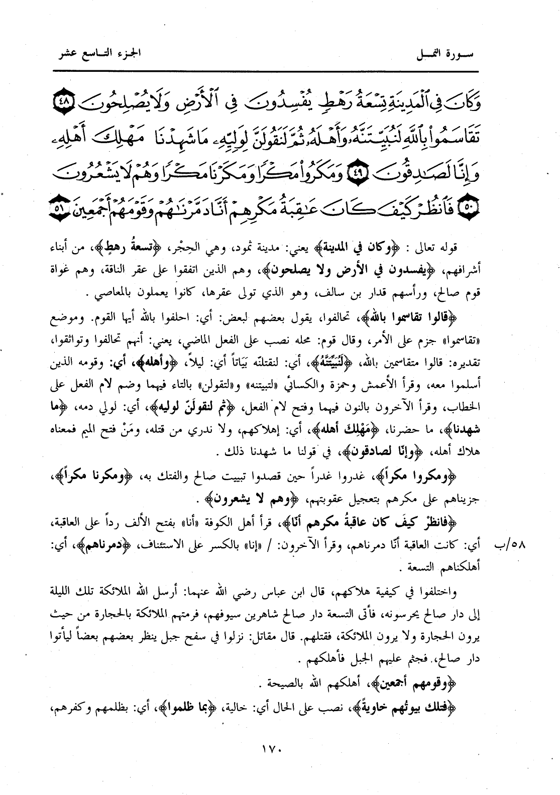 قَوْلُهُ تَعَالَى: {وَكَانَ فِي الْمَدِينَةِ} يَعْنِي: مَدِينَةَ ثَمُودَ، وَهِيَ الْحِجْرُ، {تِسْعَةُ رَهْطٍ} مِنْ أَبْنَاءِ أَشْرَافِهِمْ، {يُفْسِدُونَ فِي الْأَرْضِ وَلَا يُصْلِحُونَ} وَهُمُ الَّذِينَ اتَّفَقُوا عَلَى عَقْرِ النَّاقَةِ، وَهُمْ غُوَاةُ قَوْمِ صَالِحٍ، وَرَأْسُهُمْ قِدَارُ بْنُ سَالِفٍ، وَهُوَ الَّذِي تَوَلَّى عَقْرَهَا، كَانُوا يَعْمَلُونَ بِالْمَعَاصِي. قَالُوا {تَقَاسَمُوا بِاللَّهِ} تَحَالَفُوا، يَقُولُ بَعْضُهُمْ لِبَعْضٍ: أَيْ: احْلِفُوا بِاللَّهِ أَيُّهَا الْقَوْمُ. وَمَوْضِعُ "تَقَاسَمُوا" جُزِمَ عَلَى الْأَمْرِ، وَقَالَ قَوْمٌ: مَحَلُّهُ نَصْبٌ عَلَى الْفِعْلِ الْمَاضِي، يَعْنِي: أَنَّهُمْ تَحَالَفُوا وَتَوَاثَقُوا، تَقْدِيرُهُ: قَالُوا مُتَقَاسِمِينَ بِاللَّهِ، {لَنُبَيِّتَنَّهُ} أَيْ: لِنَقْتُلَنَّهُ بَيَاتًا أَيْ: لَيْلًا {وَأَهْلَهُ} أَيْ: وَقَوْمَهُ الَّذِينَ أَسْلَمُوا مَعَهُ، وَقَرَأَ الْأَعْمَشُ وَحَمْزَةُ وَالْكِسَائِيُّ "لَتُبَيِّتُنَّهُ" وَ"لَتَقُولُنَّ" بِالتَّاءِ فِيهِمَا وَضَمِّ لَامِ الْفِعْلِ عَلَى الْخِطَابِ، وَقَرَأَ الْآخَرُونَ بِالنُّونِ فِيهِمَا وَفَتَحِ لَامِ الْفِعْلِ، {ثُمَّ لَنَقُولَنَّ لِوَلِيِّهِ} أَيْ: لِوَلِيِّ دَمِهِ، {مَا شَهِدْنَا} مَا حَضَرْنَا، {مَهْلِكَ أَهْلِهِ} أَيْ: إِهْلَاكَهُمْ، وَلَا نَدْرِي مَنْ قَتَلَهُ، وَمَنْ فَتَحَ الْمِيمَ فَمَعْنَاهُ هَلَاكُ أَهْلِهِ، {وَإِنَّا لَصَادِقُونَ} فِي قَوْلِنَا مَا شَهِدْنَا ذَلِكَ. {وَمَكَرُوا مَكْرًا} غَدَرُوا غَدْرًا حِينَ قَصَدُوا تَبْيِيتَ صَالِحٍ وَالْفَتْكَ بِهِ، {وَمَكَرْنَا مَكْرًا} جَزَيْنَاهُمْ عَلَى مَكْرِهِمْ بِتَعْجِيلِ عُقُوبَتِهِمْ، {وَهُمْ لَا يَشْعُرُونَ} {فَانْظُرْ كَيْفَ كَانَ عَاقِبَةُ مَكْرِهِمْ أَنَّا} قَرَأَ أَهْلُ الْكُوفَةِ "أَنَّا" بِفَتْحِ الْأَلِفِ رَدًّا عَلَى الْعَاقِبَةِ، أَيْ: كَانَتِ الْعَاقِبَةُ أَنَّا دَمَّرْنَاهُمْ، وقرأ الآخرون: 58/ب "إِنَّا" بالكسر على الاسئناف، {دَمَّرْنَاهُمْ} أَيْ: أَهْلَكْنَاهُمُ التِّسْعَةَ. وَاخْتَلَفُوا فِي كَيْفِيَّةِ هَلَاكِهِمْ، قَالَ ابْنُ عَبَّاسٍ رَضِيَ اللَّهُ عَنْهُمَا: أَرْسَلَ اللَّهُ الْمَلَائِكَةَ تِلْكَ اللَّيْلَةَ إِلَى دَارِ صَالِحٍ يَحْرُسُونَهُ، فَأَتَى التِّسْعَةُ دَارَ صَالِحٍ شَاهِرِينَ سُيُوفَهُمْ، فَرَمَتْهُمُ الْمَلَائِكَةُ بِالْحِجَارَةِ مِنْ حَيْثُ يَرَوْنَ الْحِجَارَةَ وَلَا يَرَوْنَ الْمَلَائِكَةَ، فَقَتَلَهُمْ. قَالَ مُقَاتِلٌ: نَزَلُوا فِي سَفْحِ جَبَلٍ يَنْظُرُ بَعْضُهُمْ بَعْضًا لِيَأْتُوا دَارَ صَالِحٍ، فَجَثَمَ عَلَيْهِمُ الْجَبَلُ فَأَهْلَكَهُمْ. {وَقَوْمَهُمْ أَجْمَعِينَ} أَهْلَكَهُمُ اللَّهُ بِالصَّيْحَةِ.