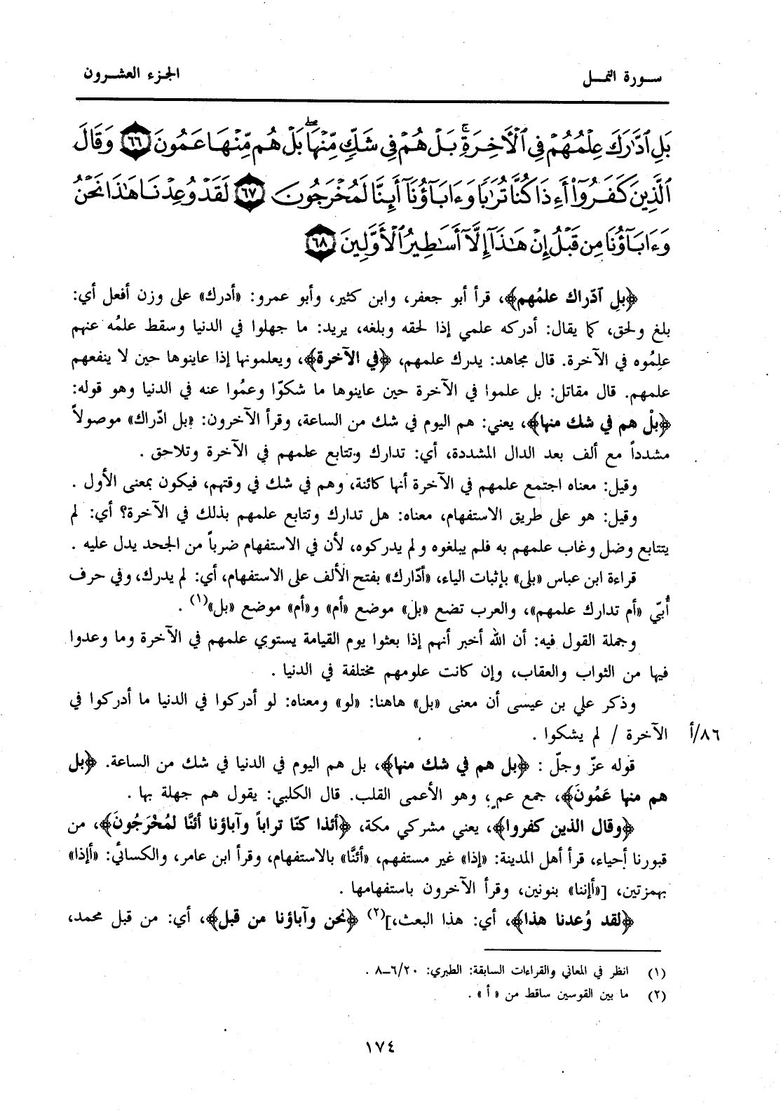{بَلِ ادَّارَكَ عِلْمُهُمْ} قَرَأَ أَبُو جَعْفَرٍ، وَابْنُ كَثِيرٍ، وَأَبُو عَمْرٍو: "أَدْرَكَ" عَلَى وَزْنِ أَفْعَلَ أَيْ: بَلَغَ وَلَحِقَ، كَمَا يُقَالُ: أَدْرَكَهُ عِلْمِي إِذَا لَحِقَهُ وَبَلَغَهُ، يُرِيدُ: مَا جَهِلُوا فِي الدُّنْيَا وَسَقَطَ عِلْمُهُ عَنْهُمْ عَلِمُوهُ فِي الْآخِرَةِ. قَالَ مُجَاهِدٌ: يُدْرِكُ عِلْمَهُمْ، {فِي الْآخِرَةِ} وَيَعْلَمُونَهَا إِذَا عَايَنُوهَا حِينَ لَا يَنْفَعُهُمْ عِلْمُهُمْ. قَالَ مُقَاتِلٌ: بَلْ عَلِمُوا فِي الْآخِرَةِ حِينَ عَايَنُوهَا مَا شَكُّوا وَعَمُوا عَنْهُ فِي الدُّنْيَا وَهُوَ قَوْلُهُ: {بَلْ هُمْ فِي شَكٍّ مِنْهَا} يَعْنِي: هُمُ الْيَوْمَ فِي شَكٍّ مِنَ السَّاعَةِ، وَقَرَأَ الآخرون: "بل أدراك" مَوْصُولًا مُشَدَّدًا مَعَ أَلْفٍ بَعْدَ الدَّالِ الْمُشَدَّدَةِ، أَيْ: تَدَارَكَ وَتَتَابَعَ عِلْمُهُمْ فِي الْآخِرَةِ وَتَلَاحَقَ. وَقِيلَ: مَعْنَاهُ اجْتَمَعَ عِلْمُهُمْ فِي الْآخِرَةِ أَنَّهَا كَائِنَةٌ، وَهُمْ فِي شَكٍّ فِي وَقْتِهِمْ، فَيَكُونُ بِمَعْنَى الْأَوَّلِ. وَقِيلَ: هُوَ عَلَى طَرِيقِ الِاسْتِفْهَامِ، مَعْنَاهُ: هَلْ تَدَارَكَ وَتَتَابَعَ عِلْمُهُمْ بِذَلِكَ فِي الْآخِرَةِ؟ أَيْ: لَمْ يَتَتَابَعْ وَضَلَّ وَغَابَ عِلْمُهُمْ بِهِ فَلَمْ يَبْلُغُوهُ وَلَمْ يُدْرِكُوهُ، لِأَنَّ فِي الِاسْتِفْهَامِ ضَرْبًا مِنَ الْجَحْدِ يَدُلُّ عَلَيْهِ. قِرَاءَةُ ابْنِ عَبَّاسٍ "بَلَى" بِإِثْبَاتِ الْيَاءِ، "أَدَّارَكَ" بِفَتْحِ الْأَلِفِ عَلَى الِاسْتِفْهَامِ، أَيْ: لَمْ يُدْرَكْ، وَفِي حَرْفِ أُبَي "أم تدرك عِلْمُهُمْ"، وَالْعَرَبُ تَضَعُ "بَلْ" مَوْضِعَ "أَمْ" وَ"أَمْ" مَوْضِعَ "بَلْ" (1) وَجُمْلَةُ الْقَوْلِ فِيهِ: أَنَّ اللَّهَ أَخْبَرَ أَنَّهُمْ إِذَا بُعِثُوا يَوْمَ الْقِيَامَةِ يَسْتَوِي عِلْمُهُمْ فِي الْآخِرَةِ وَمَا وُعِدُوا فِيهَا مِنَ الثَّوَابِ وَالْعِقَابِ، وَإِنْ كَانَتْ عُلُومُهُمْ مُخْتَلِفَةً فِي الدُّنْيَا. وَذَكَرَ عَلِيُّ بْنُ عِيسَى أَنَّ مَعْنَى "بَلْ" هَاهُنَا: "لَوْ" وَمَعْنَاهُ: لَوْ أَدْرَكُوا فِي الدُّنْيَا مَا أَدْرَكُوا في الآخرة 59/ألَمْ يَشُكُّوا.