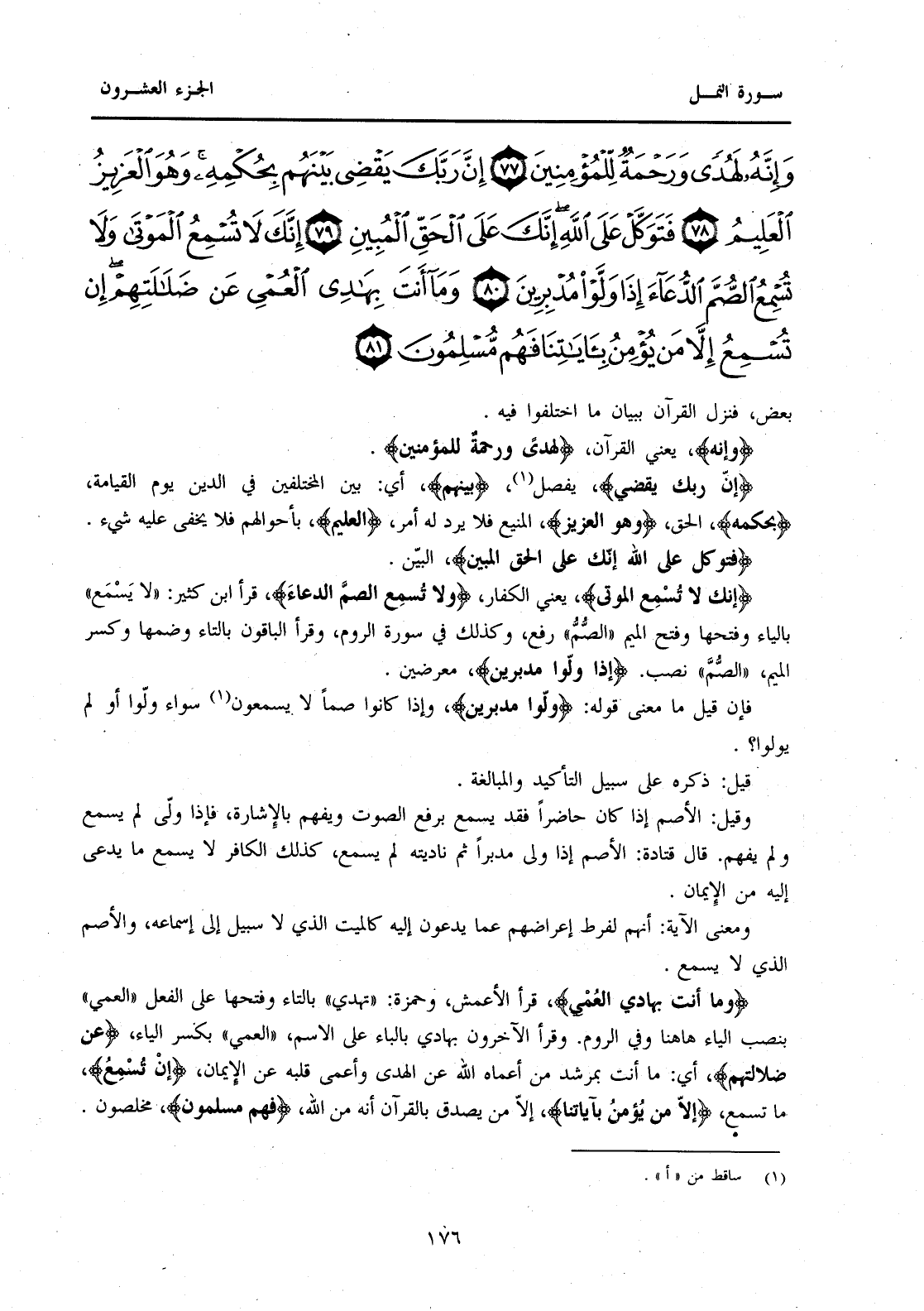 {وَإِنَّهُ لَهُدًى وَرَحْمَةٌ لِلْمُؤْمِنِينَ (77) إِنَّ رَبَّكَ يَقْضِي بَيْنَهُمْ بِحُكْمِهِ وَهُوَ الْعَزِيزُ الْعَلِيمُ (78) فَتَوَكَّلْ عَلَى اللَّهِ إِنَّكَ عَلَى الْحَقِّ الْمُبِينِ (79) إِنَّكَ لَا تُسْمِعُ الْمَوْتَى وَلَا تُسْمِعُ الصُّمَّ الدُّعَاءَ إِذَا وَلَّوْا مُدْبِرِينَ (80) وَمَا أَنْتَ بِهَادِي الْعُمْيِ عَنْ ضَلَالَتِهِمْ إِنْ تُسْمِعُ إِلَّا مَنْ يُؤْمِنُ بِآيَاتِنَا فَهُمْ مُسْلِمُونَ (81) }