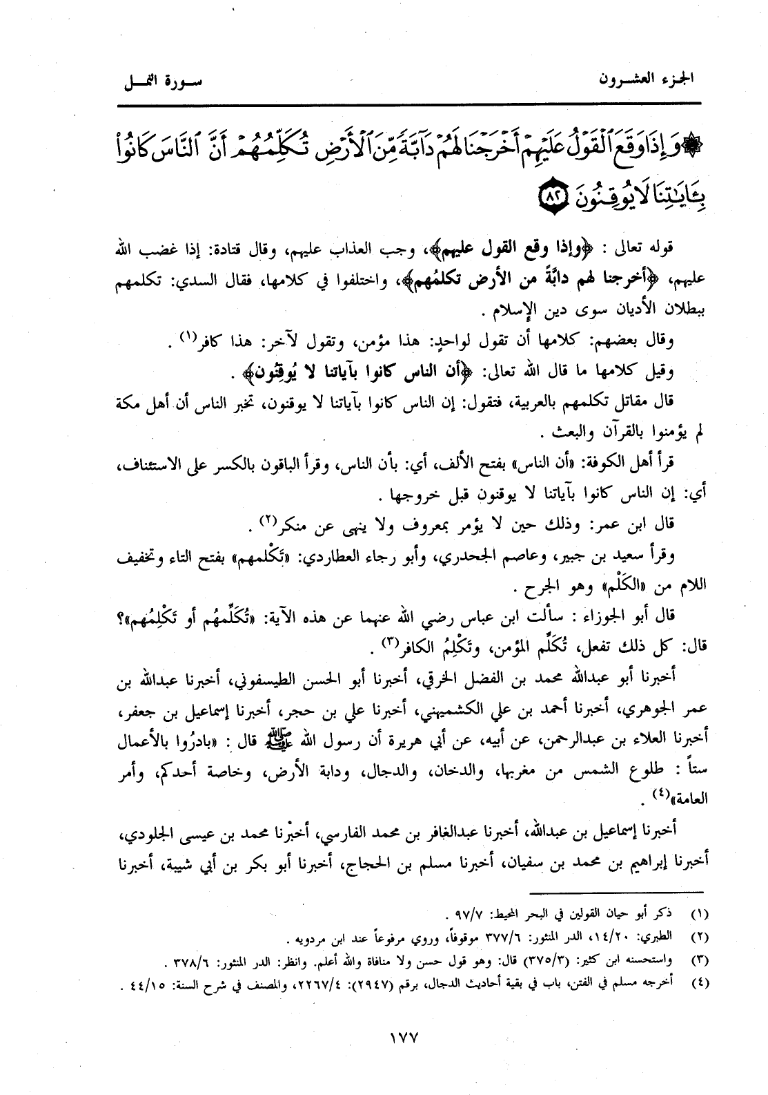 قَرَأَ أَهْلُ الْكُوفَةِ: "أَنَّ النَّاسَ" بِفَتْحِ الْأَلِفِ، أَيْ: بِأَنَّ النَّاسَ، وَقَرَأَ الْبَاقُونَ بِالْكَسْرِ عَلَى الِاسْتِئْنَافِ، أَيْ: إِنَّ النَّاسَ كَانُوا بِآيَاتِنَا لَا يُوقِنُونَ قَبْلَ خُرُوجِهَا. قَالَ ابْنُ عُمَرَ: وَذَلِكَ حِينَ لَا يُؤْمَرُ بِمَعْرُوفٍ وَلَا يُنْهَى عَنْ مُنْكَرٍ (2) . وَقَرَأَ سَعِيدُ بْنُ جُبَيْرٍ، وَعَاصِمُ الْجَحْدَرَيُّ، وَأَبُو رَجَاءٍ الْعُطَارِدِيُّ: "تَكْلِمُهُمْ" بِفَتْحِ التَّاءِ وَتَخْفِيفِ اللَّامِ مِنَ "الْكَلْمِ" وَهُوَ الْجُرْحُ. قَالَ أَبُو الْجَوْزَاءِ: سَأَلْتُ ابْنَ عَبَّاسٍ رَضِيَ اللَّهُ عَنْهُمَا عَنْ هَذِهِ الْآيَةِ: "تُكَلِّمُهُمْ أَوْ تَكْلِمُهُمُ"؟ قَالَ: كُلُّ ذَلِكَ تَفْعَلُ، تُكَلِّمُ الْمُؤْمِنَ، وَتَكْلِمُ الْكَافِرَ (3) . أَخْبَرَنَا أَبُو عَبْدِ اللَّهِ مُحَمَّدُ بْنُ الْفَضْلِ الْخَرَقِيُّ، أَخْبَرَنَا أَبُو الْحَسَنِ الطَّيْسَفُونِيُّ، أَخْبَرَنَا عَبْدُ اللَّهِ بْنُ عُمَرَ الْجَوْهَرِيُّ، أَخْبَرَنَا أَحْمَدُ بْنُ عَلِيٍّ الْكُشْمِيهَنِيُّ، أَخْبَرَنَا عَلِيُّ بْنُ حُجْرٍ، أَخْبَرَنَا إِسْمَاعِيلُ بْنُ جَعْفَرٍ، أَخْبَرَنَا الْعَلَاءُ بْنُ عَبْدِ الرَّحْمَنِ، عَنْ أَبِيهِ، عَنْ أَبِي هُرَيْرَةَ أَنَّ رَسُولَ اللَّهِ صَلَّى اللَّهُ عَلَيْهِ وَسَلَّمَ قَالَ: "بَادِرُوا بِالْأَعْمَالِ سِتًا: طُلُوعَ الشَّمْسِ مِنْ مَغْرِبِهَا، وَالدُّخَانَ، وَالدَّجَّالَ، وَدَابَّةَ الْأَرْضِ، وَخَاصَّةَ أَحَدِكُمْ، وَأَمْرَ الْعَامَّةِ" (4) . أَخْبَرَنَا إِسْمَاعِيلُ بْنُ عَبْدِ اللَّهِ، أَخْبَرَنَا عَبْدُ الْغَافِرِ بْنُ مُحَمَّدٍ الْفَارِسِيُّ، أَخْبَرَنَا مُحَمَّدُ بْنُ عِيسَى الْجُلُودِيُّ، أَخْبَرَنَا إِبْرَاهِيمُ بْنُ مُحَمَّدِ بْنِ سُفْيَانَ، أَخْبَرَنَا مُسْلِمُ بْنُ الْحَجَّاجِ، أَخْبَرَنَا أَبُو بَكْرِ بْنُ أَبِي شَيْبَةَ، أَخْبَرَنَا