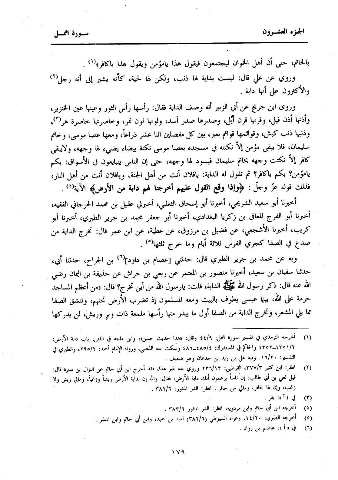 أَخْبَرَنَا أَبُو سَعِيدٍ الشُّرَيْحِيُّ، أَخْبَرَنَا أَبُو إِسْحَاقَ الثَّعْلَبِيُّ، أَخْبَرَنِي عَقِيلُ بْنُ مُحَمَّدٍ الْجُرْجَانِيُّ الْفَقِيهُ، أَخْبَرَنَا أَبُو الْفَرَجِ الْمُعَافَى بْنُ زَكَرِيَّا الْبَغْدَادِيُّ، أَخْبَرَنَا أَبُو جَعْفَرٍ مُحَمَّدُ بْنُ جَرِيرٍ الطَّبَرِيُّ، أَخْبَرَنَا أَبُو كُرَيْبٍ، أَخْبَرَنَا الْأَشْجَعِيُّ، عَنْ فُضَيْلِ بْنِ مَرْزُوقٍ، عَنْ عَطِيَّةَ، عَنِ ابْنِ عُمَرَ قَالَ: تَخْرُجُ الدَّابَّةُ مِنْ صَدْعٍ فِي الصَّفَا كَجَرْيِ الْفَرَسِ ثَلَاثَةَ أَيَّامٍ وَمَا خَرَجَ ثُلُثُهَا (5) . وَبِهِ عَنْ مُحَمَّدِ بْنِ جَرِيرٍ الطَّبَرِيِّ قَالَ: حَدَّثَنِي [عِصَامُ بْنُ دَاوُدَ] (6) بْنِ الْجَرَّاحِ، حَدَّثَنَا أَبِي، حَدَّثَنَا سُفْيَانُ بْنُ سَعِيدٍ، أَخْبَرَنَا مَنْصُورُ بْنُ الْمُعْتَمِرِ عَنْ رِبْعِيِّ بْنِ حِرَاشٍ عَنْ حُذَيْفَةَ بْنِ الْيَمَانِ رَضِيَ اللَّهُ عَنْهُ قَالَ: ذَكَرَ رَسُولُ اللَّهِ صَلَّى اللَّهُ عَلَيْهِ وَسَلَّمَ الدَّابَّةَ، قُلْتُ: يَا رَسُولَ اللَّهِ مِنْ أَيْنَ تَخْرُجُ؟ قَالَ: "مِنْ أَعْظَمِ الْمَسَاجِدِ حُرْمَةً عَلَى اللَّهِ، بَيْنَمَا عِيسَى يَطُوفُ بِالْبَيْتِ وَمَعَهُ الْمُسْلِمُونَ إِذْ تَضْرِبُ الْأَرْضُ تَحْتَهُمْ، وَتَنْشَقُّ الصَّفَا مِمَّا يَلِي الْمَشْعَرِ، وَتَخْرُجُ الدَّابَّةُ مِنَ الصَّفَا أَوَّلَ مَا يَبْدُرُ مِنْهَا رَأْسُهَا مُلَمَّعَةً ذَاتَ وَبَرٍ وَرِيشٍ، لَنْ يُدْرِكَهَا