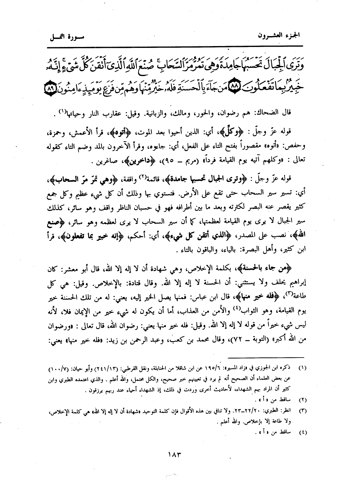 قَوْلُهُ عَزَّ وَجَلَّ: {وَتَرَى الْجِبَالَ تَحْسَبُهَا جَامِدَةً} قَائِمَةً (1) وَاقِفَةً، {وَهِيَ تَمُرُّ مَرَّ السَّحَابِ} أَيْ: تَسِيرُ سَيْرَ السَّحَابِ حَتَّى تَقَعَ عَلَى الْأَرْضِ. فَتَسْتَوِي بِهَا وَذَلِكَ أَنَّ كُلَّ شَيْءٍ عَظِيمٍ وَكُلَّ جَمْعٍ كَثِيرٍ يَقْصُرُ عَنْهُ الْبَصَرُ لِكَثْرَتِهِ وَبُعْدِ مَا بَيْنَ أَطْرَافِهِ فَهُوَ فِي حُسْبَانِ النَّاظِرِ وَاقِفٌ وَهُوَ سَائِرٌ، كَذَلِكَ سَيْرُ الْجِبَالِ لَا يُرَى يَوْمَ الْقِيَامَةِ لِعَظَمَتِهَا، كَمَا أَنَّ سَيْرَ السَّحَابِ لَا يُرَى لِعِظَمِهِ وَهُوَ سَائِرٌ، {صُنْعَ اللَّهِ} نُصِبَ عَلَى الْمَصْدَرِ، {الَّذِي أَتْقَنَ كُلَّ شَيْءٍ} أَيْ: أَحْكَمَ، {إِنَّهُ خَبِيرٌ بِمَا تَفْعَلُونَ} قَرَأَ ابْنُ كَثِيرٍ، وَأَهْلُ الْبَصْرَةِ: بِالْيَاءِ وَالْبَاقُونَ بِالتَّاءِ. {مَنْ جَاءَ بِالْحَسَنَةِ} بِكَلِمَةِ الْإِخْلَاصِ، وَهِيَ شَهَادَةُ أَنْ لَا إِلَهَ إِلَّا اللَّهُ، قَالَ أَبُو مَعْشَرٍ: كَانَ إِبْرَاهِيمُ يَحْلِفُ وَلَا يَسْتَثْنِي: أَنَّ الْحَسَنَةَ لَا إِلَهَ إِلَّا اللَّهُ. وَقَالَ قَتَادَةُ: بالإخلاص. وقيل: هل كَلُّ طَاعَةٍ (2) {فَلَهُ خَيْرٌ مِنْهَا} قَالَ ابْنُ عَبَّاسٍ: فَمِنْهَا يَصِلُ الْخَيْرُ إِلَيْهِ، يَعْنِي: لَهُ مِنْ تِلْكَ الْحَسَنَةِ خَيْرُ يَوْمِ الْقِيَامَةِ، وَهُوَ الثَّوَابُ (3) وَالْأَمْنُ مِنَ الْعَذَابِ، أَمَّا أَنْ يَكُونَ لَهُ شَيْءٌ خَيْرٌ مِنَ الْإِيمَانِ فَلَا لِأَنَّهُ لَيْسَ شَيْءٌ خَيْرًا مِنْ قَوْلِهِ لَا إِلَهَ إِلَّا اللَّهُ. وَقِيلَ: فَلَهُ خَيْرٌ مِنْهَا يَعْنِي: رِضْوَانَ اللَّهِ، قَالَ تَعَالَى: "وَرِضْوَانٌ مِنَ اللَّهِ أَكْبَرُ" (التَّوْبَةِ-72) ، وَقَالَ مُحَمَّدُ بْنُ كَعْبٍ، وَعَبْدُ الرَّحْمَنِ بْنُ زَيْدٍ: "فَلَهُ خَيْرٌ مِنْهَا" يَعْنِي:
