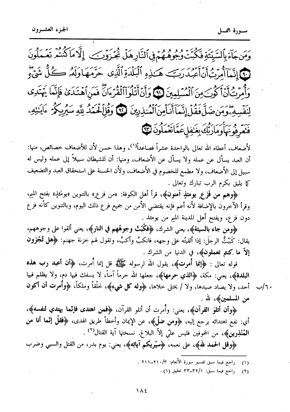 {وَمَنْ جَاءَ بِالسَّيِّئَةِ فَكُبَّتْ وُجُوهُهُمْ فِي النَّارِ هَلْ تُجْزَوْنَ إِلَّا مَا كُنْتُمْ تَعْمَلُونَ (90) إِنَّمَا أُمِرْتُ أَنْ أَعْبُدَ رَبَّ هَذِهِ الْبَلْدَةِ الَّذِي حَرَّمَهَا وَلَهُ كُلُّ شَيْءٍ وَأُمِرْتُ أَنْ أَكُونَ مِنَ الْمُسْلِمِينَ (91) وَأَنْ أَتْلُوَ الْقُرْآنَ فَمَنِ اهْتَدَى فَإِنَّمَا يَهْتَدِي لِنَفْسِهِ وَمَنْ ضَلَّ فَقُلْ إِنَّمَا أَنَا مِنَ الْمُنْذِرِينَ (92) وَقُلِ الْحَمْدُ لِلَّهِ سَيُرِيكُمْ آيَاتِهِ فَتَعْرِفُونَهَا وَمَا رَبُّكَ بِغَافِلٍ عَمَّا تَعْمَلُونَ (93) }