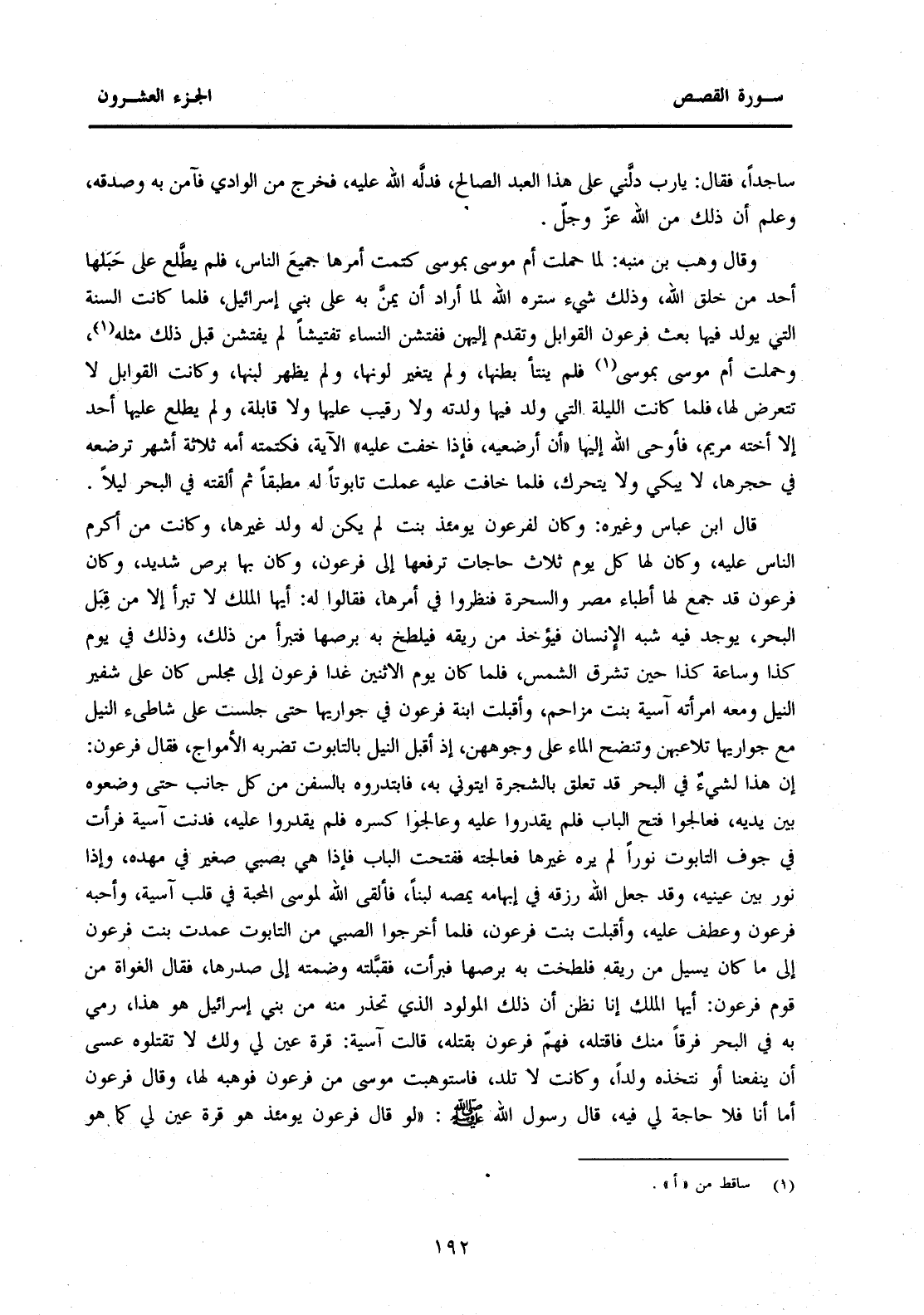 سَاجِدًا، فَقَالَ: يَا رَبِّ دُلَّنِي عَلَى هَذَا الْعَبْدِ الصَّالِحِ، فَدَلَّهُ اللَّهُ عَلَيْهِ، فَخَرَجَ مِنَ الْوَادِي فَآمَنَ بِهِ وَصَدَّقَهُ، وَعَلِمَ أَنَّ ذَلِكَ مِنَ اللَّهِ عَزَّ وَجَلَّ. وَقَالَ وَهْبُ بْنُ مُنَبِّهٍ: لَمَّا حَمَلَتْ أُمُّ مُوسَى بِمُوسَى كَتَمَتْ أَمْرَهَا جَمِيعَ النَّاسِ، فَلَمْ يَطَّلِعْ عَلَى حَبَلِهَا أَحَدٌ مِنْ خَلْقِ اللَّهِ، وَذَلِكَ شَيْءٌ سَتَرَهُ اللَّهُ لَمَّا أَرَادَ أَنْ يَمُنَّ بِهِ عَلَى بَنِي إِسْرَائِيلَ، فَلَمَّا كَانَتِ السَّنَةُ الَّتِي يُولَدُ فِيهَا بَعَثَ فِرْعَوْنُ الْقَوَابِلَ وَتَقَدَّمَ إِلَيْهِنَّ فَفَتَّشْنَ النِّسَاءَ تَفْتِيشًا لَمْ يُفَتَّشْنَ قَبْلَ ذَلِكَ مَثْلَهُ (1) ، وَحَمَلَتْ أُمُّ مُوسَى بِمُوسَى (2) فَلَمْ يَنْتَأْ بَطْنُهَا، وَلَمْ يَتَغَيَّرْ لَوْنُهَا، وَلَمْ يَظْهَرْ لَبَنُهَا، وَكَانَتِ الْقَوَابِلُ لَا تَتَعَرَّضُ لَهَا، فَلَّمَا كَانَتِ اللَّيْلَةُ الَّتِي وُلِدَ فِيهَا وَلَدَتْهُ وَلَا رَقِيبَ عَلَيْهَا وَلَا قَابِلَةَ، وَلَمْ يَطَّلِعْ عَلَيْهَا أَحَدٌ إِلَّا أُخْتُهُ مَرْيَمُ، فَأَوْحَى اللَّهُ إِلَيْهَا "أَنْ أَرَضِعَيْهِ، فَإِذَا خِفْتِ عَلَيْهِ" الْآيَةَ، فَكَتَمَتْهُ أُمُّهُ ثَلَاثَةَ أَشْهُرٍ تُرْضِعُهُ فِي حِجْرِهَا، لَا يَبْكِي وَلَا يَتَحَرَّكُ، فَلَمَّا خَافَتْ عَلَيْهِ عَمِلَتْ تَابُوتًا لَهُ مُطْبَقًا ثُمَّ أَلْقَتْهُ فِي الْبَحْرِ لَيْلًا.