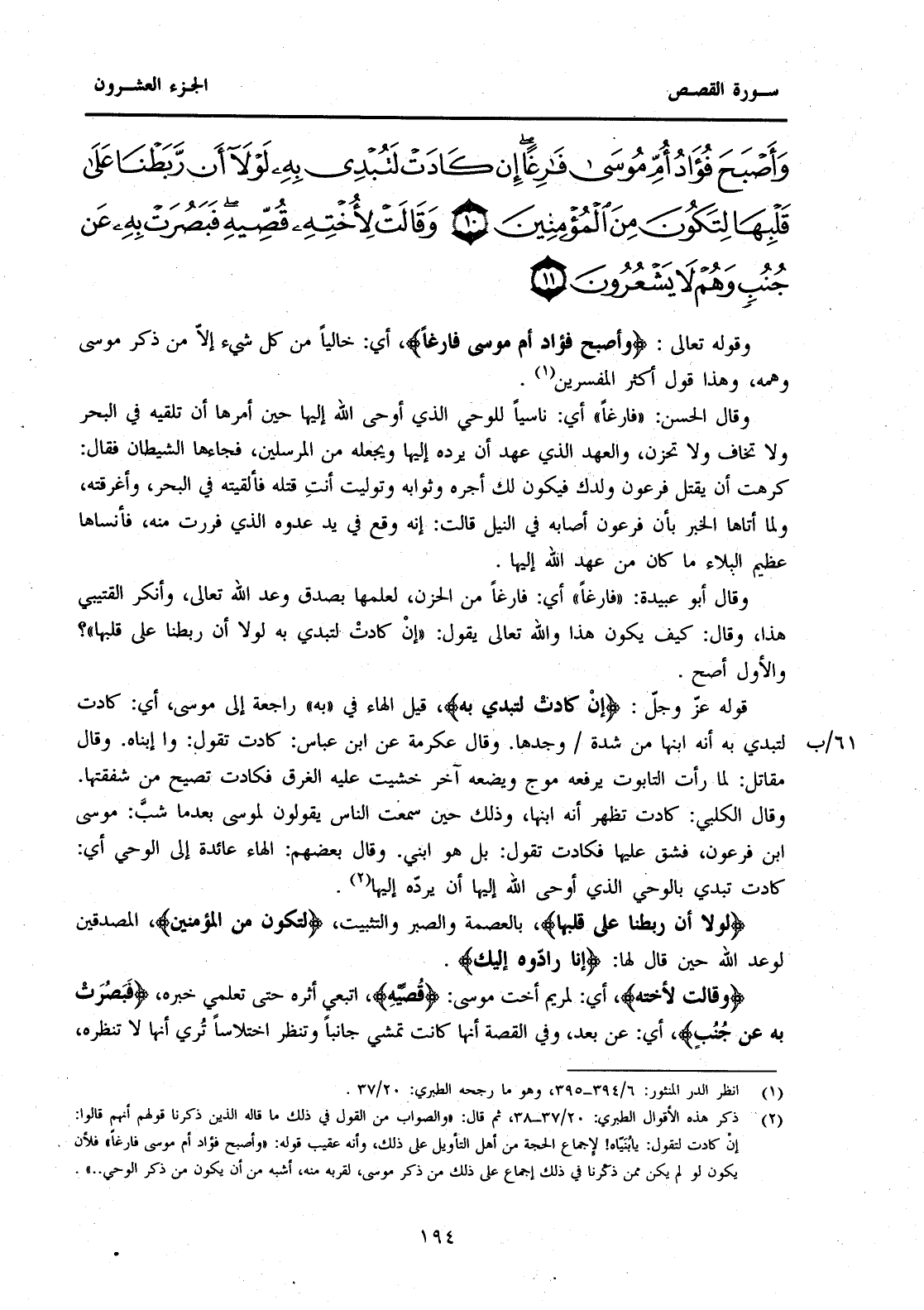 وَقَوْلُهُ تَعَالَى: {وَأَصْبَحَ فُؤَادُ أُمِّ مُوسَى فَارِغًا} أَيْ: خَالِيًا مَنْ كُلِّ شَيْءٍ إِلَّا مِنْ ذِكْرِ مُوسَى وَهَمِّهِ، وَهَذَا قَوْلُ أَكْثَرِ الْمُفَسِّرِينَ (1) . وَقَالَ الْحَسَنُ: "فَارِغًا" أَيْ: نَاسِيًا لِلْوَحْيِ الَّذِي أَوْحَى اللَّهُ إِلَيْهَا حِينَ أَمَرَهَا أَنْ تُلْقِيَهُ فِي الْبَحْرِ وَلَا تَخَافُ وَلَا تَحْزَنُ، وَالْعَهْدُ الَّذِي عَهَدَ أَنْ يَرُدَّهُ إِلَيْهَا وَيَجْعَلَهُ مِنَ الْمُرْسَلِينَ، فَجَاءَهَا الشَّيْطَانُ فَقَالَ: كَرِهْتِ أَنْ يَقْتُلَ فِرْعَوْنُ وَلَدَكِ فَيَكُونَ لَكِ أَجْرُهُ وَثَوَابُهُ وَتَوَلَّيْتِ أَنْتِ قَتْلَهُ فَأَلْقَيْتِهِ فِي الْبَحْرِ، وَأَغْرَقْتِهِ، وَلَمَّا أَتَاهَا الْخَبَرُ بِأَنَّ فِرْعَوْنَ أَصَابَهُ فِي النِّيلِ قَالَتْ: إِنَّهُ وَقَعَ فِي يَدِ عَدُوِّهِ الَّذِي فَرَرْتُ مِنْهُ، فَأَنْسَاهَا عَظِيمُ الْبَلَاءِ مَا كَانَ مِنْ عَهْدِ اللَّهِ إِلَيْهَا. وَقَالَ أَبُو عُبَيْدَةَ: "فَارِغًا" أَيْ: فَارِغًا مِنَ الْحُزْنِ، لِعِلْمِهَا بِصِدْقِ وَعْدِ اللَّهِ تَعَالَى، وَأَنْكَرَ الْقُتَيْبِيُّ هَذَا، وَقَالَ: كَيْفَ يَكُونُ هَذَا وَاللَّهُ تَعَالَى يَقُولُ: "إِنْ كَادَتْ لَتُبْدِي بِهِ لَوْلَا أَنْ رَبَطْنَا عَلَى قَلْبِهَا"؟ وَالْأَوَّلُ أَصَحُّ.