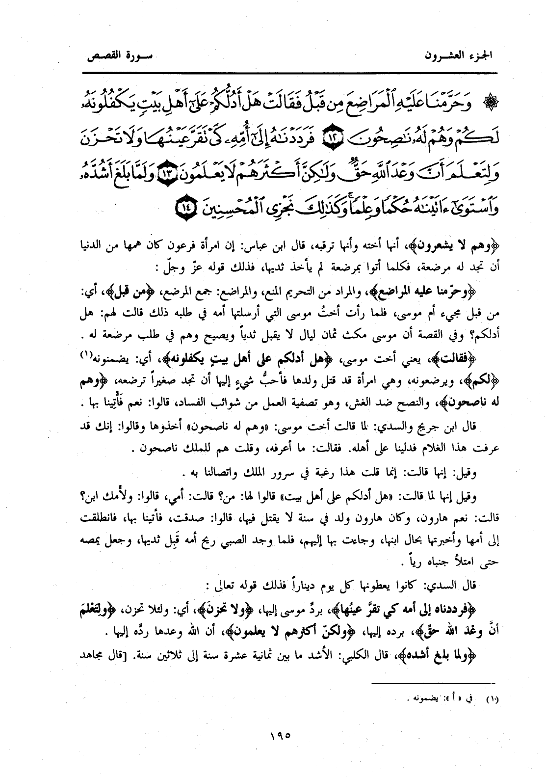 {وَحَرَّمْنَا عَلَيْهِ الْمَرَاضِعَ مِنْ قَبْلُ فَقَالَتْ هَلْ أَدُلُّكُمْ عَلَى أَهْلِ بَيْتٍ يَكْفُلُونَهُ لَكُمْ وَهُمْ لَهُ نَاصِحُونَ (12) فَرَدَدْنَاهُ إِلَى أُمِّهِ كَيْ تَقَرَّ عَيْنُهَا وَلَا تَحْزَنَ وَلِتَعْلَمَ أَنَّ وَعْدَ اللَّهِ حَقٌّ وَلَكِنَّ أَكْثَرَهُمْ لَا يَعْلَمُونَ (13) }