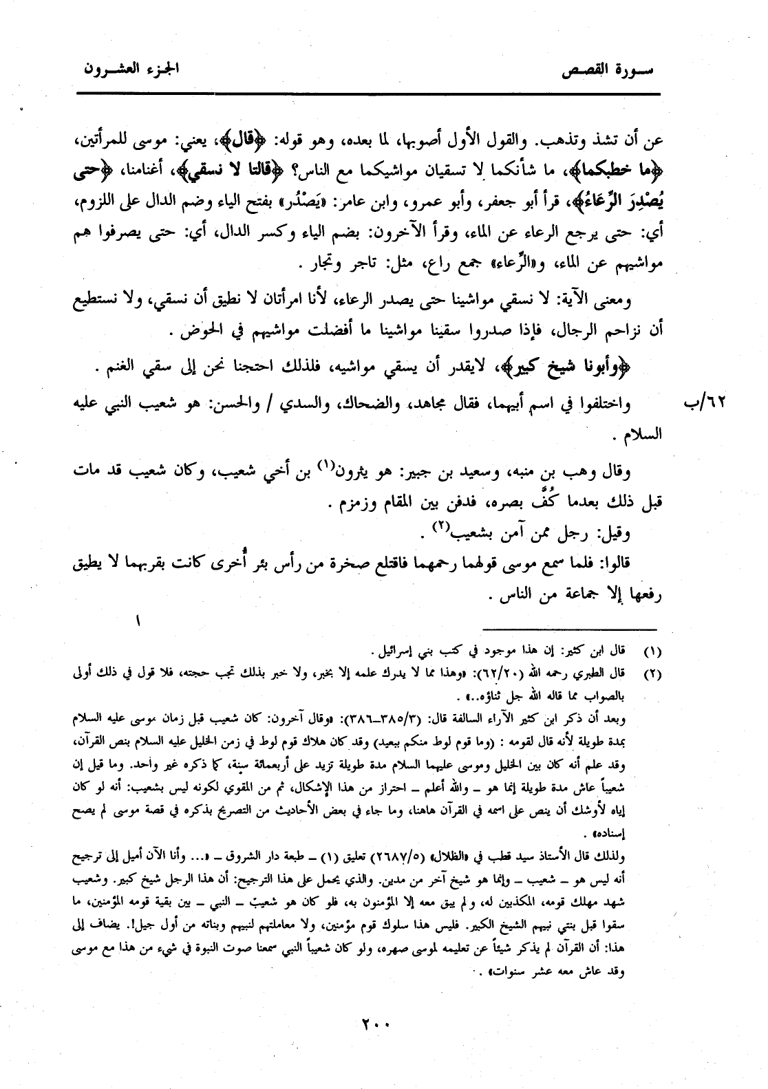عَنْ أَنْ تَشِذَّ وَتَذْهَبَ. وَالْقَوْلُ الْأَوَّلُ أَصْوَبُهَا، لِمَا بَعْدَهُ، وَهُوَ قَوْلُهُ: {قَالَ} يَعْنِي: مُوسَى لِلْمَرْأَتَيْنِ، {مَا خَطْبُكُمَا} مَا شَأْنُكُمَا لَا تَسْقِيَانِ مَوَاشِيَكُمَا مَعَ النَّاسِ؟ {قَالَتَا لَا نَسْقِي} أَغْنَامَنَا، {حَتَّى يُصْدِرَ الرِّعَاءُ} قَرَأَ أَبُو جَعْفَرٍ، وَأَبُو عَمْرٍو، وَابْنُ عَامِرٍ: "يَصْدُرَ" بِفَتْحِ الْيَاءِ وَضَمِّ الدَّالِ عَلَى اللُّزُومِ، أَيْ: حَتَّى يَرْجِعَ الرِّعَاءُ عَنِ الْمَاءِ، وَقَرَأَ الْآخَرُونَ: بِضَمِّ الْيَاءِ وَكَسْرِ الدَّالِ، أَيْ: حَتَّى يَصْرِفُوا هُمْ مَوَاشِيَهُمْ عَنِ الْمَاءِ، وَ"الرِّعَاءُ" جَمْعُ رَاعٍ، مِثَلَ: تَاجِرٍ وَتُجَّارٍ. وَمَعْنَى الْآيَةِ: لَا نَسْقِي مَوَاشِيَنَا حَتَّى يُصْدِرَ الرِّعَاءُ، لِأَنَّا امْرَأَتَانِ لَا نُطِيقُ أَنْ نَسْقِيَ، وَلَا نَسْتَطِيعُ أَنْ نُزَاحِمَ الرِّجَالَ، فَإِذَا صَدَرُوا سَقَيْنَا مَوَاشِيَنَا مَا أَفْضَلَتْ مَوَاشِيهُمْ فِي الْحَوْضِ.