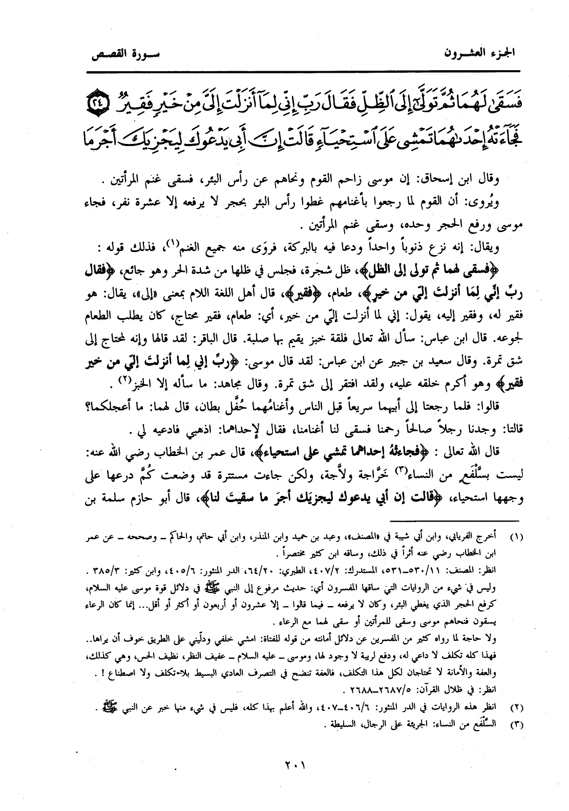 (1) أخرج الفريابي، وابن أبي شيبة في "المصنف"، وعبد بن حميد وابن المنذر، وابن المنذر، وابن أبي حاتم، والحاكم -وصححه- عن عمر ابن الخطاب رضي عنه أثرا في ذلك، وساقه ابن كثير مختصرا. انظر: المصنف: 11 / 530-531، المستدرك: 2 / 407، الطبري: 20 / 64، الدر المنثور: 6 / 405، وابن كثير: 3 / 385، وليس في شيء من الروايات التي ساقها المفسرون أي: حديث مرفوع إلى النبي صَلَّى اللَّهُ عَلَيْهِ وَسَلَّمَ في دلائل قوة موسى عليه السلام، كرفع الحجر الذي يغطي البئر، وكان لا يرفعه -فيما قالوا- إلا عشرون أو أربعون أو أكثر أو أقل ... إنما كان الرعاء يسقون فنحاهم موسى وسقى للمرأتين أو سقى لهما مع الرعاء.