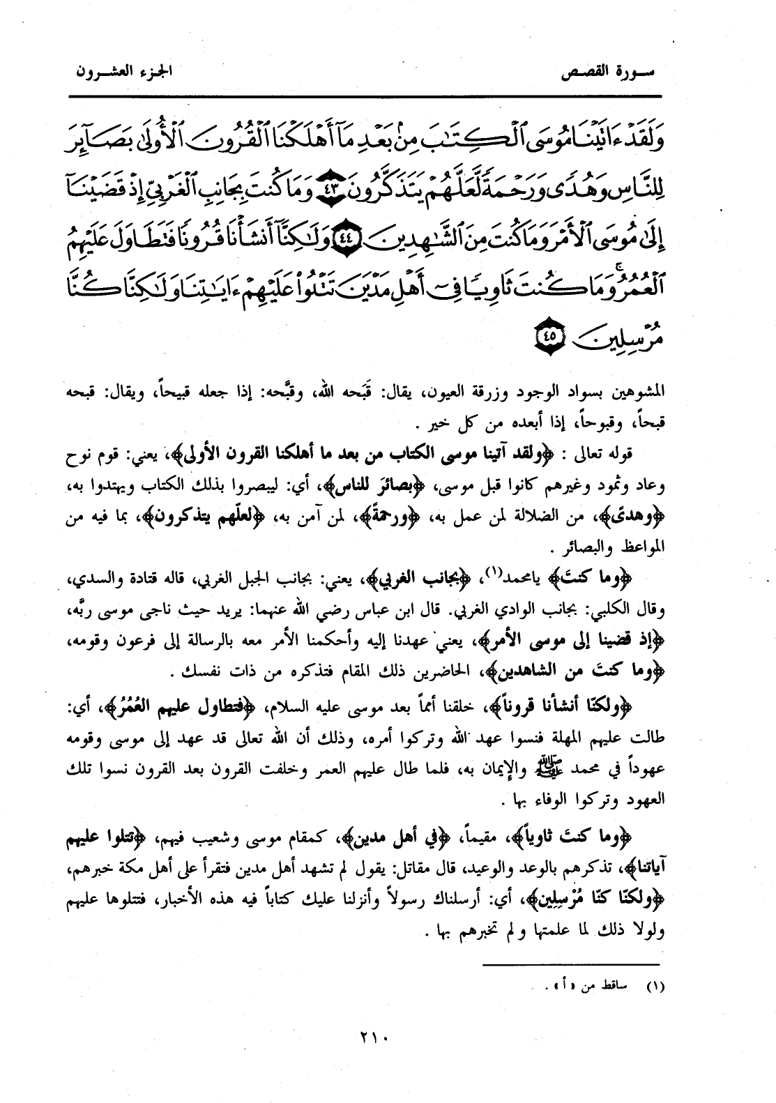 {وَمَا كُنْتَ بِجَانِبِ الْغَرْبِيِّ إِذْ قَضَيْنَا إِلَى مُوسَى الْأَمْرَ وَمَا كُنْتَ مِنَ الشَّاهِدِينَ (44) وَلَكِنَّا أَنْشَأْنَا قُرُونًا فَتَطَاوَلَ عَلَيْهِمُ الْعُمُرُ وَمَا كُنْتَ ثَاوِيًا فِي أَهْلِ مَدْيَنَ تَتْلُو عَلَيْهِمْ آيَاتِنَا وَلَكِنَّا كُنَّا مُرْسِلِينَ (45) }