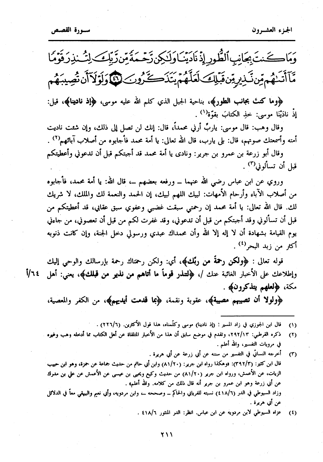 {وَمَا كُنْتَ بِجَانِبِ الطُّورِ} بِنَاحِيَةِ الْجَبَلِ الَّذِي كَلَّمَ اللَّهُ عَلَيْهِ مُوسَى، {إِذْ نَادَيْنَا} قِيلَ: إِذْ نَادَيْنَا مُوسَى: خُذِ الْكِتَابَ بِقُوَّةٍ (1) . وَقَالَ وَهْبٌ: قَالَ مُوسَى: يَا رَبِّ أَرِنِي مُحَمَّدًا، قَالَ: إِنَّكَ لَنْ تَصِلَ إِلَى ذَلِكَ، وَإِنْ شِئْتَ نَادَيْتُ أُمَّتَهُ وَأَسْمَعْتُكَ صَوْتَهُمْ، قَالَ: بَلَى يَا رَبِّ، قَالَ اللَّهُ تَعَالَى: يَا أُمَّةَ مُحَمَّدٍ فَأَجَابُوهُ مِنْ أَصْلَابِ آبَائِهِمْ (2) وَقَالَ أَبُو زُرْعَةَ بْنُ عَمْرِو بْنِ جَرِيرٍ: وَنَادَى يَا أُمَّةَ مُحَمَّدٍ قَدْ أَجَبْتُكُمْ قَبْلَ أَنْ تَدْعُوَنِي وَأَعْطَيْتُكُمْ قَبْلَ أَنْ تَسْأَلُونِي (3) .