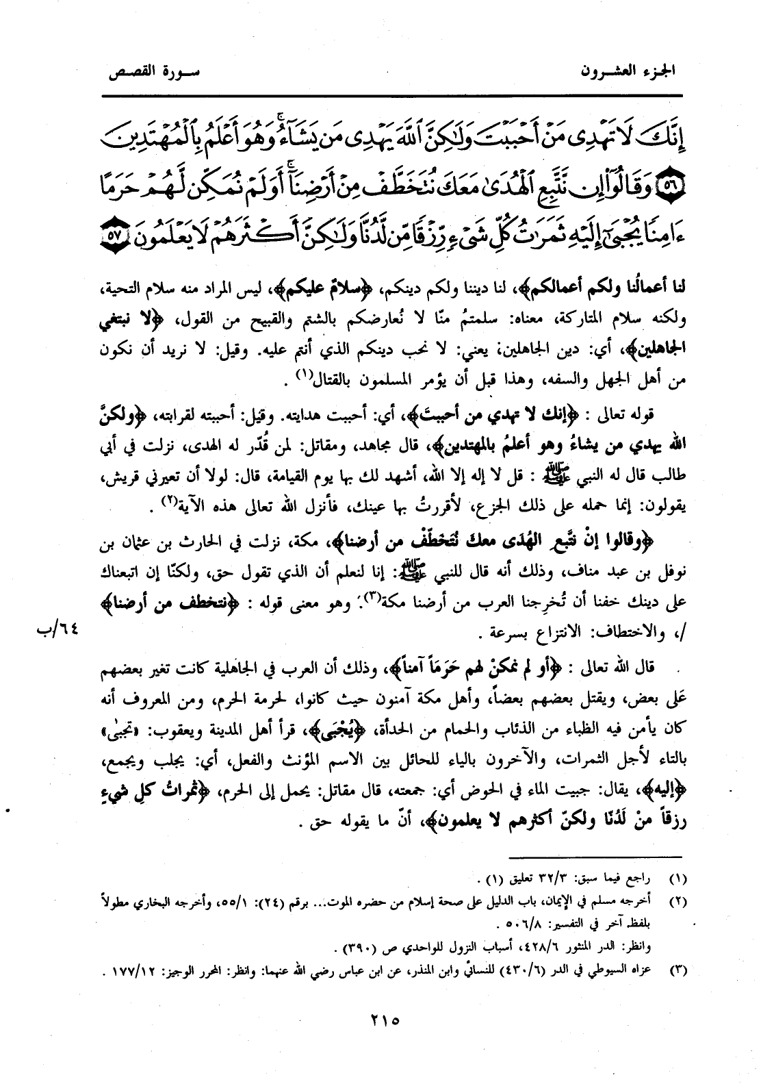 {إِنَّكَ لَا تَهْدِي مَنْ أَحْبَبْتَ وَلَكِنَّ اللَّهَ يَهْدِي مَنْ يَشَاءُ وَهُوَ أَعْلَمُ بِالْمُهْتَدِينَ (56) وَقَالُوا إِنْ نَتَّبِعِ الْهُدَى مَعَكَ نُتَخَطَّفْ مِنْ أَرْضِنَا أَوَلَمْ نُمَكِّنْ لَهُمْ حَرَمًا آمِنًا يُجْبَى إِلَيْهِ ثَمَرَاتُ كُلِّ شَيْءٍ رِزْقًا مِنْ لَدُنَّا وَلَكِنَّ أَكْثَرَهُمْ لَا يَعْلَمُونَ (57) }