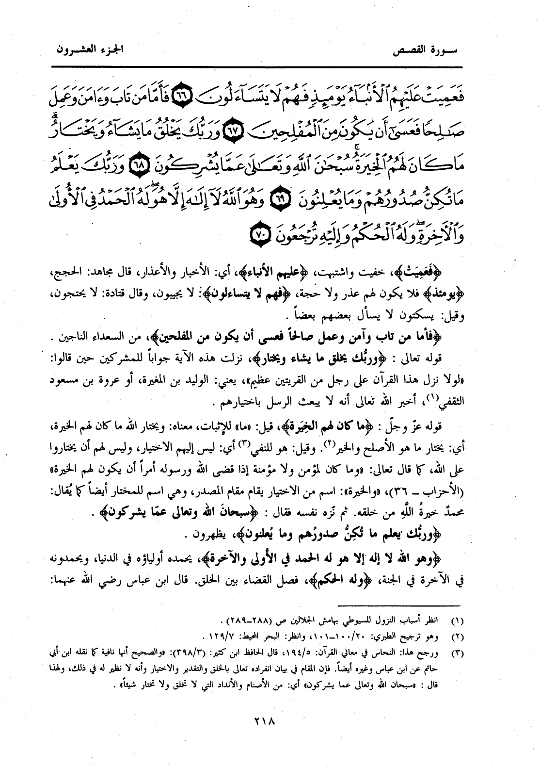 (3) ورجح هذا: النحاس في معاني القرآن: 5 / 194، قال الحافظ ابن كثير: (3 / 398) : "والصحيح أنها نافية كما نقله ابن أبي حاتم عن ابن عباس وغيره أيضا. فإن المقام في بيان انفراده تعالى بالخلق والتقدير والاختيار وأنه لا نظير له في ذلك، ولهذا قال: "سبحان الله وتعالى عما يشركون" أي: من الأصنام والأنداد التي لا تخلق ولا تختار شيئا".