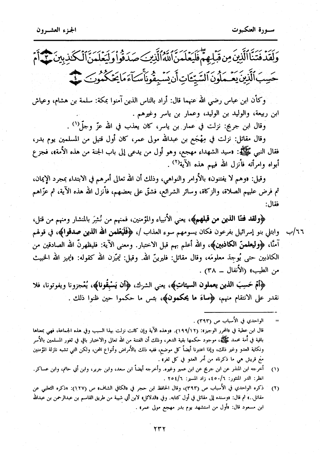 وَكَانَ ابْنُ عَبَّاسٍ رَضِيَ اللَّهُ عَنْهُمَا قَالَ: أَرَادَ بِالنَّاسِ الَّذِينَ آمَنُوا بِمَكَّةَ: سَلَمَةَ بْنَ هِشَامٍ، وَعَيَّاشَ بْنَ رَبِيعَةَ، وَالْوَلِيدَ بْنَ الْوَلِيدِ وَعَمَّارَ بْنَ يَاسِرٍ وَغَيْرَهُمْ. وَقَالَ ابْنُ جُرَيْجٍ: نَزَلَتْ فِي عَمَّارِ بْنِ يَاسِرٍ، كَانَ يُعَذَّبُ فِي اللَّهِ عَزَّ وَجَلَّ (1) . وَقَالَ مُقَاتِلٌ: نَزَلَتْ فِي مِهْجَعِ بْنِ عَبْدِ اللَّهِ مَوْلَى عُمَرَ، كَانَ أَوَّلَ قَتِيلٍ مِنَ الْمُسْلِمِينَ يَوْمَ بَدْرٍ، فَقَالَ النَّبِيُّ صَلَّى اللَّهُ عَلَيْهِ وَسَلَّمَ: "سَيِّدُ الشُّهَدَاءِ مِهْجَعٌ، وَهُوَ أَوَّلُ مَنْ يُدْعَى إِلَى بَابِ الْجَنَّةِ مِنْ هَذِهِ الْأُمَّةِ"، فَجَزِعَ أَبَوَاهُ وَامْرَأَتُهُ فَأَنْزَلَ اللَّهُ فِيهِمْ هَذِهِ الْآيَةَ (2) . وَقِيلَ: "وَهُمْ لَا يُفْتَنُونَ" بِالْأَوَامِرِ وَالنَّوَاهِي، وَذَلِكَ أَنَّ اللَّهَ تَعَالَى أَمَرَهُمْ فِي الِابْتِدَاءِ بِمُجَرَّدِ الْإِيمَانِ، ثُمَّ فَرَضَ عَلَيْهِمُ الصَّلَاةَ، وَالزَّكَاةَ، وَسَائِرَ الشَّرَائِعِ، فَشَقَّ عَلَى بَعْضِهِمْ، فَأَنْزَلَ اللَّهُ هَذِهِ الْآيَةَ، ثُمَّ عَزَّاهُمْ فَقَالَ: {وَلَقَدْ فَتَنَّا الَّذِينَ مِنْ قَبْلِهِمْ}