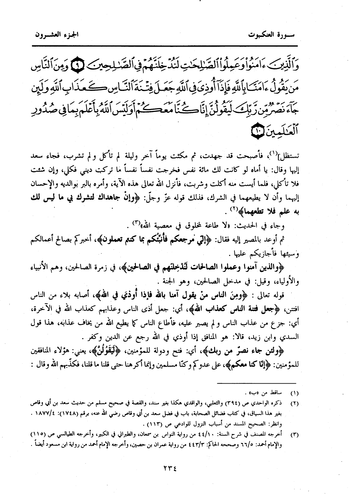 تَسْتَظِلَّ] (1) ، فَأَصْبَحَتْ قَدْ جَهَدَتْ، ثُمَّ مَكَثَتْ يَوْمًا آخَرَ لَمْ تَأْكُلْ وَلَمْ تَشْرَبْ، فَجَاءَ سَعْدٌ إِلَيْهَا وَقَالَ: يَا أُمَّاهُ لَوْ كَانَتْ لَكِ مِائَةُ نَفْسٍ فَخَرَجَتْ نَفْسًا نَفْسًا مَا تَرَكْتُ دِينِي فَكُلِي، وَإِنْ شِئْتِ فَلَا تَأْكُلِي، فَلَمَّا أَيِسَتْ مِنْهُ أَكَلَتْ وَشَرِبَتْ، فَأَنْزَلَ اللَّهُ تَعَالَى هَذِهِ الْآيَةَ، وَأَمَرَهُ بِالْبِرِّ بِوَالِدَيْهِ وَالْإِحْسَانِ إِلَيْهِمَا وَأَنْ لَا يُطِيعُهُمَا فِي الشِّرْكِ، فَذَلِكَ قَوْلُهُ عَزَّ وَجَلَّ: {وَإِنْ جَاهَدَاكَ لِتُشْرِكَ بِي مَا لَيْسَ لَكَ بِهِ عِلْمٌ فَلَا تُطِعْهُمَا} (2) . وَجَاءَ فِي الْحَدِيثِ: "لَا طَاعَةَ لِمَخْلُوقٍ فِي مَعْصِيَةِ اللَّهِ" (3) . ثُمَّ أَوْعَدَ بِالْمَصِيرِ إِلَيْهِ فَقَالَ: {إِلَيَّ مَرْجِعُكُمْ فَأُنَبِّئُكُمْ بِمَا كُنْتُمْ تَعْمَلُونَ} أُخْبِرُكُمْ بِصَالِحِ أَعْمَالِكُمْ وَسَيِّئِهَا فَأُجَازِيكُمْ عَلَيْهَا.