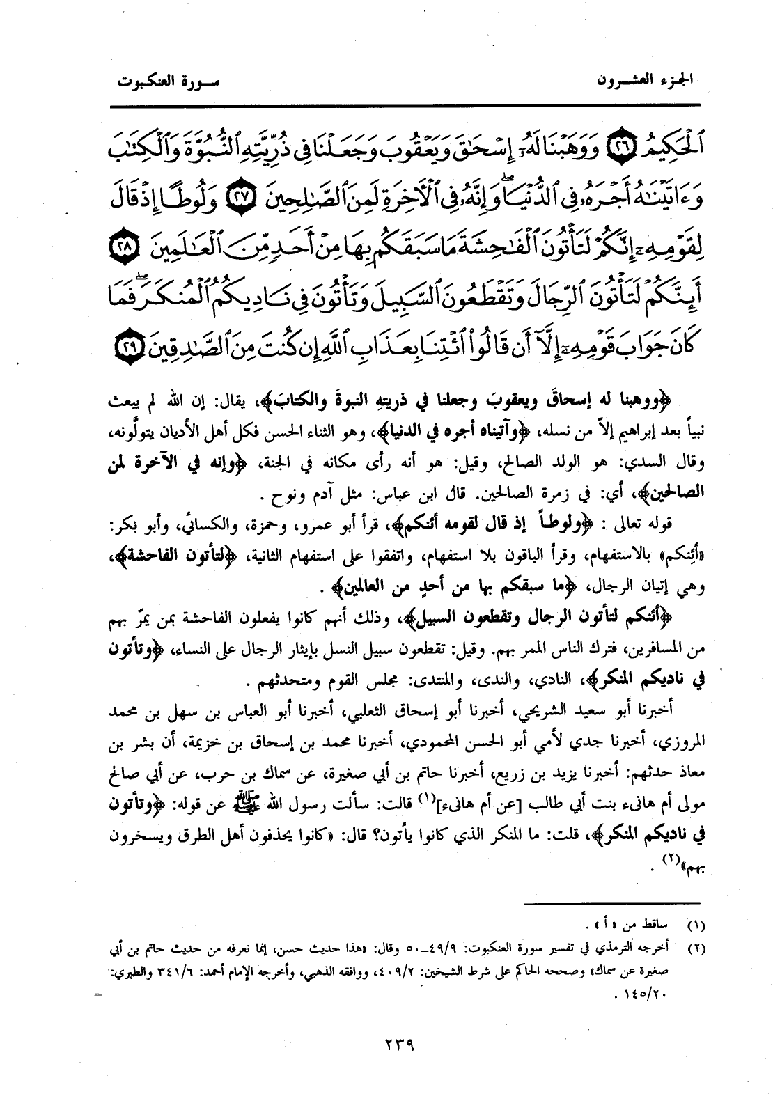 {أَئِنَّكُمْ لَتَأْتُونَ الرِّجَالَ وَتَقْطَعُونَ السَّبِيلَ} وَذَلِكَ أَنَّهُمْ كَانُوا يَفْعَلُونَ الْفَاحِشَةَ بِمَنْ يَمُرُّ بِهِمْ مِنَ الْمُسَافِرِينَ، فَتَرَكَ النَّاسُ الْمَمَرَّ بِهِمْ. وَقِيلَ: تَقْطَعُونَ سَبِيلَ النَّسْلِ بِإِيثَارِ الرِّجَالِ عَلَى النِّسَاءِ، {وَتَأْتُونَ فِي نَادِيكُمُ الْمُنْكَرَ} النَّادِي، وَالنَّدَى، وَالْمُنْتَدَى: مَجْلِسُ الْقَوْمِ وَمُتَحَدَّثُهُمْ. أَخْبَرَنَا أَبُو سَعِيدٍ الشُّرَيْحِيُّ، أَخْبَرَنَا أَبُو إِسْحَاقَ الثَّعْلَبِيُّ، أَخْبَرَنَا أَبُو الْعَبَّاسِ بْنُ سَهْلِ بْنِ مُحَمَّدٍ الْمَرْوَزِيُّ، أَخْبَرَنَا جَدِّي لِأُمِّي أَبُو الْحَسَنِ الْمَحْمُودِيُّ، أَخْبَرَنَا مُحَمَّدُ بْنُ إِسْحَاقَ بْنِ خُزَيْمَةَ، أَنَّ بِشْرَ بْنَ مُعَاذٍ حَدَّثَهُمْ: أَخْبَرَنَا يَزِيدُ بْنُ زُرَيْعٍ، أَخْبَرَنَا حَاتِمُ بْنُ أَبِي صَغِيرَةَ، عَنْ سِمَاكِ بْنِ حَرْبٍ، عَنْ أَبِي صَالِحٍ مَوْلَى أَمِّ هَانِئٍ بِنْتِ أَبِي طَالِبٍ [عَنْ أُمِّ هَانِئٍ] (1) قَالَتْ: سَأَلْتُ رَسُولَ اللَّهِ صَلَّى اللَّهُ عَلَيْهِ وَسَلَّمَ عَنْ قَوْلِهِ: {وَتَأْتُونَ فِي نَادِيكُمُ الْمُنْكَرَ} قُلْتُ: مَا الْمُنْكَرُ الَّذِي كَانُوا يَأْتُونَهُ؟ قَالَ: "كَانُوا يَحْذِفُونَ أَهْلَ الطُّرُقِ وَيَسْخَرُونَ بِهِمْ" (2) .