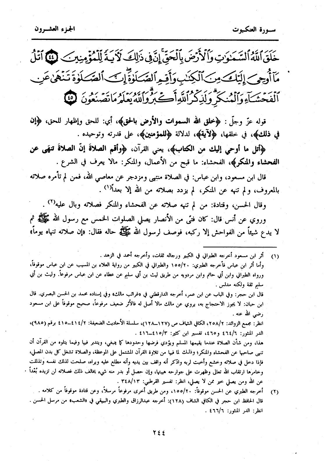 {خَلَقَ اللَّهُ السَّمَوَاتِ وَالْأَرْضَ بِالْحَقِّ إِنَّ فِي ذَلِكَ لَآيَةً لِلْمُؤْمِنِينَ (44) اتْلُ مَا أُوحِيَ إِلَيْكَ مِنَ الْكِتَابِ وَأَقِمِ الصَّلَاةَ إِنَّ الصَّلَاةَ تَنْهَى عَنِ الْفَحْشَاءِ وَالْمُنْكَرِ وَلَذِكْرُ اللَّهِ أَكْبَرُ وَاللَّهُ يَعْلَمُ مَا تَصْنَعُونَ (45) }