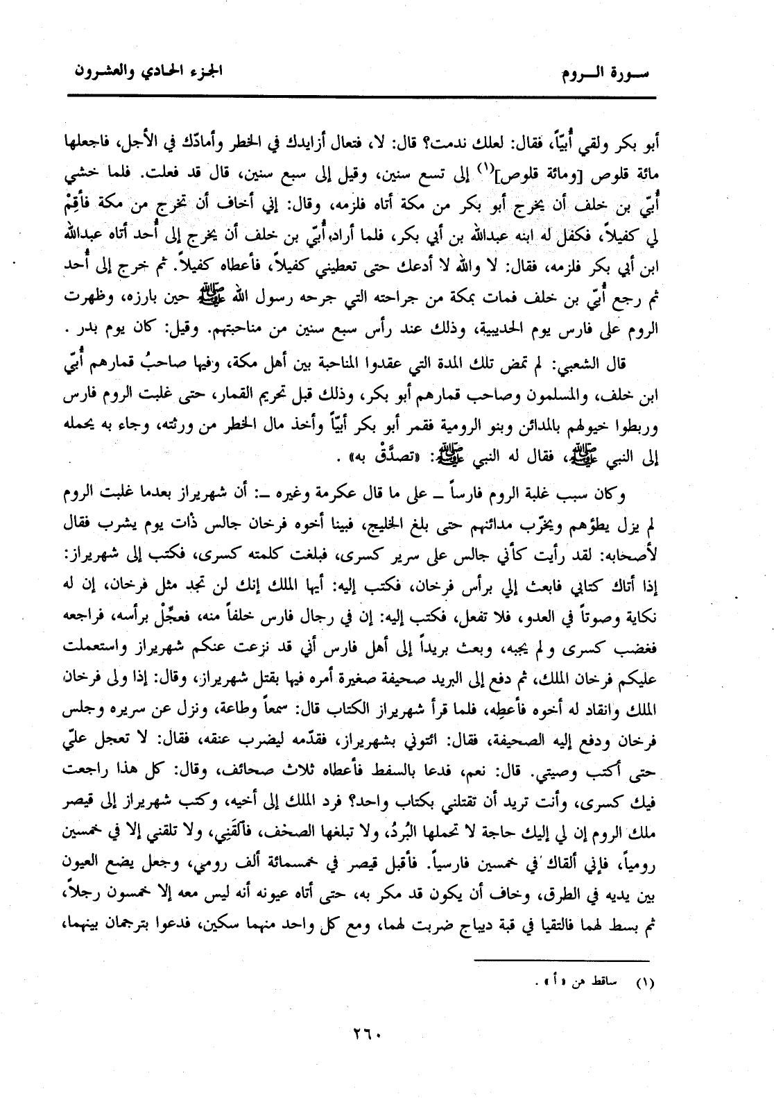 أَبُو بَكْرٍ وَلَقِيَ أُبَيًّا، فَقَالَ: لَعَلَّكَ نَدِمْتَ؟ قَالَ: لَا فَتَعَالَ أُزَايِدُكَ فِي الْخَطَرِ وَأُمَادُّكَ فِي الْأَجَلِ، فَاجْعَلْهَا مِائَةَ قَلُوصٍ [وَمِائَةُ قَلُوصٍ] (1) إِلَى تِسْعِ سِنِينَ، وَقِيلَ إِلَى سَبْعِ سِنِينَ، قَالَ قَدْ فَعَلْتُ: فَلَمَّا خَشِيَ أُبَيُّ بْنُ خَلَفٍ أَنْ يَخْرُجَ أَبُو بَكْرٍ مِنْ مَكَّةَ أَتَاهُ فَلَزِمَهُ، وَقَالَ: إِنِّي أَخَافُ أَنْ تَخْرُجَ مِنْ مَكَّةَ فَأَقِمْ لِي كَفِيلًا فَكَفَلَ لَهُ ابْنَهُ عَبْدَ اللَّهِ بْنَ أَبِي بَكْرٍ، فَلَمَّا أَرَادَ أُبَيُّ بْنُ خَلَفٍ أَنْ يخرج إلى حد أَتَاهُ عَبْدُ اللَّهِ بْنُ أَبِي بَكْرٍ فَلَزِمَهُ، فَقَالَ: لَا وَاللَّهِ لَا أَدَعُكَ حَتَّى تُعْطِيَنِي كَفِيلًا فَأَعْطَاهُ كَفِيلًا. ثُمَّ خَرَجَ إِلَى أُحُدٍ ثُمَّ رَجَعَ أُبَيُّ بْنُ خَلَفٍ فَمَاتَ بِمَكَّةَ مِنْ جِرَاحَتِهِ الَّتِي جَرَحَهُ رَسُولُ اللَّهِ صَلَّى اللَّهُ عَلَيْهِ وَسَلَّمَ حِينَ بَارَزَهُ، وَظَهَرَتِ الرُّومُ عَلَى فَارِسَ يَوْمَ الْحُدَيْبِيَةِ، وَذَلِكَ عِنْدَ رَأْسِ سَبْعِ سِنِينَ مِنْ مُنَاحَبَتِهِمْ. وَقِيلَ: كَانَ يَوْمَ بَدْرٍ. قَالَ الشَّعْبِيُّ: لَمْ تَمْضِ تِلْكَ الْمُدَّةُ الَّتِي عَقَدُوا الْمُنَاحَبَةَ بَيْنَ أَهْلِ مَكَّةَ، وَفِيهَا صَاحِبُ، قِمَارِهِمْ أُبَيُّ بْنُ خَلَفٍ، وَالْمُسْلِمُونَ وَصَاحِبُ قِمَارِهِمْ أَبُو بَكْرٍ، وَذَلِكَ قَبْلَ تَحْرِيمِ الْقِمَارِ، حَتَّى غَلَبَتِ الرُّومُ فَارِسَ وَرَبَطُوا خُيُولَهُمْ بِالْمَدَائِنِ وَبَنُو الرُّومِيَّةَ فَقَمِرَ أَبُو بَكْرٍ أُبَيًّا وَأَخَذَ مَالَ الْخَطَرِ مِنْ وَرَثَتِهِ، وَجَاءَ بِهِ يَحْمِلُهُ إِلَى النَّبِيِّ صَلَّى اللَّهُ عَلَيْهِ وَسَلَّمَ، فَقَالَ لَهُ النَّبِيُّ صَلَّى اللَّهُ عَلَيْهِ وَسَلَّمَ: "تَصَدَّقْ بِهِ".