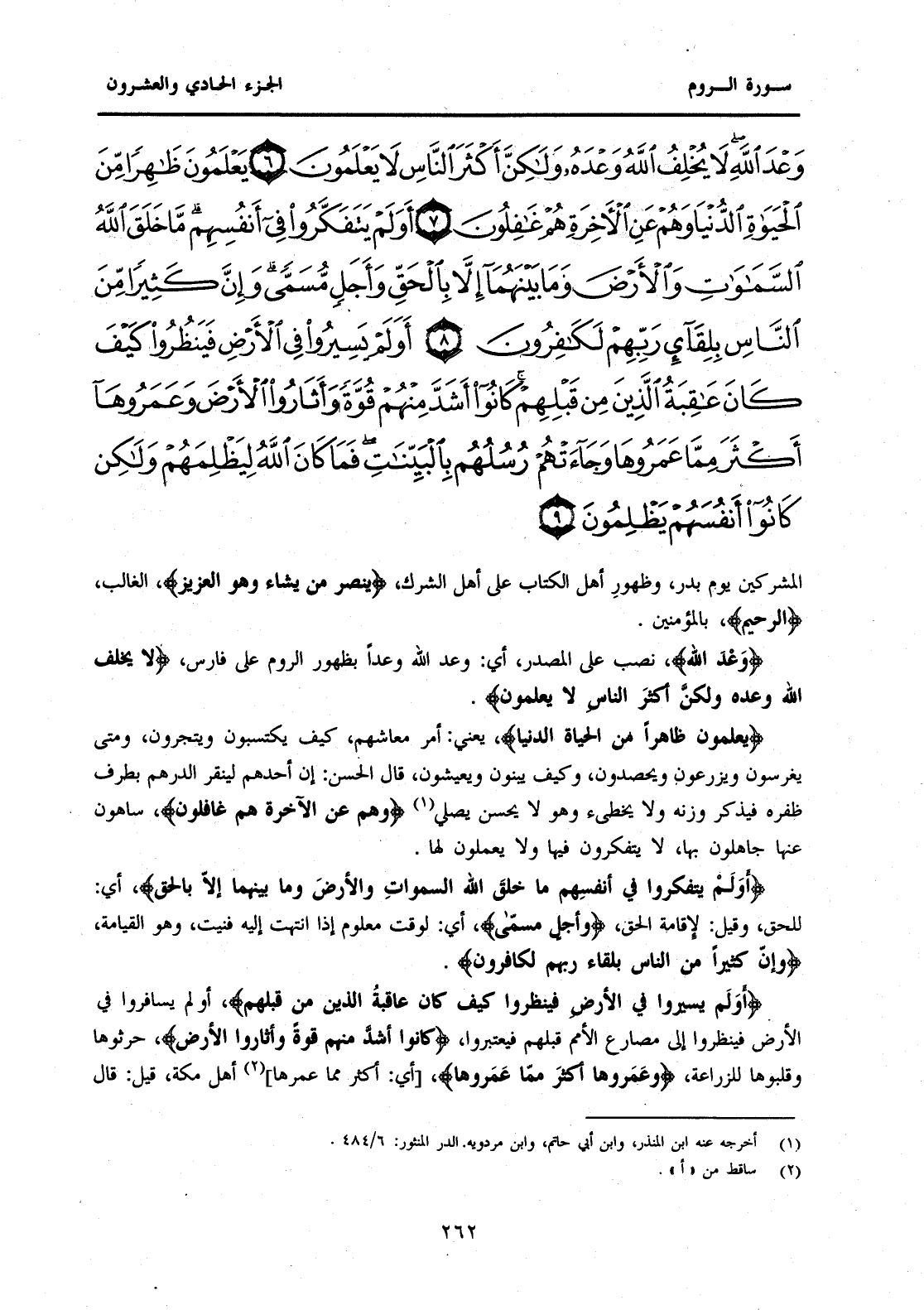 {وَعْدَ اللَّهِ} نُصِبَ عَلَى الْمَصْدَرِ، أَيْ: وَعَدَ اللَّهُ وَعْدًا بِظُهُورِ الرُّومِ عَلَى فَارِسَ، {لَا يُخْلِفُ اللَّهُ وَعْدَهُ وَلَكِنَّ أَكْثَرَ النَّاسِ لَا يَعْلَمُونَ} {يَعْلَمُونَ ظَاهِرًا مِنَ الْحَيَاةِ الدُّنْيَا} يَعْنِي: أَمَرَ مَعَاشِهِمْ، كَيْفَ يَكْتَسِبُونَ وَيَتَّجِرُونَ، وَمَتَى يَغْرِسُونَ وَيَزْرَعُونَ وَيَحْصُدُونَ، وَكَيْفَ يَبْنُونَ وَيَعِيشُونَ، قَالَ الْحَسَنُ: إِنَّ أَحَدَهُمْ لِيَنْقُرُ الدِّرْهَمَ بِطَرَفِ ظُفْرِهِ فَيَذْكُرُ وَزْنَهُ وَلَا يُخْطِئُ وَهُوَ لَا يُحْسِنُ يُصَلِّي (1) {وَهُمْ عَنِ الْآخِرَةِ هُمْ غَافِلُونَ} سَاهُونَ عَنْهَا جَاهِلُونَ بِهَا، لَا يَتَفَكَّرُونَ فِيهَا وَلَا يَعْمَلُونَ لَهَا. {أَوَلَمْ يَتَفَكَّرُوا فِي أَنْفُسِهِمْ مَا خَلَقَ اللَّهُ السَّمَوَاتِ وَالْأَرْضَ وَمَا بَيْنَهُمَا إِلَّا بِالْحَقِّ} أَيْ: لِلْحَقِّ، وَقِيلَ: لِإِقَامَةِ الْحَقِّ، {وَأَجَلٍ مُسَمًّى} أَيْ: لوقت معلوم إذ انْتَهَتْ إِلَيْهِ فَنِيَتْ، وَهُوَ الْقِيَامَةُ، {وَإِنَّ كَثِيرًا مِنَ النَّاسِ بِلِقَاءِ رَبِّهِمْ لَكَافِرُونَ} {أَوَلَمْ يَسِيرُوا فِي الْأَرْضِ فَيَنْظُرُوا كَيْفَ كَانَ عَاقِبَةُ الَّذِينَ مِنْ قَبْلِهِمْ} أَوَلَمَ يُسَافِرُوا فِي الْأَرْضِ فَيَنْظُرُوا إِلَى مَصَارِعِ الْأُمَمِ قَبْلَهُمْ فَيَعْتَبِرُوا {كَانُوا أَشَدَّ مِنْهُمْ قُوَّةً وَأَثَارُوا الْأَرْضَ} حَرَثُوهَا وَقَلَّبُوهَا لِلزِّرَاعَةِ، {وَعَمَرُوهَا أَكْثَرَ مِمَّا عَمَرُوهَا} [أَيْ: أَكْثَرَ مِمَّا عَمَرَهَا] (2) أَهْلُ مَكَّةَ، قِيلَ: قَالَ
