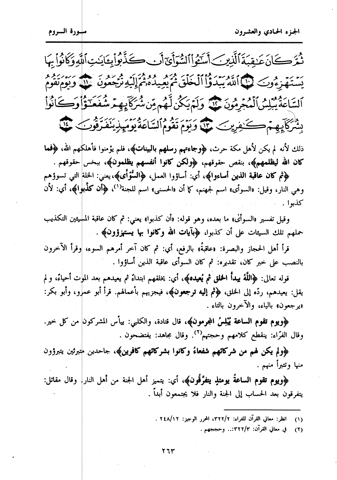{ثُمَّ كَانَ عَاقِبَةَ الَّذِينَ أَسَاءُوا} أَيْ: أَسَاؤُوا الْعَمَلَ، {السُّوْأَى} يَعْنِي: الْخَلَّةَ الَّتِي تَسُوؤُهُمْ وَهِيَ النَّارُ، وَقِيلَ: "السُّوأَى" اسْمٌ لِجَهَنَّمَ، كَمَا أَنَّ "الْحُسْنَى" اسْمٌ لِلْجَنَّةِ (1) ، {أَنْ كَذَّبُوا} أَيْ: لِأَنْ كَذَّبُوا. وَقِيلَ تَفْسِيرُ "السُّوأَى" مَا بَعْدَهُ، وَهُوَ قَوْلُهُ: "أَنْ كَذَّبُوا" يَعْنِي: ثُمَّ كَانَ عَاقِبَةَ الْمُسِيئِينَ التَّكْذِيبُ حَمَّلَهُمْ تِلْكَ السَّيِّئَاتِ عَلَى أَنْ كَذَّبُوا، {أَنْ كَذَّبُوا بِآيَاتِ اللَّهِ وَكَانُوا بِهَا يَسْتَهْزِئُونَ} قَرَأَ أَهْلُ الْحِجَازِ وَالْبَصْرَةِ: "عَاقِبَةُ" بِالرَّفْعِ، أَيْ: ثُمَّ كَانَ آخِرُ أَمْرِهِمُ السُّوءَ، وَقَرَأَ الْآخَرُونَ بِالنَّصْبِ عَلَى خَبَرِ كَانَ، تَقْدِيرُهُ: ثُمَّ كَانَ السُّوأَى عَاقِبَةَ الَّذِينَ أَسَاءُوا. قَوْلُهُ تَعَالَى: {اللَّهُ يَبْدَأُ الْخَلْقَ ثُمَّ يُعِيدُهُ} أَيْ: يَخْلُقُهُمُ ابْتِدَاءً ثُمَّ يُعِيدُهُمْ بَعْدَ الْمَوْتِ أَحْيَاءً، وَلَمْ يَقُلْ: يُعِيدُهُمْ، رَدَّهُ إِلَى الْخَلْقِ، {ثُمَّ إِلَيْهِ تُرْجَعُونَ} فَيَجْزِيهِمْ بِأَعْمَالِهِمْ. قَرَأَ أَبُو عَمْرٍو، وَأَبُو بَكْرٍ: "يُرْجَعُونَ" بِالْيَاءِ، وَالْآخَرُونَ بِالتَّاءِ. {وَيَوْمَ تَقُومُ السَّاعَةُ يُبْلِسُ الْمُجْرِمُونَ} قَالَ قَتَادَةُ، وَالْكَلْبِيُّ: يَيْأَسُ الْمُشْرِكُونَ مِنْ كُلِّ خَيْرٍ. وَقَالَ الْفَرَّاءُ: يَنْقَطِعُ كَلَامُهُمْ وَحَجَّتُهُمْ (2) . وَقَالَ مُجَاهِدٌ: يَفْتَضِحُونَ. {وَلَمْ يَكُنْ لَهُمْ مِنْ شُرَكَائِهِمْ شُفَعَاءُ وَكَانُوا بِشُرَكَائِهِمْ كَافِرِينَ} جَاحِدِينَ مُتَبَرِّئِينَ يَتَبَرَّءُونَ مِنْهَا وَتَتَبَرَّأُ مِنْهُمْ. {وَيَوْمَ تَقُومُ السَّاعَةُ يَوْمَئِذٍ يَتَفَرَّقُونَ} أَيْ: يَتَمَيَّزُ أَهْلُ الْجَنَّةِ مِنْ أَهْلِ النَّارِ. وَقَالَ مُقَاتِلٌ: يَتَفَرَّقُونَ بَعْدَ الْحِسَابِ إِلَى الْجَنَّةِ وَالنَّارِ فَلَا يَجْتَمِعُونَ أَبَدًا.