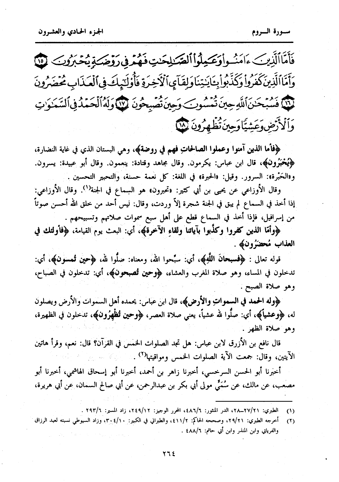 {فَأَمَّا الَّذِينَ آمَنُوا وَعَمِلُوا الصَّالِحَاتِ فَهُمْ فِي رَوْضَةٍ} وَهِيَ الْبُسْتَانُ الَّذِي فِي غَايَةِ النَّضَارَةِ، {يُحْبَرُونَ} قَالَ ابْنُ عَبَّاسٍ: يُكْرَمُونَ. وَقَالَ مُجَاهِدٌ وَقَتَادَةُ: يُنَعَّمُونَ. وَقَالَ أَبُو عُبَيْدَةَ: يُسَرُّونَ. وَ"الْحَبْرَةُ": السُّرُورُ. وَقِيلَ: "الْحَبْرَةُ" فِي اللُّغَةِ: كُلُّ نِعْمَةٍ حَسَنَةٍ، وَالتَّحْبِيرُ التَّحْسِينُ. وَقَالَ الْأَوْزَاعِيُّ عَنْ يَحْيَى بْنِ أَبِي كَثِيرٍ: "تُحْبَرُونَ" هُوَ السَّمَاعُ فِي الْجَنَّةِ (1) . وَقَالَ الْأَوْزَاعِيُّ: إِذَا أَخَذَ فِي السَّمَاعِ لَمْ يَبْقَ فِي الْجَنَّةِ شَجَرَةٌ إِلَّا وَرَدَّتْ، وَقَالَ: لَيْسَ أَحَدٌ مِنْ خَلْقِ اللَّهِ أَحْسَنَ صَوْتًا مِنْ إِسْرَافِيلَ، فَإِذَا أَخَذَ فِي السَّمَاعِ قَطَعَ عَلَى أَهْلِ سَبْعِ سَمَوَاتٍ صَلَاتَهُمْ وَتَسْبِيحَهُمْ. {وَأَمَّا الَّذِينَ كَفَرُوا وَكَذَّبُوا بِآيَاتِنَا وَلِقَاءِ الْآخِرَةِ} أَيْ: الْبَعْثِ يَوْمَ الْقِيَامَةِ، {فَأُولَئِكَ فِي الْعَذَابِ مُحْضَرُونَ} قَوْلُهُ تَعَالَى: {فَسُبْحَانَ اللَّهِ} أَيْ: سَبِّحُوا اللَّهَ، وَمَعْنَاهُ: صَلُّوا لِلَّهِ، {حِينَ تُمْسُونَ} أَيْ: تَدْخُلُونَ فِي الْمَسَاءِ، وَهُوَ صَلَاةُ الْمَغْرِبِ وَالْعِشَاءِ، {وَحِينَ تُصْبِحُونَ} أَيْ: تَدْخُلُونَ فِي الصَّبَاحِ، وَهُوَ صَلَاةُ الصُّبْحِ. {وَلَهُ الْحَمْدُ فِي السَّمَوَاتِ وَالْأَرْضِ} قَالَ ابْنُ عَبَّاسٍ: يحمده أهل السموات وَالْأَرْضِ وَيُصَلُّونَ لَهُ، {وَعَشِيًّا} أَيْ: صَلُّوا لِلَّهِ عَشِيًا، يَعْنِي صَلَاةَ الْعَصْرِ، {وَحِينَ تُظْهِرُونَ} تَدْخُلُونَ فِي الظَّهِيرَةِ، وَهُوَ صَلَاةُ الظُّهْرِ. قَالَ نَافِعُ بْنُ الْأَزْرَقِ لِابْنِ عَبَّاسٍ: هَلْ تَجِدُ الصَّلَوَاتِ الْخَمْسَ فِي الْقُرْآنِ؟ قَالَ: نَعَمْ، وَقَرَأَ هَاتَيْنِ الْآيَتَيْنِ، وَقَالَ: جَمَعَتِ الْآيَةُ الصَّلَوَاتِ الْخَمْسَ وَمَوَاقِيتَهَا (2) . أَخْبَرَنَا أَبُو الْحَسَنِ السَّرَخْسِيُّ، أَخْبَرَنَا زَاهِرُ بْنُ أَحْمَدَ، أَخْبَرَنَا أَبُو إِسْحَاقَ الْهَاشِمِيُّ، أَخْبَرَنَا أَبُو مُصْعَبٍ، عَنْ مَالِكٍ، عَنْ سُمَيٍّ مَوْلَى أَبِي بَكْرِ بْنِ عَبْدِ الرَّحْمَنِ، عَنْ أَبِي صَالِحٍ السَّمَّانِ، عَنْ أَبِي هُرَيْرَةَ،