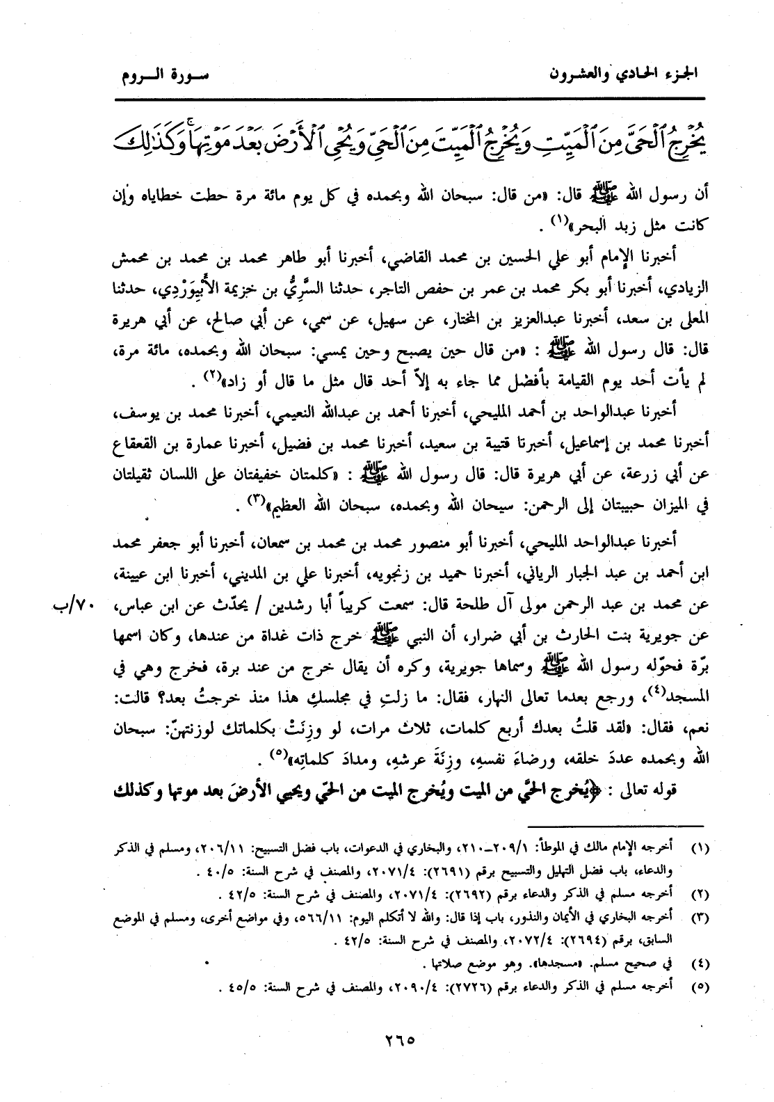 أَخْبَرَنَا عَبْدُ الْوَاحِدِ الْمَلِيحِيُّ، أَخْبَرَنَا أَبُو مَنْصُورٍ مُحَمَّدُ بْنُ مُحَمَّدِ بْنِ سَمْعَانَ، أَخْبَرَنَا أَبُو جَعْفَرٍ مُحَمَّدُ بْنُ أَحْمَدَ بْنِ عَبْدِ الْجَبَّارِ الرَّيَّانِيُّ، أَخْبَرَنَا حُمَيْدُ بْنُ زَنْجَوَيْهِ، أَخْبَرَنَا عَلِيُّ بْنُ الْمَدِينِيِّ، أَخْبَرَنَا ابْنُ عُيَيْنَةَ، عَنْ مُحَمَّدِ بْنِ عَبْدِ الرَّحْمَنِ مَوْلَى آلِ طَلْحَةَ قَالَ: سَمِعَتُ كُرَيْبًا أبا رشدين 70/ب يُحَدِّثُ عَنِ ابْنِ عَبَّاسٍ، عَنْ جُوَيْرِيَةَ بِنْتِ الْحَارِثِ بْنِ أَبِي ضِرَارٍ، أَنَّ النَّبِيَّ صَلَّى اللَّهُ عَلَيْهِ وَسَلَّمَ خَرَجَ ذَاتَ غَدَاةٍ مِنْ عِنْدِهَا، وَكَانَ اسْمُهَا بَرَّةُ فَحَوَّلَهُ رَسُولُ اللَّهِ صَلَّى اللَّهُ عَلَيْهِ وَسَلَّمَ وَسَمَّاهَا جُوَيْرِيَةَ، وَكْرِهَ أَنْ يُقَالَ خَرَجَ مِنْ عِنْدِ بَرَّةَ، فَخَرَجَ وَهِيَ فِي الْمَسْجِدِ (4) ، وَرَجَعَ بَعْدَمَا تَعَالَى النَّهَارُ، فَقَالَ: مَا زِلْتِ فِي مَجْلِسِكِ هَذَا مُنْذُ خَرَجْتُ، بَعْدُ؟ قَالَتْ: نَعَمْ، فَقَالَ: "لَقَدْ قُلْتُ، بَعْدَكِ أَرْبَعَ كَلِمَاتٍ، ثَلَاثَ مَرَّاتٍ، لَوْ وُزِنَتْ بِكَلِمَاتِكِ لَوَزَنَتْهُنَّ: سُبْحَانَ اللَّهِ وَبِحَمْدِهِ عَدَدَ خَلْقِهِ، وَرِضَاءَ نَفْسِهِ، وَزِنَةَ عَرْشِهِ، وَمِدَادَ كَلِمَاتِهِ" (5) .