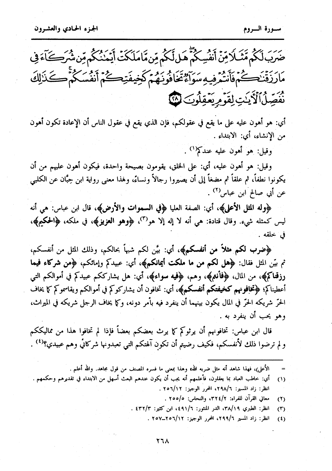 {ضَرَبَ لَكُمْ مَثَلًا مِنْ أَنْفُسِكُمْ} أَيْ: بَيَّنَ لَكُمْ شَبَهًا بِحَالِكُمُ وَذَلِكَ الْمَثَلُ مِنْ أَنْفُسِكُمُ ثُمَّ بَيَّنَ الْمَثَلَ فَقَالَ: {هَلْ لَكُمْ مِنْ مَا مَلَكَتْ أَيْمَانُكُمْ} أَيْ: عَبِيدُكُمْ وَإِمَائِكُمْ، {مِنْ شُرَكَاءَ فِي مَا رَزَقْنَاكُمْ} مِنَ الْمَالِ، {فَأَنْتُمْ} وَهُمْ {فِيهِ سَوَاءٌ} أَيْ: هَلْ يُشَارِكُكُمْ عَبِيدُكُمْ فِي أَمْوَالِكُمُ الَّتِي أَعْطَيْنَاكُمْ؛ {تَخَافُونَهُمْ كَخِيفَتِكُمْ أَنْفُسَكُمْ} أَيْ: تَخَافُونَ أَنْ يُشَارِكُوكُمْ فِي أَمْوَالِكُمْ وَيُقَاسِمُوكُمْ كَمَا يَخَافُ الْحُرُّ شَرِيكَهُ الْحُرَّ فِي الْمَالِ يَكُونُ بَيْنَهُمَا أَنْ يَنْفَرِدَ فِيهِ بِأَمْرٍ دُونَهُ، وَكَمَا يَخَافُ الرَّجُلُ شَرِيكَهُ فِي الْمِيرَاثِ، وَهُوَ يُحِبُّ أَنْ يَنْفَرِدَ بِهِ. قَالَ ابْنُ عَبَّاسٍ: تَخَافُونَهُمْ أَنْ يَرِثُوكُمْ كَمَا يَرِثُ بَعْضُكُمْ بَعْضًا فَإِذَا لَمْ تَخَافُوا هَذَا مِنْ مَالِيكِكُمْ وَلَمْ تَرْضَوْا ذَلِكَ لِأَنْفُسِكُمْ، فَكَيْفَ رَضِيتُمْ أَنْ تَكُونَ آلِهَتُكُمُ الَّتِي تَعْبُدُونَهَا شُرَكَائِي وَهُمْ عَبِيدِي؟ (4) .