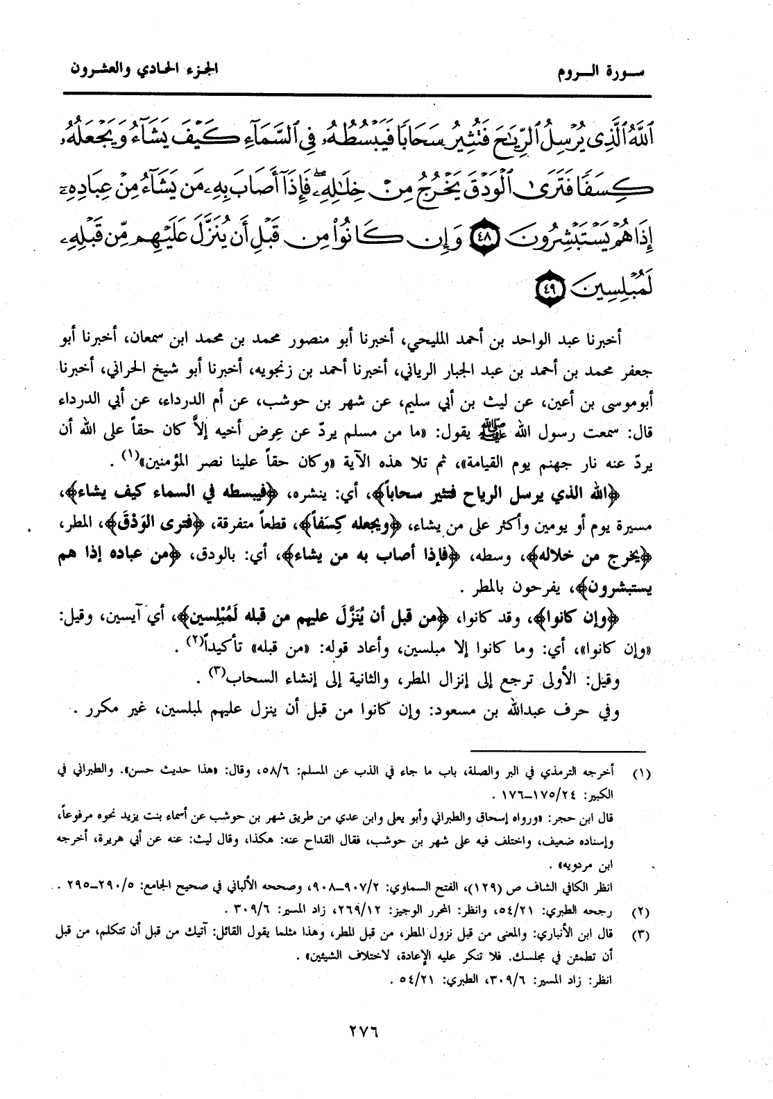 {اللَّهُ الَّذِي يُرْسِلُ الرِّيَاحَ فَتُثِيرُ سَحَابًا} أَيْ: يَنْشُرُهُ، {فَيَبْسُطُهُ فِي السَّمَاءِ كَيْفَ يَشَاءُ} مَسِيرَةَ يَوْمٍ أَوْ يَوْمَيْنِ وَأَكْثَرُ عَلَى مَنْ يَشَاءُ، {وَيَجْعَلُهُ كِسَفًا} قِطَعًا مُتَفَرِّقَةً {فَتَرَى الْوَدْقَ} الْمَطَرَ، {يَخْرُجُ مِنْ خِلَالِهِ} وَسَطِهِ، {فَإِذَا أَصَابَ بِهِ مَنْ يَشَاءُ} أَيْ: بِالْوَدْقِ، {مِنْ عِبَادِهِ إِذَا هُمْ يَسْتَبْشِرُونَ} يَفْرَحُونَ بِالْمَطَرِ. {وَإِنْ كَانُوا} وَقَدْ كَانُوا، {مِنْ قَبْلِ أَنْ يُنَزَّلَ عَلَيْهِمْ مِنْ قَبْلِهِ لَمُبْلِسِينَ} أَيْ آيِسِينَ، وَقِيلَ: "وَإِنْ كَانُوا"، أَيْ: وَمَا كَانُوا إِلَّا مُبْلِسِينَ، وَأَعَادَ قَوْلَهُ: "مِنْ قَبْلِهِ" تَأْكِيدًا (2) . وَقِيلَ: الْأُولَى تَرْجِعُ إِلَى إِنْزَالِ الْمَطَرِ، وَالثَّانِيَةُ إِلَى إِنْشَاءِ السَّحَابِ (3) . وَفِي حَرْفِ عَبْدِ اللَّهِ بْنِ مَسْعُودٍ: وَإِنْ كَانُوا مِنْ قَبْلِ أَنْ يُنَزَّلَ عَلَيْهِمْ لِمُبْلِسِينَ، غَيْرَ مُكَرَّرٍ.